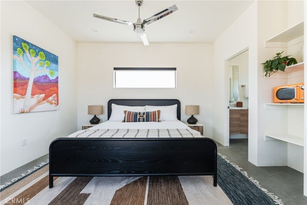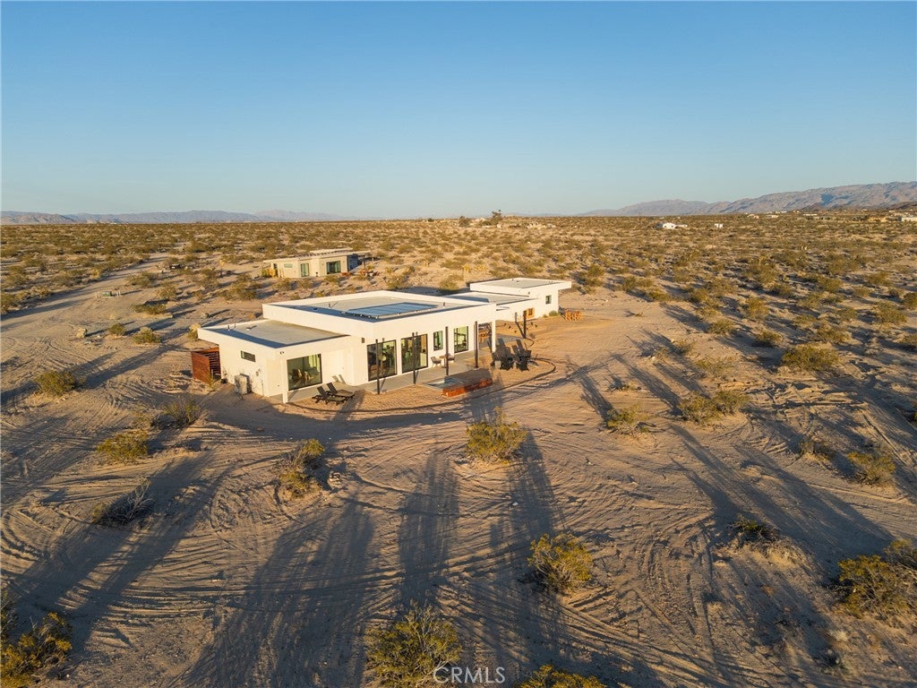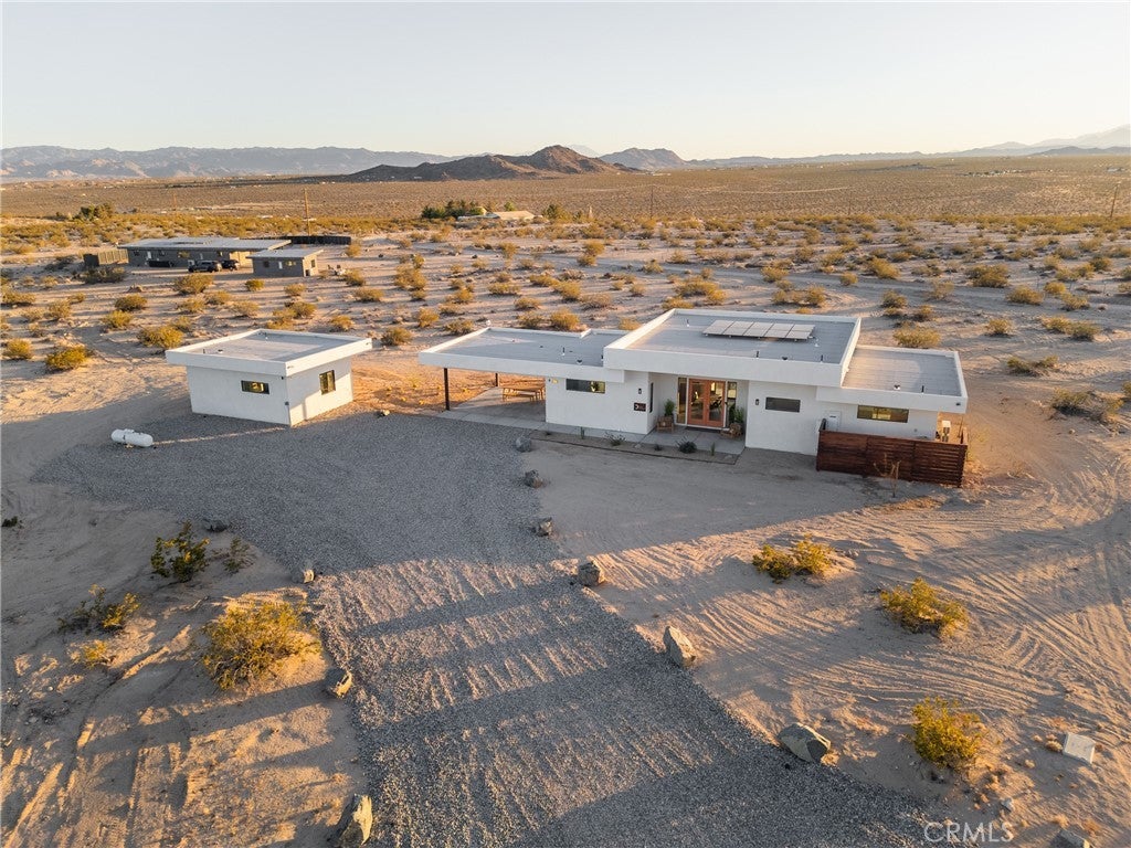 Looking for the perfect Desert Escape? It’s Orion’s Whisper - A 5-star turn-key Airbnb retreat that’s as beautiful as it is profitable. This stunning, modern desert masterpiece spans approximately 1,326 sq ft., with an additional 375 square feet of detached ADU space, all set on 2.5 acres of serene privacy surrounded by sweeping desert views. Perfectly blending luxury living with investment potential, Orion’s Whisper is already a successful operating short-term rental with a Superhost track record and a complete STR package in place - ready for seamless ownership and immediate income! Please note that this property features two spacious primary suites, each with a spa-style bathroom that includes glass-wall showers, modern tiles, brand-new vanities, and modern fixtures. Concrete floors are featured throughout, along with soaring ceilings and a linear zero-clearance fireplace framed by built-in contemporary shelving. The kitchen features new appliances, counters, cupboards, fixtures, and kitchenware, and comes stocked with all the desired kitchen gadgets. The owned solar panels are accompanied by a brand-new solar panel gateway and mini-split A/C systems throughout the property, enhancing energy efficiency in every living space. Designed for the indoor-outdoor lifestyle that defines desert living, this home brings the outside in through large, picturesque windows and clean architectural lines. The Detached ADU/guest house features a complete, stocked kitchen, an en-suite bathroom, a mini-split AC/heat system, and custom double-glass entry doors. Leading you outdoors, the cocktail Pool, which doubles as a hot tub, is perfect for stargazing nights or sunny desert days. In addition to the guaranteed views of the expansive desert landscape, the wrap-around concrete patio tastefully showcases Mt. San Gorgonio and Mt. Nebo! Whether you’re looking for a profitable investment, a private weekend escape, or both, Orion’s Whisper delivers on every front. Located steps from 30 acres of open government land — ideal for hiking and exploring outside of the designated Joshua Tree National Park. Turnkey. Stylish. Profitable. It’s worth seeing for yourself. Experience the serenity, the design, and the income potential that make Orion’s Whisper one of the desert’s most sought-after retreats.