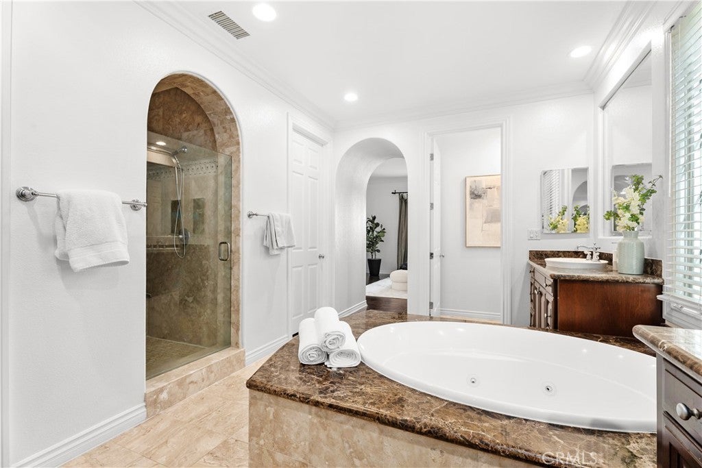 Perched atop the prestigious Quail Hill community, this elegant SINGLE-STORY "Vicara Residence One" showcases refined living on a premium, nearly 8,500 sq ft panoramic-view lot with one of THE BEST city lights and mountain VIEWS in Orange County. With over 3,100 square feet of thoughtfully designed space, this rare home offers four bedrooms, three-and-one-half baths, and a versatile office or den — perfectly blending sophistication, comfort, and style. A private gated entry opens to a beautifully appointed courtyard, complete with designer travertine hardscape, tranquil fountain, and ambient lighting that sets the stage for serene evenings under the stars. Inside, the home exudes warmth and craftsmanship — from the rich wood flooring and formal living room with fireplace and French doors, to soaring 20-foot ceilings that fill the gourmet kitchen and great room with natural light. The chef’s kitchen features an oversized island, custom cabinetry, and seamless flow into the inviting family area — ideal for both everyday living and elegant entertaining. The luxurious primary suite offers a private retreat connected to a spa-inspired bath featuring a soaking tub, large walk-in shower, and dual walk-in closets. Three additional bedrooms, each with access to beautifully finished baths, complete the thoughtfully designed floor plan. A dedicated office or den provides the perfect work-from-home space, and the spacious laundry room adds convenience. Located on a quiet, single-loaded street in the community's most prestigious section, the home enjoys the ideal balance of morning sun and afternoon shade — the perfect complement to its breathtaking views. Residents of Quail Hill enjoy resort-style amenities including five parks, three pools and spas, two fitness centers, tennis and basketball courts, hiking and biking trails, and top-rated Irvine schools, including nationally-acclaimed University High School. With close proximity to upscale shopping, fine dining, and major freeways — 405, 5, and 133 — you’ll have quick access to the coastal beaches, John Wayne Airport, and all that Southern California has to offer. A rare single-story gem in one of Irvine’s most coveted enclaves — this is the view home of your dreams, offering elegance, privacy, and everyday luxury at its finest.