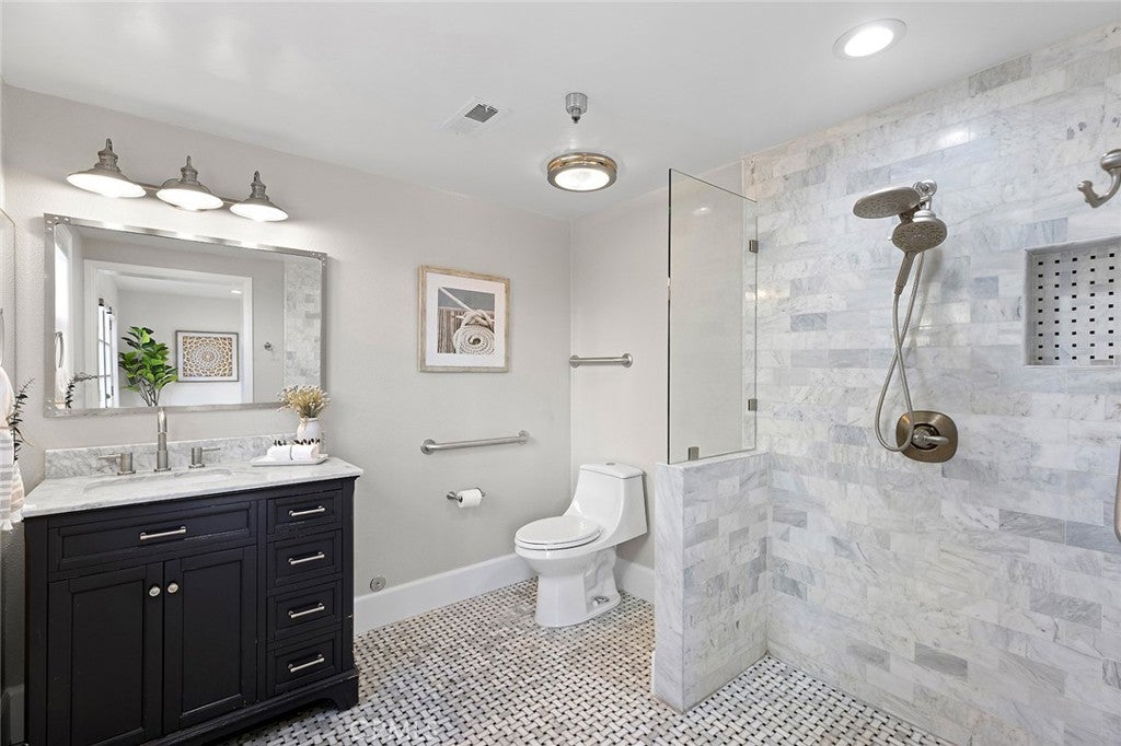 Back on the Market with SIGNIFICANT upgrades. Elevated high in the hills of the prestigious Coast District, this reimagined home captures sweeping ocean views that define San Clemente’s coastal lifestyle—representing one of the best values for an ocean-view home in the area. Set on a wide, flat cul-de-sac the location is exceptional. Crisp curb appeal includes newer exterior paint, a wide brick driveway, and a three-car garage. Inside, a Scandinavian-inspired living room welcomes you with soaring beamed ceilings, a new striking wagon-wheel chandelier, new wide-plank waterproof flooring, and a wall of French doors flooding the space with natural light. At the heart of the home, the kitchen has been transformed with warm-toned shaker cabinetry, sleek quartz countertops and backsplash, designer pendant lighting, a waterfall island with beverage fridge, and a Viking Pro range. The family room centers around a new fireplace featuring fluted porcelain tile framed by black fire glass and opens to a casual breakfast area. Large windows capture ocean views and open to the exterior patio. The formal dining room, outfitted with new cabinetry, countertops, and fixtures, connects easily to both the kitchen and living room for entertaining. Adjacent to the living area, a newly built tile patio offers additional outdoor flexibility—ideal for lounging, recreation, or future customization. Rounding out the main floor is a study, ensuite bedroom with an upgraded bathroom featuring an ADA-compliant shower, an additional powder room, and a custom laundry closet. Upstairs, wide hallways lead to three oversized bedrooms and a spacious bonus room. The primary suite enjoys breathtaking ocean and mountain views, vaulted ceilings with exposed beams, a newly designed embossed porcelain fireplace, and an enclosed sunroom. A large walk-in closet and upgraded bath complete the suite—featuring a marble shower with dual rainfall heads, frameless glass, and a new freestanding soaking tub. Down the hall, two generous bedrooms share an upgraded Jack-and-Jill bath. The large bonus room with beamed ceilings and a full wet bar offers flexibility for a game room, gym, or additional bedrooms. Additional highlights include 41 fully paid solar panels, EV charging, a new vinyl-and-glass privacy fence with gate, and a whole-house water softener + Purifier combo system. A quick drive to the historic downtown, new restaurants, the 2.5-mile beach trail, SC Pier, and San Clemente’s incredible beaches.