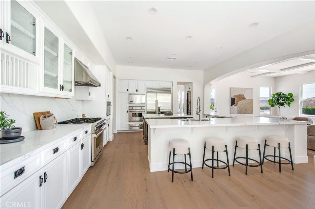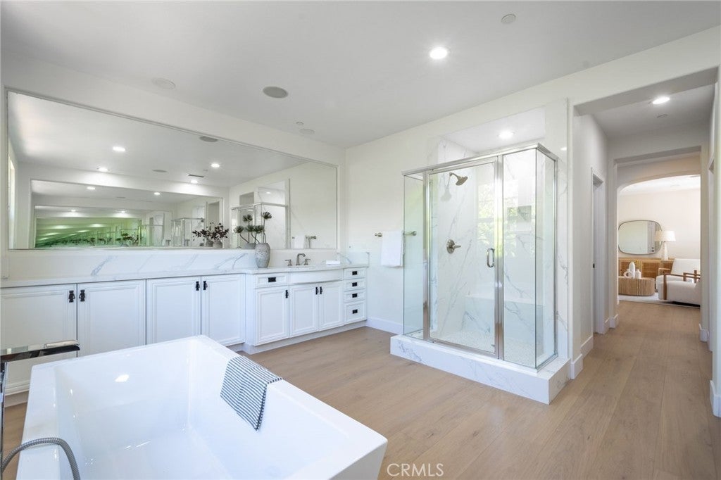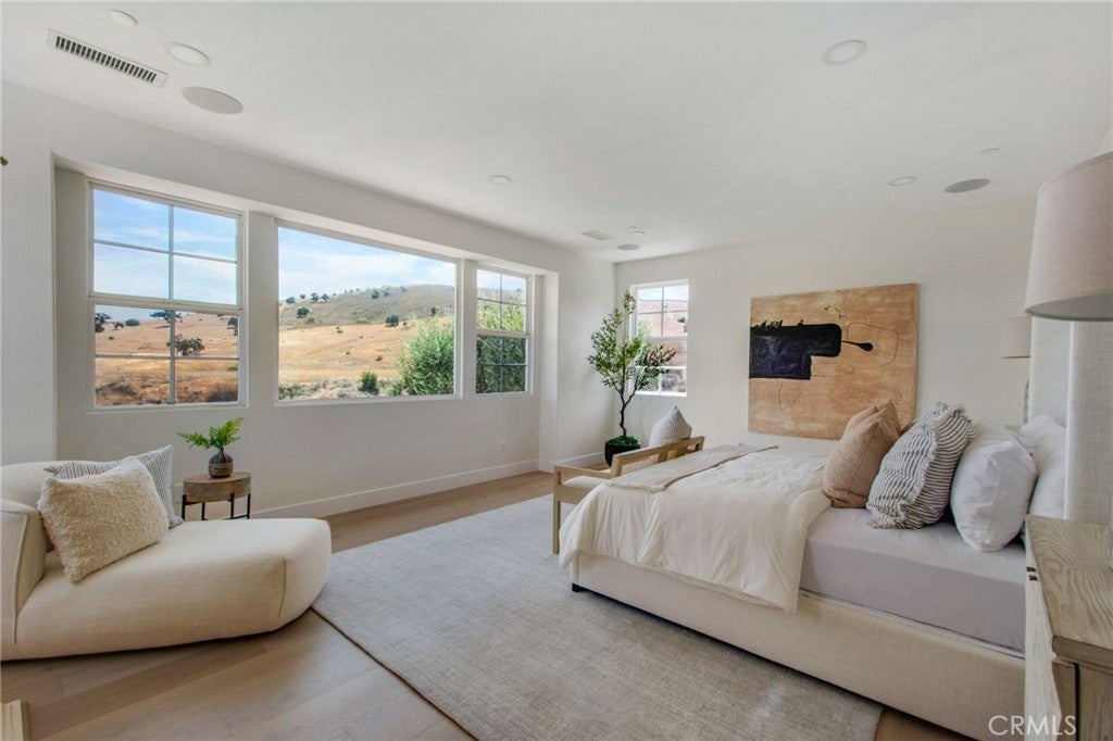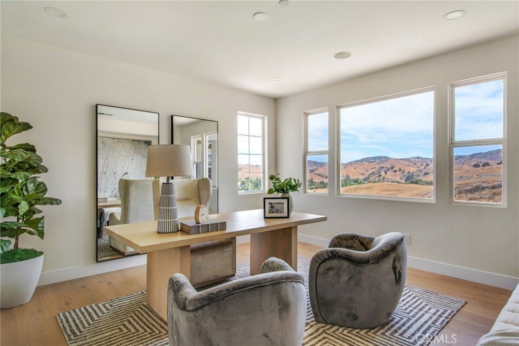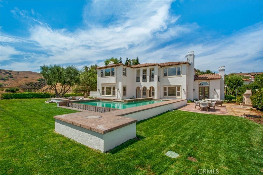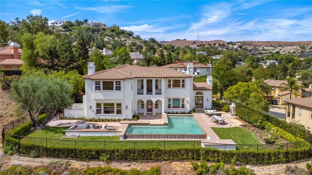Private View Home in Mont Calabasas Estates. Set on over half an acre, this 5-bedroom, 6-bath estate showcases panoramic hillside and mountain views. This beautiful property boasts an impressive array of upgrades and renovations. Recently refreshed with new wood flooring throughout the entire house, fresh interior and exterior paint, new led lighting inside and out, plus updates to the kitchen and baths, the home feels bright, modern, and move-in ready. Architectural appeal – the home offers formal living spaces that connect seamlessly with the informal spaces. Chef’s kitchen offers the best in form and function with quartz countertops, top-of-the-line Viking and Sub-Zero appliances, island breakfast bar, large breakfast room, and walk in pantry – opens to the spacious family room with outdoor access. A main-level en suite guest room provides comfort and convenience. Step outside to an entertainer’s dream backyard featuring a sparkling infinity pool, built-in BBQ, outdoor fireplace, and multiple lounge and dining areas. Upstairs, the primary suite is a private retreat with endless views, a large sitting area, expansive walk-in closet, and spa-style bath. Three additional en-suite bedrooms, a private office, and a versatile upstairs media/family room complete the layout. With garages for four cars, ample parking, and beautiful newly landscaped grounds, this home blends everyday comfort with true resort-style living—just minutes from Malibu beaches, hiking, dining, and award-winning Las Virgenes schools.