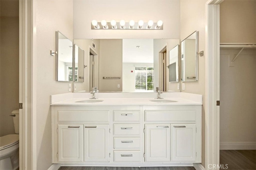 This stunning 1 Bedroom/1.5 Bath Townhome with Direct Access 2-car Garage is in perfect interior tract location overlooking a large grassy greenbelt with easy access to guest parking! Beautiful upgrades include wide plank laminate hardwood flooring throughout (no carpet!!) NEW bright neutral paint, NEW fixtures, beautiful and extended height baseboards! Spacious master suite has a dual sink vanity and walk-in closet! Upgraded stainless steel refrigerator, washer and dryer are included! Enjoy the near by resort style amenities, including a private gym, swimming pools, spas, sports court, and tennis courts!