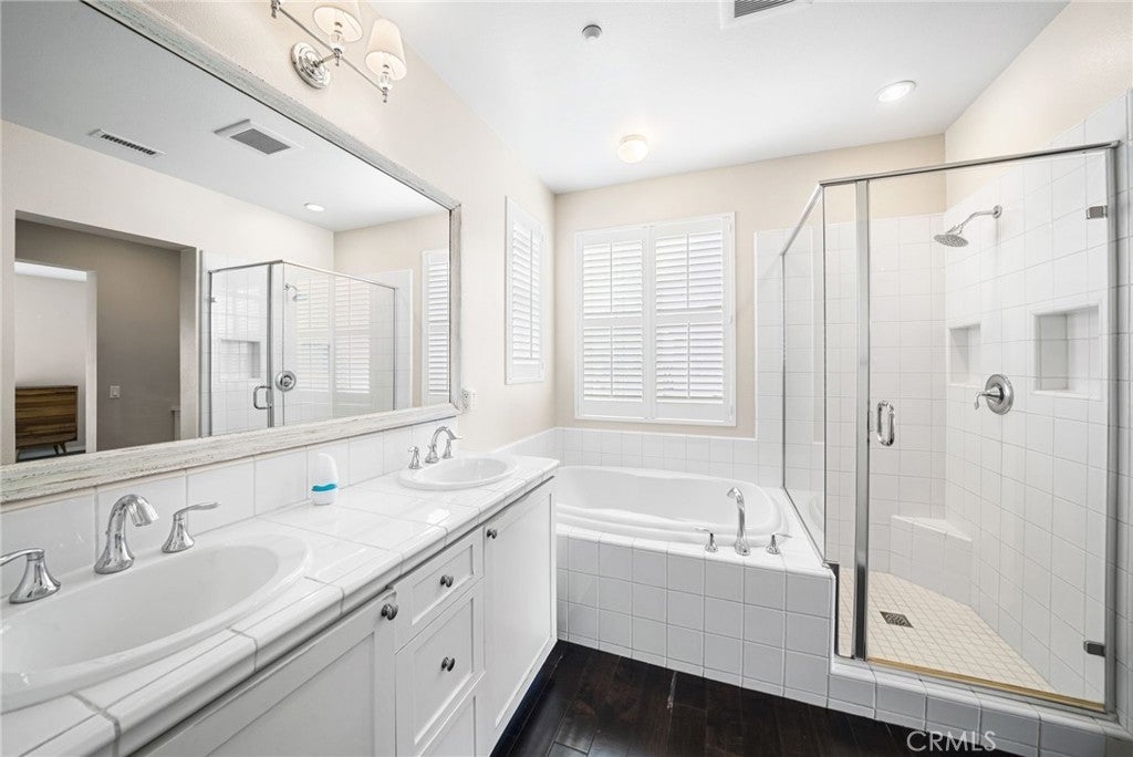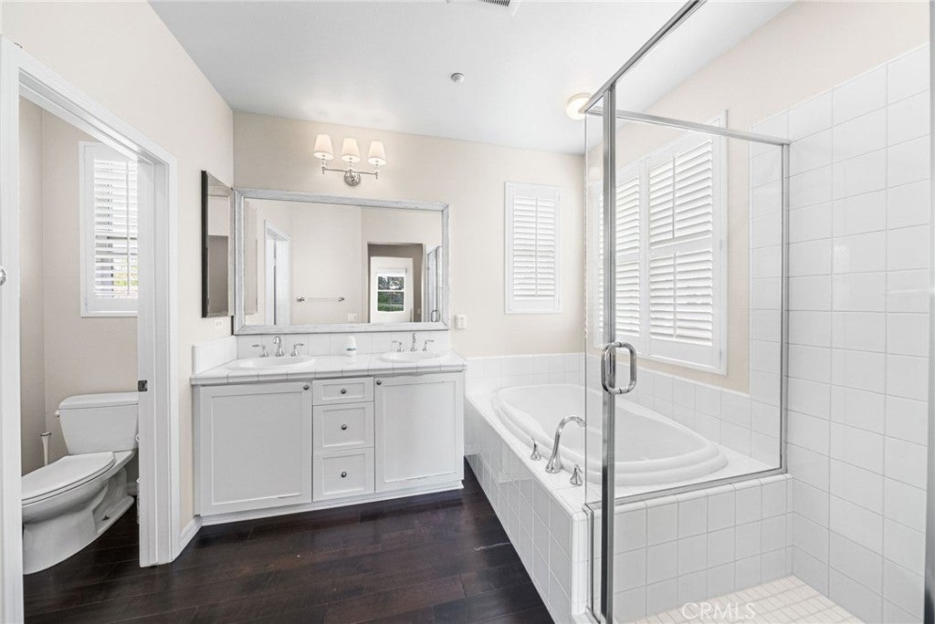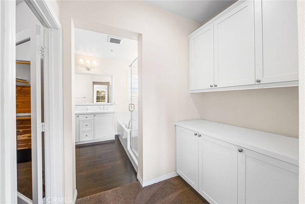 Welcome to this stunning townhome nestled in the highly sought-after Harbor Station neighborhood within the Glenwood community of Aliso Viejo — one of Orange County’s most desirable places to call home! This beautifully upgraded 2-bedroom, 2.5-bathroom residence offers the perfect blend of sophistication, comfort, and modern convenience. Step inside to find a bright and open floor plan with 1,514 sq. ft. of thoughtfully designed living space, highlighted by high ceilings, recessed lighting, rich hardwood floors, and upgraded finishes throughout. The first level features a welcoming foyer that leads to a private bedroom suite with a full bath and direct access to the attached 2-car garage, now equipped with a 240V outlet for EV charging! Upstairs, the main living area showcases a seamless flow between the living room, dining area, and gourmet kitchen—perfect for entertaining or simply relaxing at home. Enjoy designer stone countertops, under cabinet lighting, classic shaker-style cabinetry, stainless steel appliances, and an elegant tile backsplash. The living room has beautiful built-ins along with smart Philips Hue recessed lighting for customizable ambiance. The room also opens to a private balcony overlooking lush greenbelts, creating a tranquil space to unwind or sip your morning coffee. The primary suite on the top floor is a true retreat, featuring scenic treetop views, a spacious walk-in closet, and a spa-inspired bathroom with dual sinks, a soaking tub, and a separate glass-enclosed shower. Major system upgrades add lasting value and peace of mind, including a $28,000 SoCal Airflow Pros HVAC system with new AC unit, condenser, and lineset installation, a new water heater, and $3,000 in electrical enhancements—including newly added recessed lighting and modern wiring in the living room. Enjoy Aliso Viejo’s best lifestyle amenities right outside your door. The Glenwood community is close to multiple pools and a spa, as well as picturesque parks, hiking and biking trails, and family-friendly events year-round. You’re also just minutes from Aliso Viejo Town Center, filled with shopping, dining, and entertainment options, plus easy access to the 73 toll road and nearby beaches. If you’ve been searching for Aliso Viejo real estate that combines modern upgrades, privacy, and location, this home is a true standout. Schedule your private showing today!