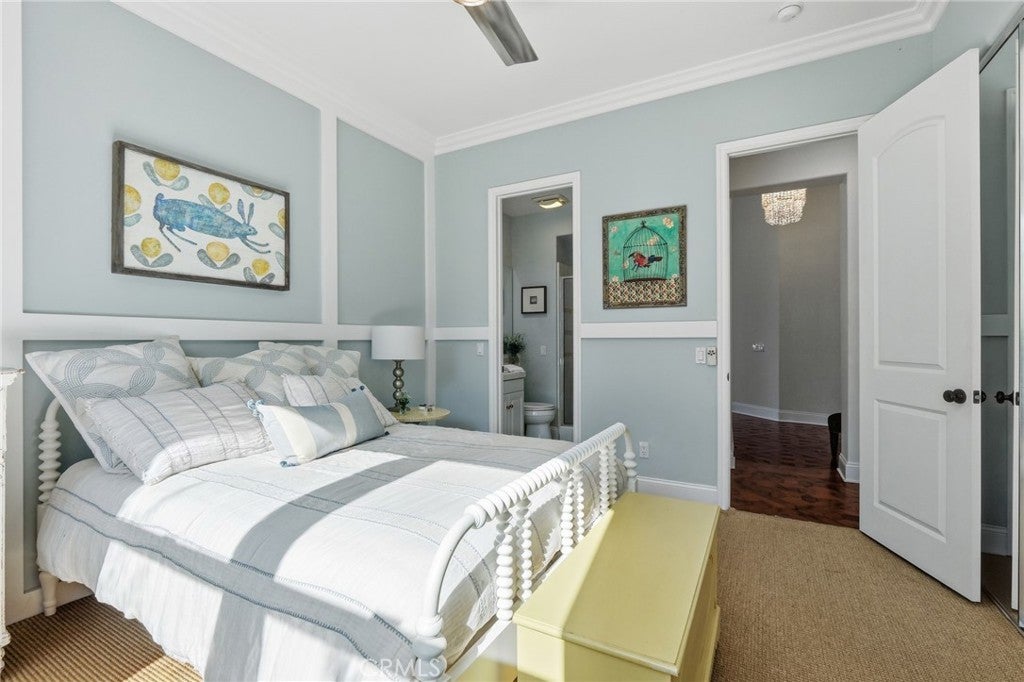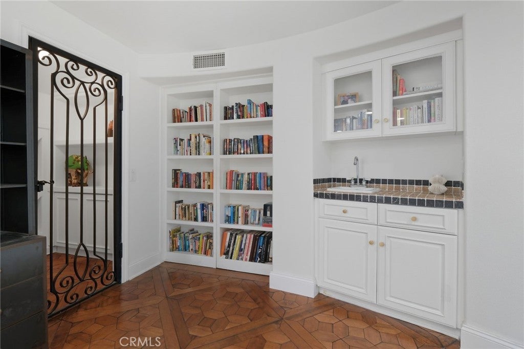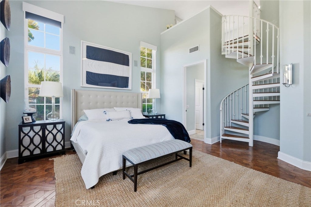 Nestled behind the quiet gates of Bella Lago, this stunning former model home embodies effortless California coastal living where style meets comfort. Set at the end of a peaceful cul de sac, this two story home lives like a one story, with all main living spaces on the entry level. Inside, the open floor plan welcomes you with high ceilings, walls of windows, and Richard Marshall hardwood floors that fill the home with warmth and natural light. An elegant curved wrought iron staircase leads to a circular loft and private retreat, adding architectural beauty and character. The chef’s kitchen blends a cool California vibe with restaurant inspired design. Outfitted with Viking appliances, quartz countertops, open shelving, and a spacious island, the space feels both elevated and inviting. It flows effortlessly into the family room with beamed ceilings and a cozy fireplace, making it perfect for cooking, gathering, and entertaining. Upstairs, a private retreat offers a sitting area and wine closet, plus a hidden loft behind a bookcase with a spiral staircase leading down to the primary suite, an unexpected architectural touch and the perfect bonus space for work or relaxation. The primary suite itself offers direct patio access and a serene, private escape. The outdoors is truly a retreat, private, lush, and designed for living well. Enjoy lazy afternoons by the sparkling pool, unwind in the spa beneath the stars, or gather around the fireplace for cozy evenings with friends. With cascading waterfalls, a built in BBQ, and a putting green, every inch of this backyard was made for relaxation, entertaining, and savoring the Southern California lifestyle. The home is beautifully sited on the lot, surrounded by gardens on all sides, offering both beauty and privacy in every view. Just beyond the gates, enjoy Batiquitos Lagoon walking trails, and within minutes, reach Carlsbad’s beaches, golf courses, shops, and dining. With top rated schools and easy freeway access, this home defines coastal California living.