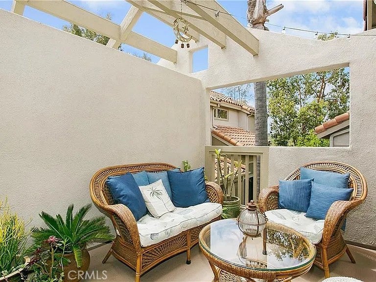 Available NOW! Welcome to this exceptional carriage unit in the highly desirable community of Palm Court in Laguna Niguel. Enjoy refreshing ocean breezes, peaceful tree-lined views, and a quiet location near the back of the neighborhood—with no one above or below you. Enter through the charming ground-level courtyard with lush landscaping and head inside to the first level, where you’ll find access to the attached one-car garage with built-in storage and epoxy flooring. From there, an interior staircase leads you up to the bright and open main living area, all on one level. Upstairs, the home features vaulted ceilings, abundant natural light, plantation shutters, newer ceiling fans, and beautiful distressed wood flooring throughout. The spacious living room offers a cozy fireplace with a glass-tile façade and opens to one of two private decks, perfect for enjoying morning coffee or coastal breezes. The remodeled kitchen boasts Quartz countertops, a glass tile backsplash, upgraded cabinetry with custom lighting and pull-out drawers, stainless steel appliances, and a breakfast bar that flows seamlessly into the dining space. A newer refrigerator is also included. The floor plan offers two generous bedrooms and two full bathrooms, each updated with Quartz counters, modern light fixtures, and tile flooring. The primary suite features its own private deck, and the convenient upstairs laundry includes a washer and dryer. Residents of Palm Court enjoy resort-style amenities including a sparkling pool, spa, tennis courts, and a tot lot, just steps from the front door. The community is ideally situated next to Chapparosa Park and only minutes from Dana Point Harbor, world-class beaches, trails, restaurants, and shopping.