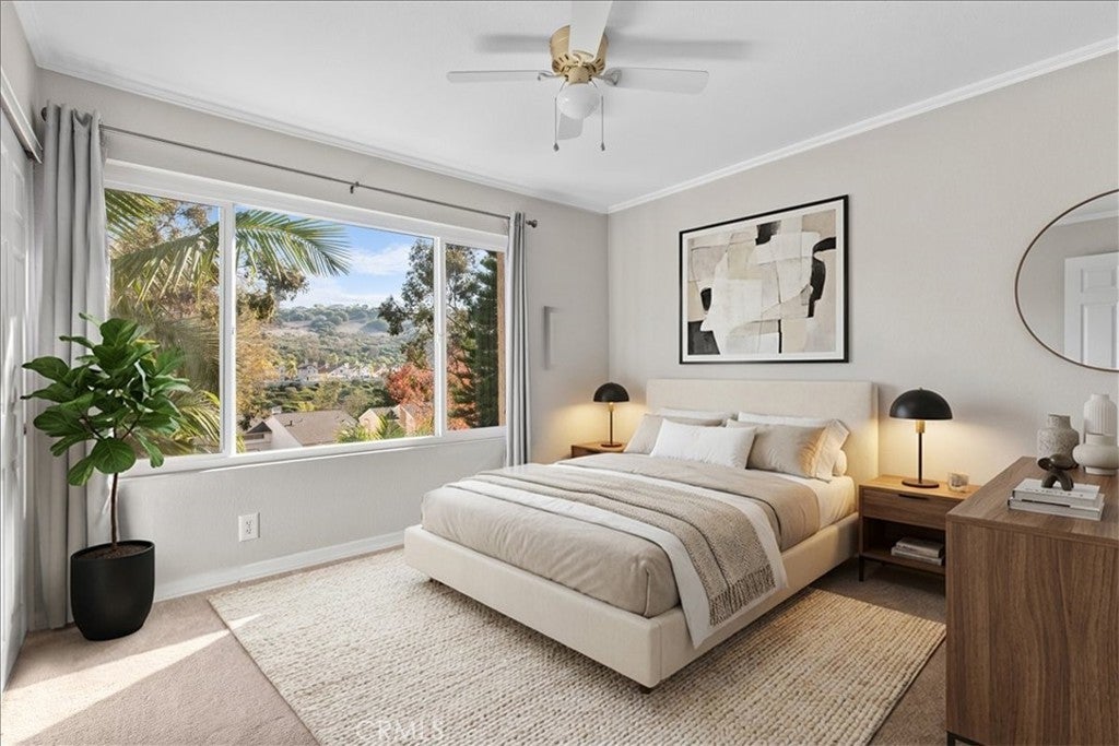 Welcome to your stunning, turn-key home in the exclusive, gated Aerie community of Park Niguel, located in the coastal-breeze enclave of Laguna Niguel! Nestled on a cul-de-sac, this beautifully updated two-story home blends modern design with serene surroundings and offers breathtaking territorial views of this master-planned “city of trees.” A short stroll brings you to top-tier Crown Valley Park and the Niguel Botanical Preserve, the “Crown Jewel” of Laguna Niguel, featuring sports fields, active community spaces, and the YMCA. Across from the driveway, you're steps away from the community pool/spa provide added convenience for relaxation and entertaining. Just seven minutes away, you can enjoy world-class South Orange County beaches. This gorgeous home features 3 bedrooms, 2.5 baths, a full 2-car garage w/ ample driveway parking, a privately landscaped patio oasis with an above-ground jacuzzi and outdoor shower. Step through newly upgraded double doors into the inviting living room with wood floors and a cozy gas stone fireplace with beach-themed driftwood logs. The fully renovated kitchen impresses with Calacatta countertops and backsplash, abundant cabinetry, stainless steel appliances including a 6-burner stove, wine cooler, LED lighting, and a breakfast bar. The adjacent atrium offers outdoor seating and a fire pit—perfect for a quiet moment or casual entertaining. A half bath and separate laundry room complete the first floor. Upstairs are all 3 bedrooms and a full bath, including the bright primary suite with vaulted ceilings, cedar-lined closets, and an ensuite bath featuring a walk-in shower and oversized double-sink vanity with makeup area. Step onto the newly replaced Trex balcony to enjoy sunny, elevated views overlooking the patio garden—an ideal morning retreat. Additional highlights include reverse-osmosis water filtration, full potassium water softener system that cleans the pipes, Ring doorbells, and an HVAC system rarely needed thanks to refreshing ocean breezes. Park Niguel offers privacy, security, and lovely amenities such as the nearby pool/spa. The location is exceptional—walking distance to parks, top schools, golf, shopping, dining, and entertainment, with easy access to Pacific Coast Highway and major freeways. This master-planned community’s preserved outdoor spaces ensure a pristine, highly livable environment for years to come. Move in and start enjoying one of Southern California’s most desirable areas—Laguna Niguel!