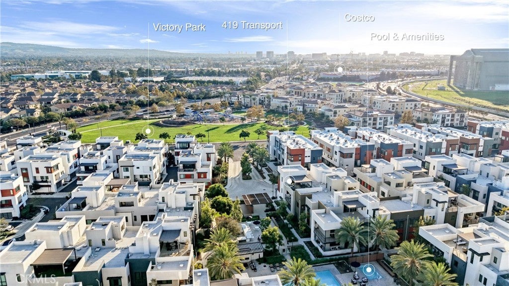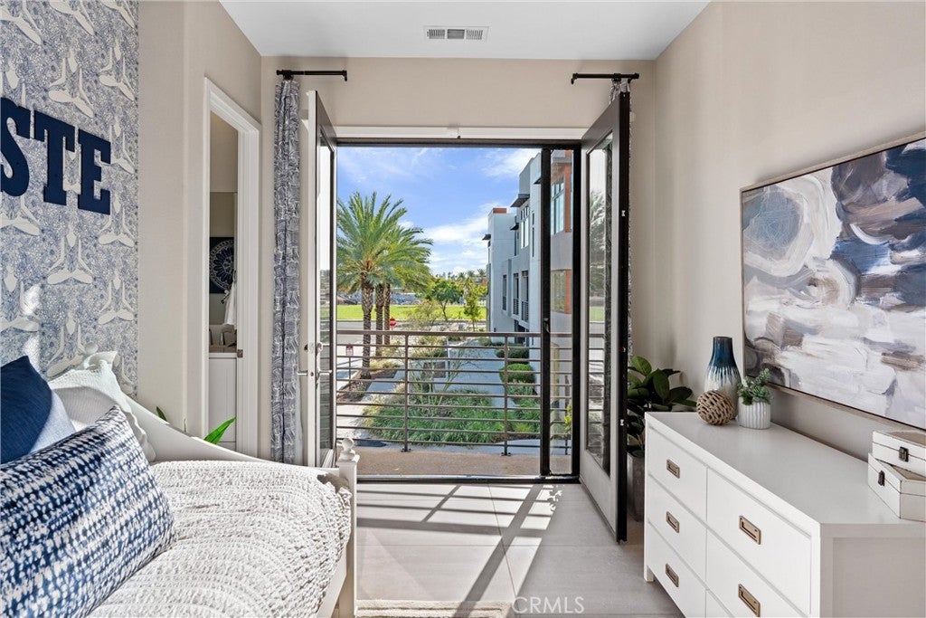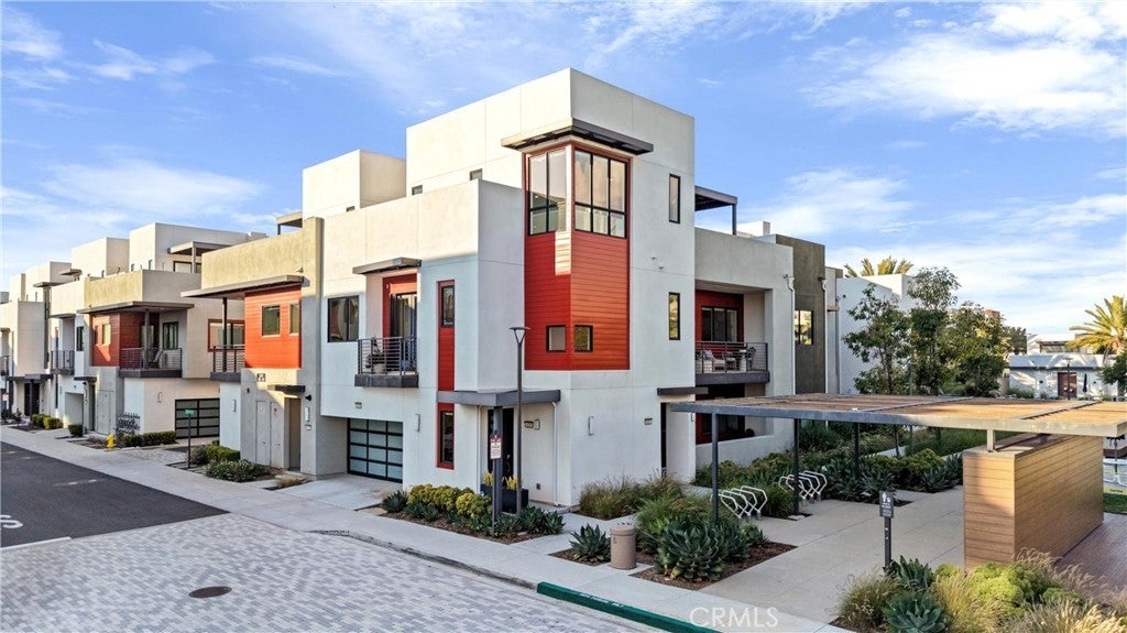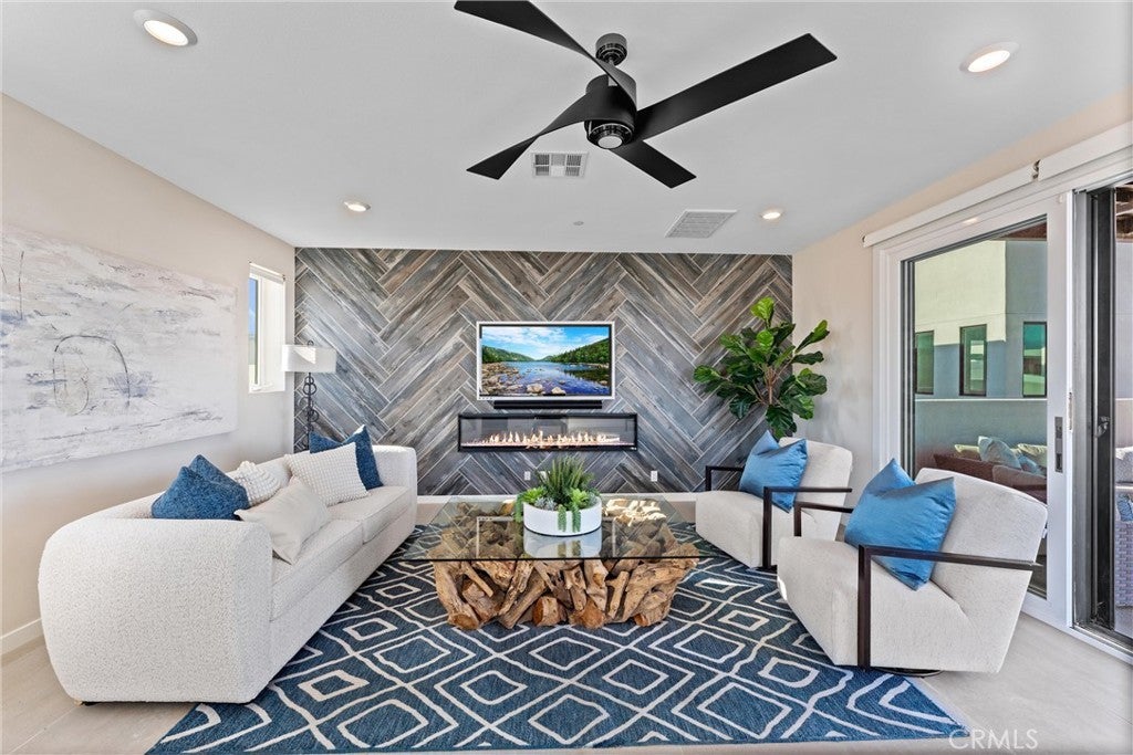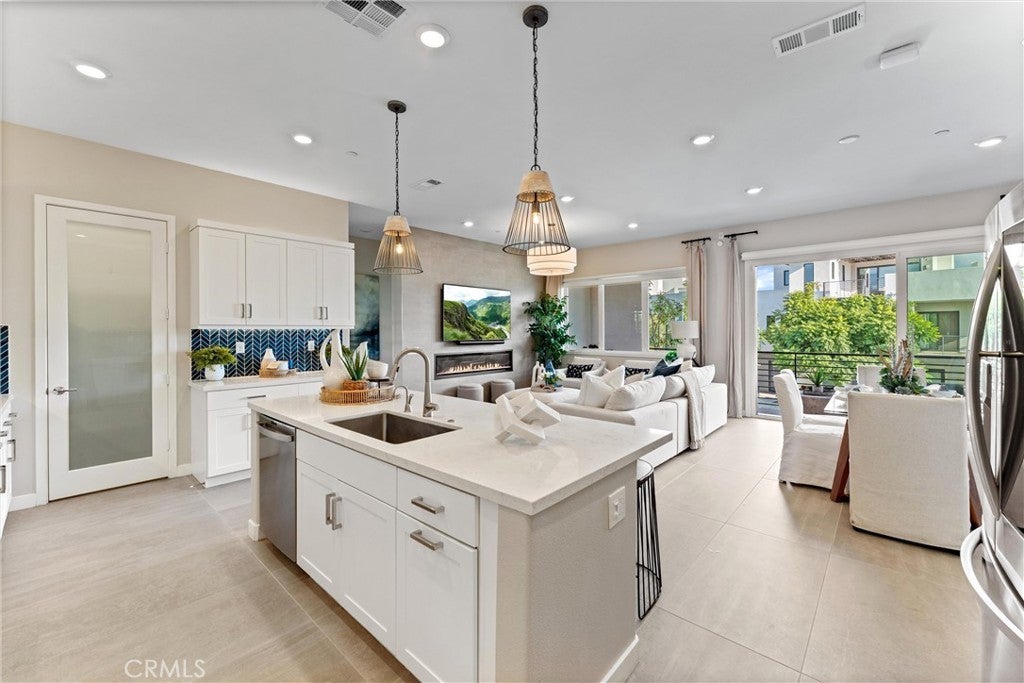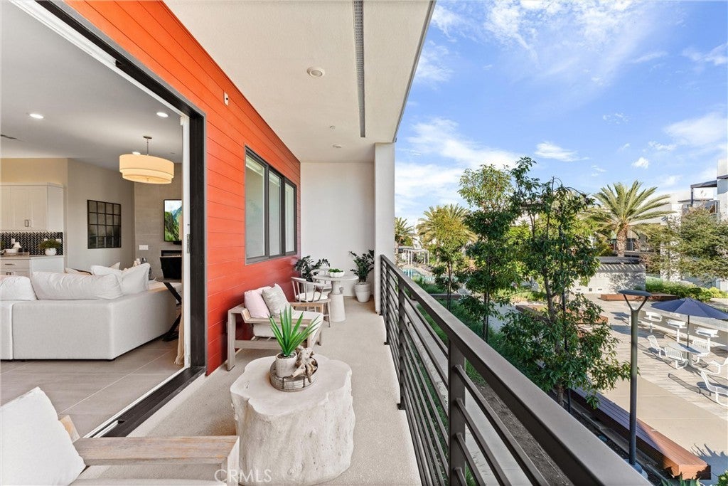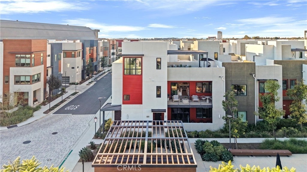 Welcome to 419 Transport in the Levity community at Tustin Legacy, a former model home with a premium corner location offering ample natural light and elevated views. This three-story, single-level living flat features 3 bedrooms, 3 bathrooms on the same floor, and a versatile third-level entertainment space that opens to a spacious rooftop deck. The 2,546 sqft home impresses with modern, designer finishes at every turn, from motorized roller shades and lighting to wallpaper accents, custom shiplap, and large-format porcelain tile throughout. The main level lives like a single-story home, with the kitchen, great room, bedrooms, baths, and laundry all situated on one floor. The expansive great room is anchored by a striking floor-to-ceiling tile fireplace wall and a balcony that overlooks the community area. The kitchen blends style and function with quartz countertops, a full herringbone backsplash, a walk-in pantry, GE Profile stainless steel appliances, pendant lighting over the generous island, and integrated under-cabinet lighting. All three bedrooms are thoughtfully positioned on this level, including a refined primary suite, a secondary ensuite bedroom enhanced by French doors that open to a charming Juliet balcony, and a spacious third room. The primary suite offers large windows, a feature wall backdrop, and an ensuite bath with a KOLER smart bidet toilet, an oversized walk-in shower with stacked glossy white subway tile, and hexagon mosaic flooring. The third floor features a bonus room with a dry bar and a charcoal-toned tile fireplace wall set in a modern herringbone pattern. The stacking doors open to the rooftop deck, ideal for entertaining, relaxing, or outdoor dining. Additional highlights include a 569 sqft two-car garage with epoxy flooring, storage cabinets, an extra storage closet, a tankless water heater, and an electric vehicle charger. Residents of Levity enjoy resort-style amenities, including a pool, spa, and barbecue area. The location offers exceptional convenience, with easy access to top-rated Legacy Magnet Academy, Victory Park, The District, Newport Beach, and John Wayne Airport.