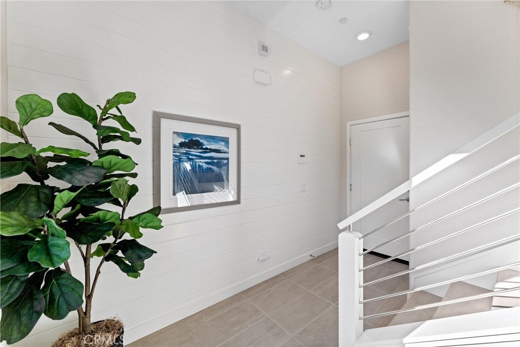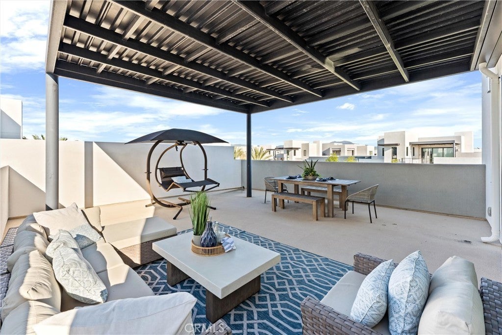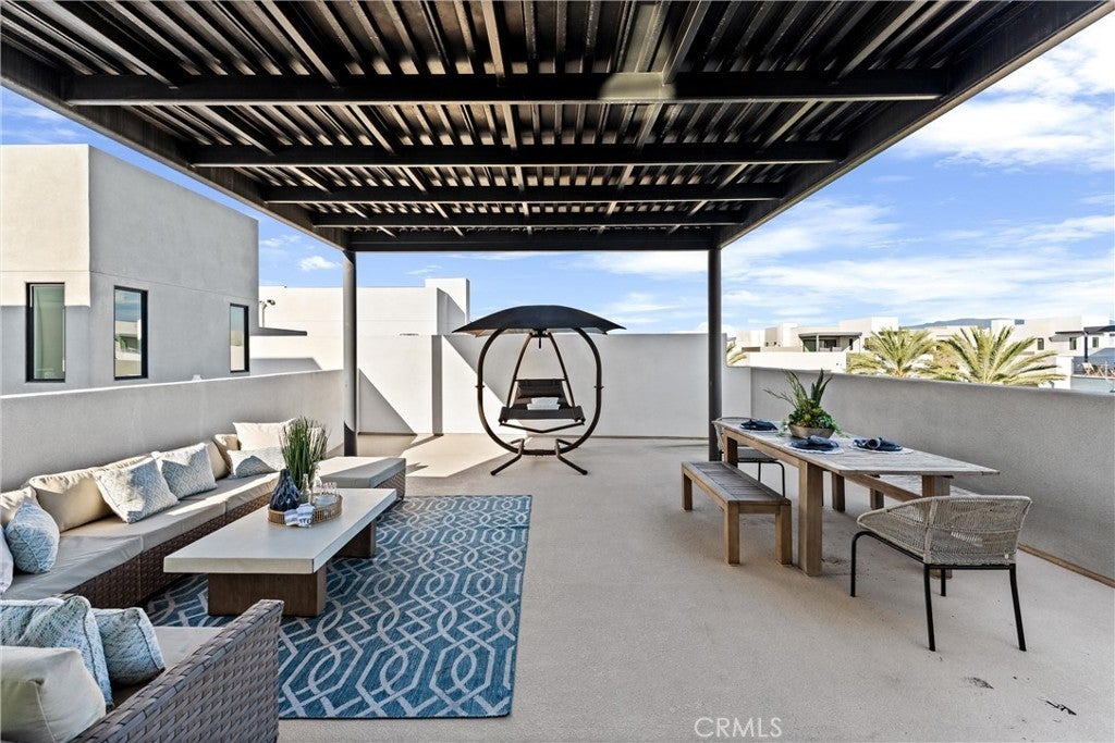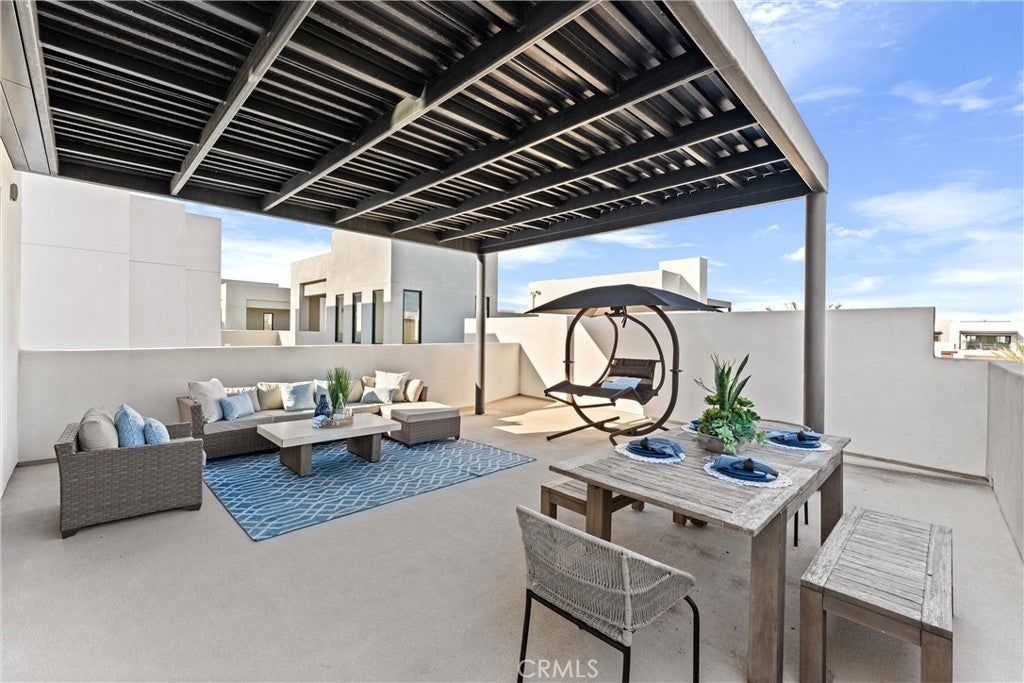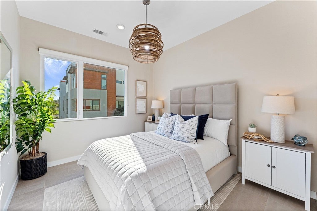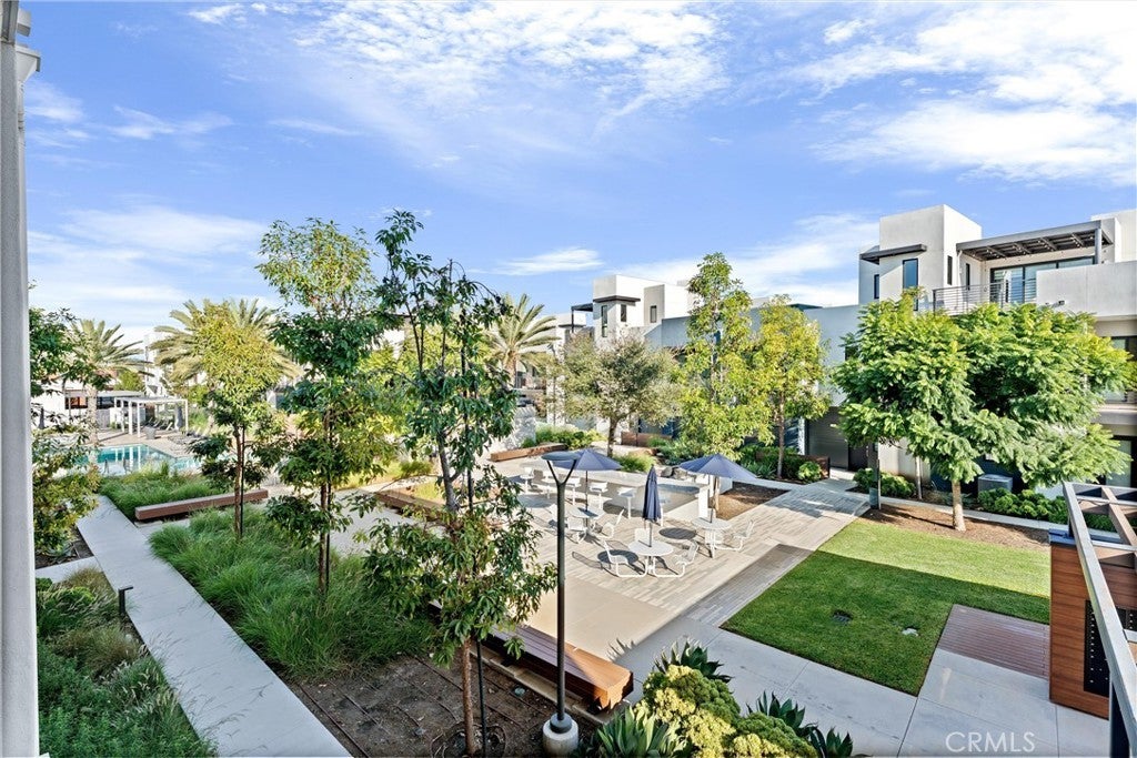 Welcome to 419 Transport in the Levity community at Tustin Legacy, a former model home with a premium corner location offering ample natural light and elevated views. This three-story, single-level living flat features 3 bedrooms, 3 bathrooms on the same floor, and a versatile third-level entertainment space that opens to a spacious rooftop deck. The 2,546 sqft home impresses with modern, designer finishes at every turn, from motorized roller shades and lighting to wallpaper accents, custom shiplap, and large-format porcelain tile throughout. The main level lives like a single-story home, with the kitchen, great room, bedrooms, baths, and laundry all situated on one floor. The expansive great room is anchored by a striking floor-to-ceiling tile fireplace wall and a balcony that overlooks the community area. The kitchen blends style and function with quartz countertops, a full herringbone backsplash, a walk-in pantry, GE Profile stainless steel appliances, pendant lighting over the generous island, and integrated under-cabinet lighting. All three bedrooms are thoughtfully positioned on this level, including a refined primary suite, a secondary ensuite bedroom enhanced by French doors that open to a charming Juliet balcony, and a spacious third room. The primary suite offers large windows, a feature wall backdrop, and an ensuite bath with a KOLER smart bidet toilet, an oversized walk-in shower with stacked glossy white subway tile, and hexagon mosaic flooring. The third floor features a bonus room with a dry bar and a charcoal-toned tile fireplace wall set in a modern herringbone pattern. The stacking doors open to the rooftop deck, ideal for entertaining, relaxing, or outdoor dining. Additional highlights include a 569 sqft two-car garage with epoxy flooring, storage cabinets, an extra storage closet, a tankless water heater, and an electric vehicle charger. Residents of Levity enjoy resort-style amenities, including a pool, spa, and barbecue area. The location offers exceptional convenience, with easy access to top-rated Legacy Magnet Academy, Victory Park, The District, Newport Beach, and John Wayne Airport.