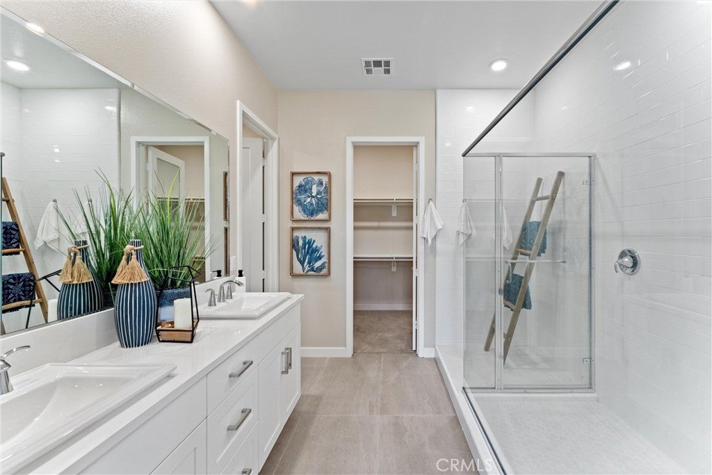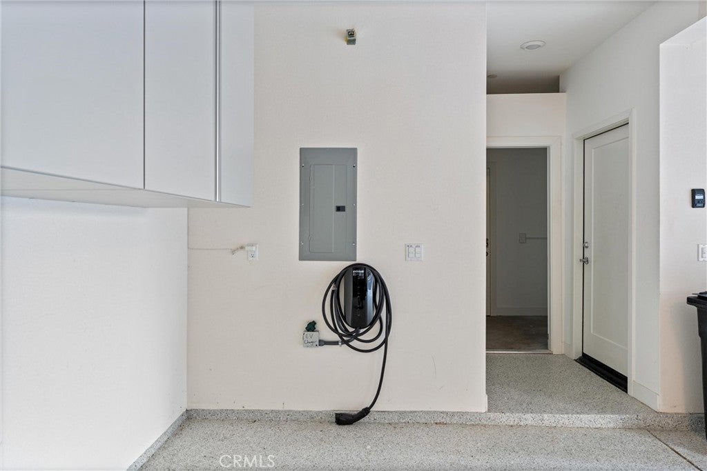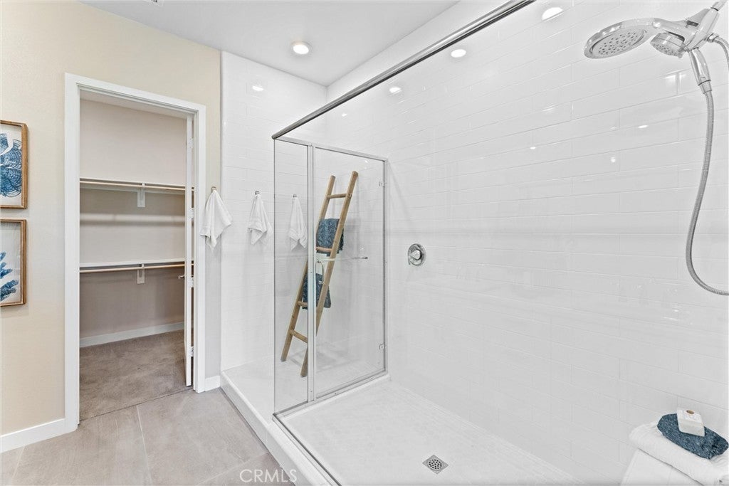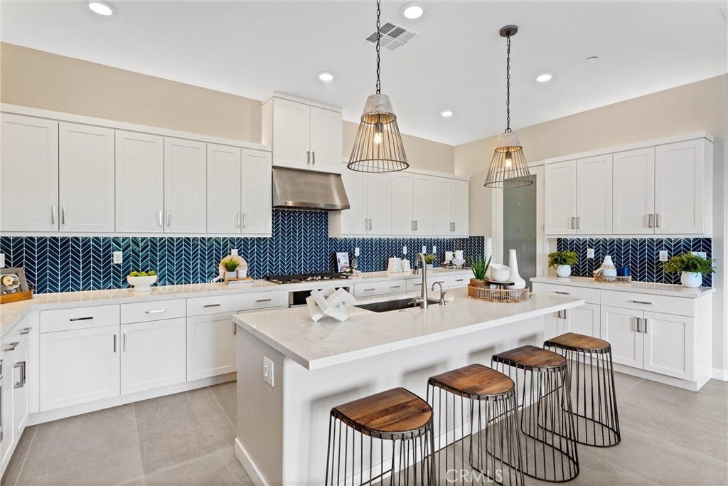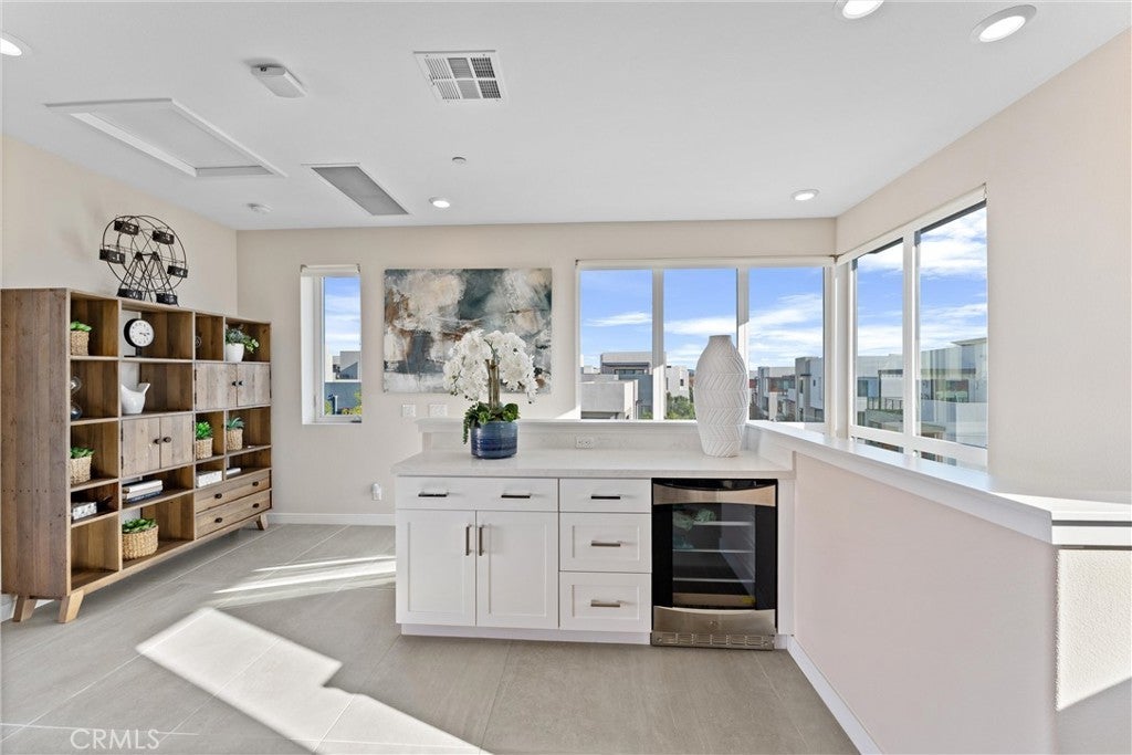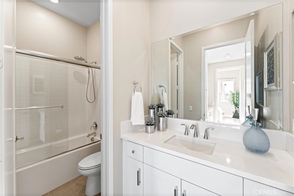 Welcome to 419 Transport in the Levity community at Tustin Legacy, a former model home with a premium corner location offering ample natural light and elevated views. This three-story, single-level living flat features 3 bedrooms, 3 bathrooms on the same floor, and a versatile third-level entertainment space that opens to a spacious rooftop deck. The 2,546 sqft home impresses with modern, designer finishes at every turn, from motorized roller shades and lighting to wallpaper accents, custom shiplap, and large-format porcelain tile throughout. The main level lives like a single-story home, with the kitchen, great room, bedrooms, baths, and laundry all situated on one floor. The expansive great room is anchored by a striking floor-to-ceiling tile fireplace wall and a balcony that overlooks the community area. The kitchen blends style and function with quartz countertops, a full herringbone backsplash, a walk-in pantry, GE Profile stainless steel appliances, pendant lighting over the generous island, and integrated under-cabinet lighting. All three bedrooms are thoughtfully positioned on this level, including a refined primary suite, a secondary ensuite bedroom enhanced by French doors that open to a charming Juliet balcony, and a spacious third room. The primary suite offers large windows, a feature wall backdrop, and an ensuite bath with a KOLER smart bidet toilet, an oversized walk-in shower with stacked glossy white subway tile, and hexagon mosaic flooring. The third floor features a bonus room with a dry bar and a charcoal-toned tile fireplace wall set in a modern herringbone pattern. The stacking doors open to the rooftop deck, ideal for entertaining, relaxing, or outdoor dining. Additional highlights include a 569 sqft two-car garage with epoxy flooring, storage cabinets, an extra storage closet, a tankless water heater, and an electric vehicle charger. Residents of Levity enjoy resort-style amenities, including a pool, spa, and barbecue area. The location offers exceptional convenience, with easy access to top-rated Legacy Magnet Academy, Victory Park, The District, Newport Beach, and John Wayne Airport.
