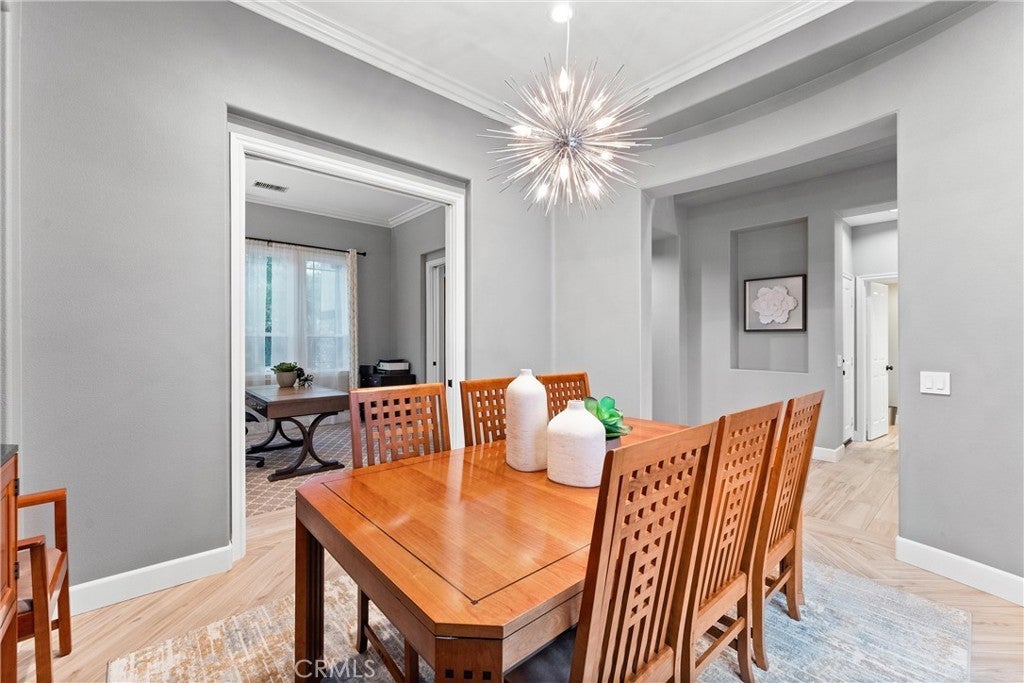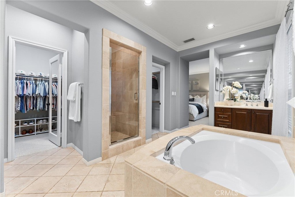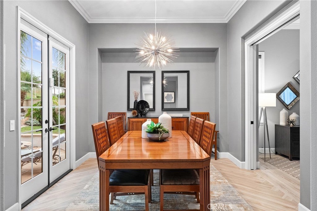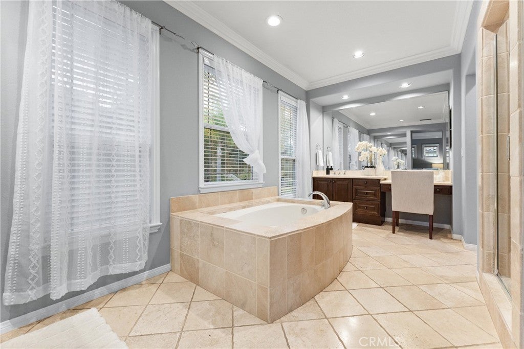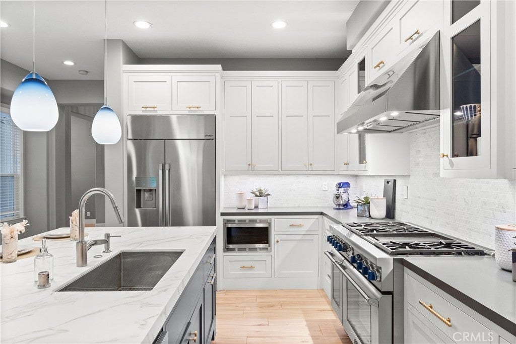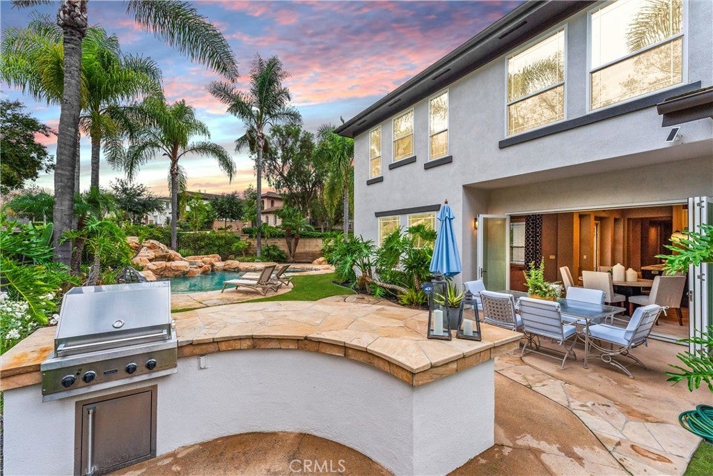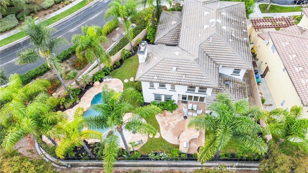 Welcome to 24 Thornhill, where modern design meets everyday comfort in this stunning 5-bedroom, 4-bathroom residence. Spanning 3,432 square feet on an oversized 8,256 square foot corner lot, this home offers the perfect blend of style and functionality. Step inside to an open-concept floor plan with imported Italian porcelain wood-look tile flooring that seamlessly connects the main living spaces and the backyard through La Cantina doors and screens, creating an inviting atmosphere for both entertaining and relaxation. The gourmet kitchen is a showstopper, featuring a large durable Neolith island, six burner Thermador stove and Dacor refrigerator, sleek custom-designed shaker-style cabinets, and ample storage with butler's pantry. The custom dry bar includes floating shelves, two refrigerators and deep beverage storage. The adjacent living and dining areas are flooded with natural light, enhancing the home’s bright and airy feel. The renovated downstairs bedroom and bath with quartz countertop and frameless shower provide a convenient retreat for guests or multigenerational living, while the dedicated office with pocket doors is ideal for remote work or study. Upstairs, the spacious primary suite offers an ensuite with dedicated separate sinks and generous closet space, while additional bedrooms provide flexibility for family, hobbies, or a home gym. Upstairs bedrooms benefit from a Jack and Jill bathroom with the fifth bedroom as a bonus room. Enjoy California’s indoor-outdoor lifestyle with a private pool and yard. A three-car tandem garage ensures plenty of parking and storage. System upgrades include newly installed heating and air conditioning (2025) plus newer water heater, whole-house fan, garage door/lift, pool heater and pool filter. Don’t miss this rare opportunity to own a beautifully designed and meticulously maintained home in a highly sought-after neighborhood!