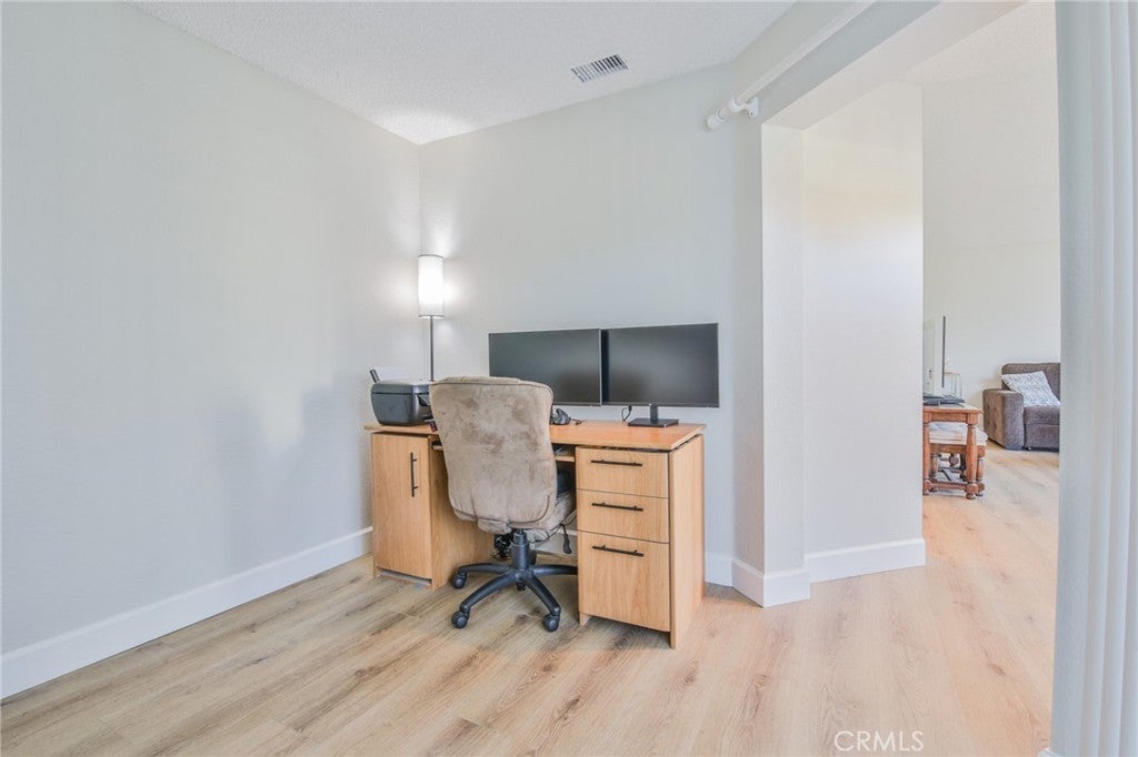 Welcome to this well-maintained upper-level corner-unit condo in the desirable Glenwood Village community of Aliso Viejo. This thoughtfully designed, diligently maintained, and beautifully updated home features 1 bedroom plus a den/office—perfect for working from home and easily convertible into a second bedroom. Recent updates include beautiful Luxury Vinyl Plank (LVP) flooring, a new AC and furnace (2020), Granite Transformations countertops in the kitchen, an updated bathroom, and new R-38 rated attic insulation with a radiant barrier and attic fan to help reduce heating and cooling costs. The unit includes its own private balcony/sitting area with private staircase access. The versatile den/office includes its own sliding door entrance. The dining area and spacious family room feature vaulted ceilings with high accent windows that bring in exceptional natural light, along with a cozy gas fireplace. The combination of soaring ceilings, tall windows, and plantation shutters creates a bright, inviting living space throughout the day. Clean LVP flooring and recessed lighting add a modern touch. The updated kitchen includes stainless steel appliances, Granite Transformations countertops, ample cabinet space, and an efficient layout. Refrigerator is included. Down the hall to the primary bedroom is a separate in-unit laundry area (washer and dryer included) and a full bathroom. The primary bedroom features vaulted ceilings, additional high windows that provide abundant natural light, and a walk-in closet. Surrounded by lush trees, green common areas, parks, and natural open space, this home offers a peaceful setting while still being close to everything. Enjoy quick access to shopping, dining, recreation, and some of Orange County’s best outdoor lifestyle amenities. You’re just a quiet 15-minute drive to Downtown Laguna Beach, 10 minutes to premier hiking and mountain biking trails, and 15 minutes to John Wayne Airport or Newport Beach. Aliso Viejo is also consistently ranked as one of California’s safest cities, making it a truly exceptional place to call home.