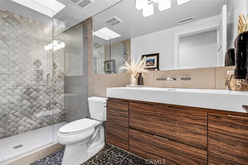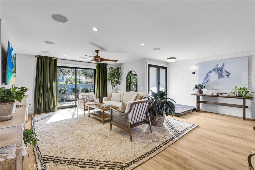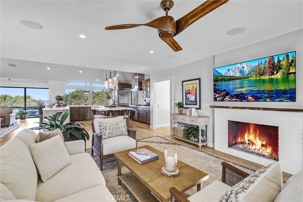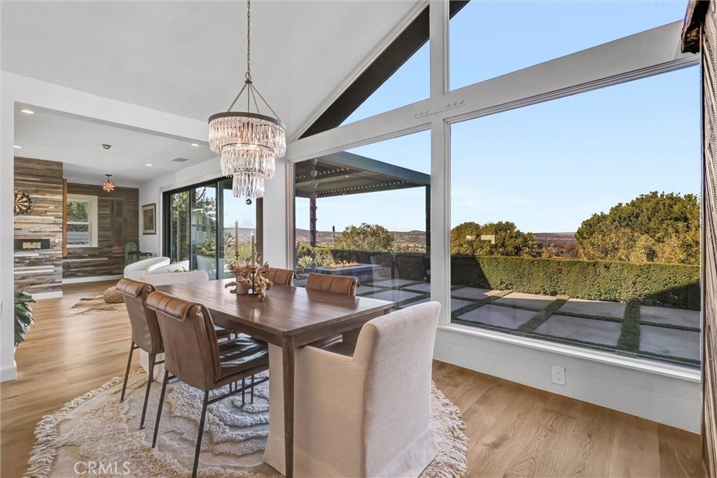 Perched above the rolling hills of Laguna Niguel, this single-story masterpiece is a true passion project—crafted with intention, character, and an artistry rarely found in today’s market. Every room reflects thoughtful design, custom finishes, and a harmony with the surrounding landscape that makes the home feel both inspired and inviting. A perfect blend of open-concept flow and beautifully defined spaces, the home offers 3 bedrooms, 3 baths, game area, family room, lounge area, and a versatile flex room ideal as an office, gym or library. White oak flooring grounds the living spaces with warmth, while designer wallpapers, live-edge shelving, and granite accents add curated richness and visual interest. At the center of everyday living is the chef’s kitchen, outfitted with a Wolf range, spacious refrigerator, custom cabinetry, a walk-in pantry, drawer-style dishwasher and microwave, and a built-in wine fridge. Just off the lounge sits a custom-finished bar, with its own granite details. Each of the home’s three bedrooms includes a custom-designed closet, offering stylish and efficient storage. One of the two guest bedrooms enjoys its own en-suite bath with a soaking tub. The primary suite is a peaceful retreat, featuring French doors that open to the garden deck, a spa-inspired bath with a walk-in shower and dual sinks, and an extraordinary walk-in closet with ample room for two, elegantly finished with unique flooring, and specialty lighting. Seamless indoor-outdoor living comes through a Jeld-Wen multi-slide door, which opens the back of the home to panoramic views of the Laguna Niguel valley and the Saddleback Mountains, plus a Fleetwood disappearing door to the front garden. Whether taking in soft morning light or dramatic sunset color, the backdrop is unforgettable. The outdoor spaces are thoughtfully crafted for relaxation and entertainment: a built-in BBQ, a fire feature for cozy gatherings, beautiful gardens, tranquil fountain, fruit trees, and an auto-roof pergola that provides shade without obstructing the view. Privacy and serenity define the backyard experience. Additional enhancements include a new roof (Fall 2025), water softener system, tankless water heater, abundant garage storage, and a well-equipped laundry room. Reimagined with heart and refined with exceptional detail, this property is more than a home—it’s a signature expression of California living, where custom craftsmanship meets modern luxury and sweeping natural beauty.