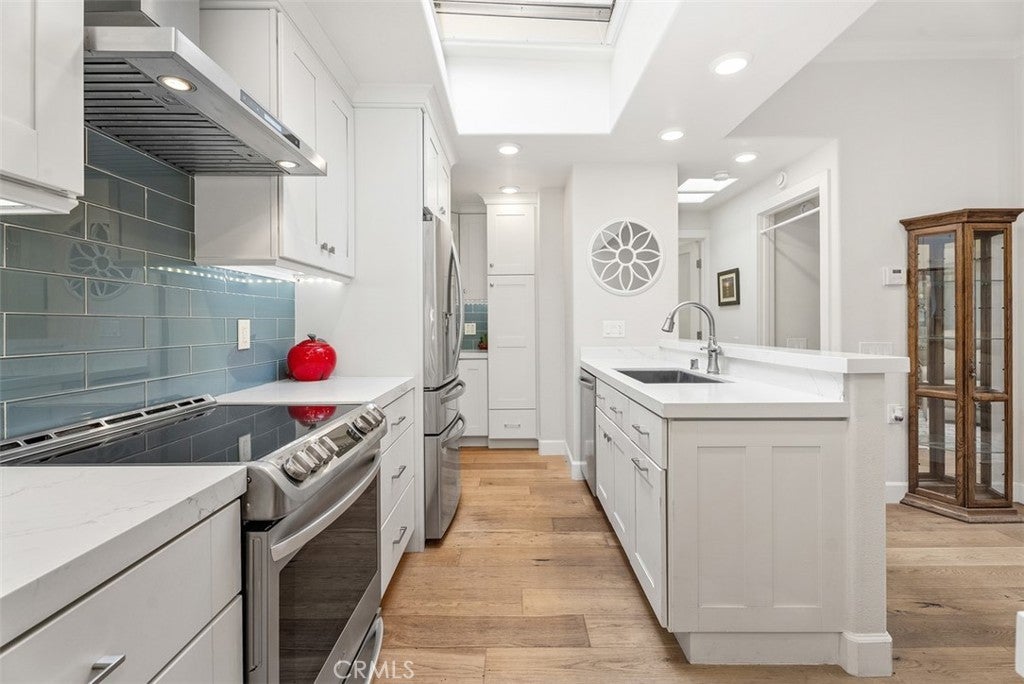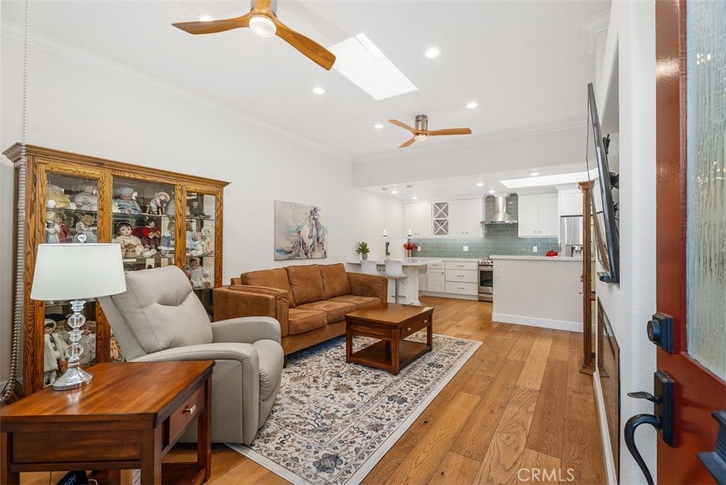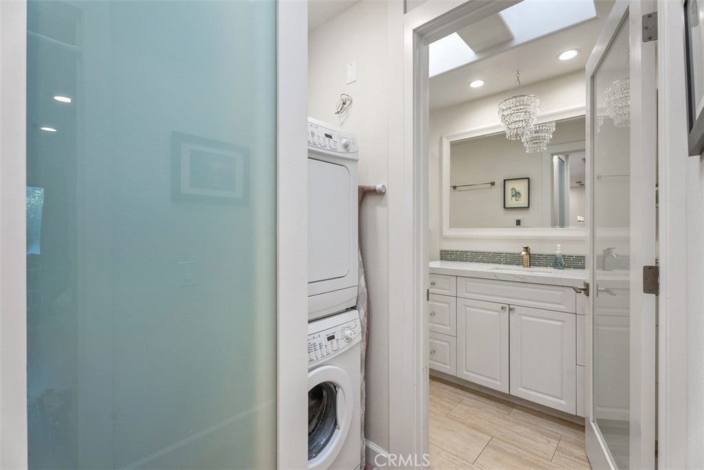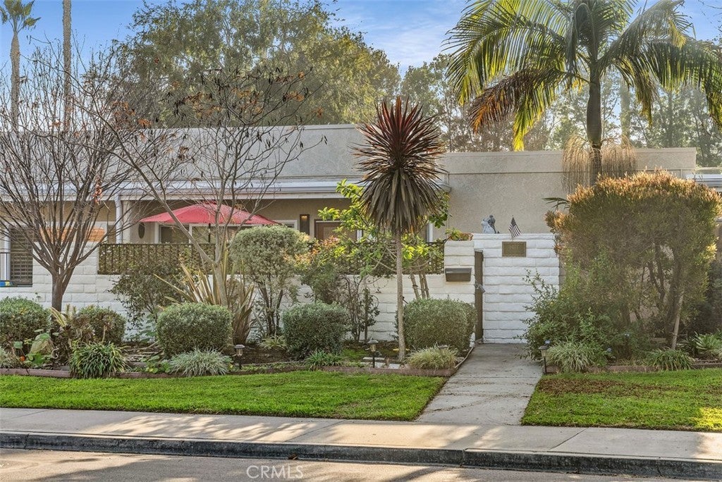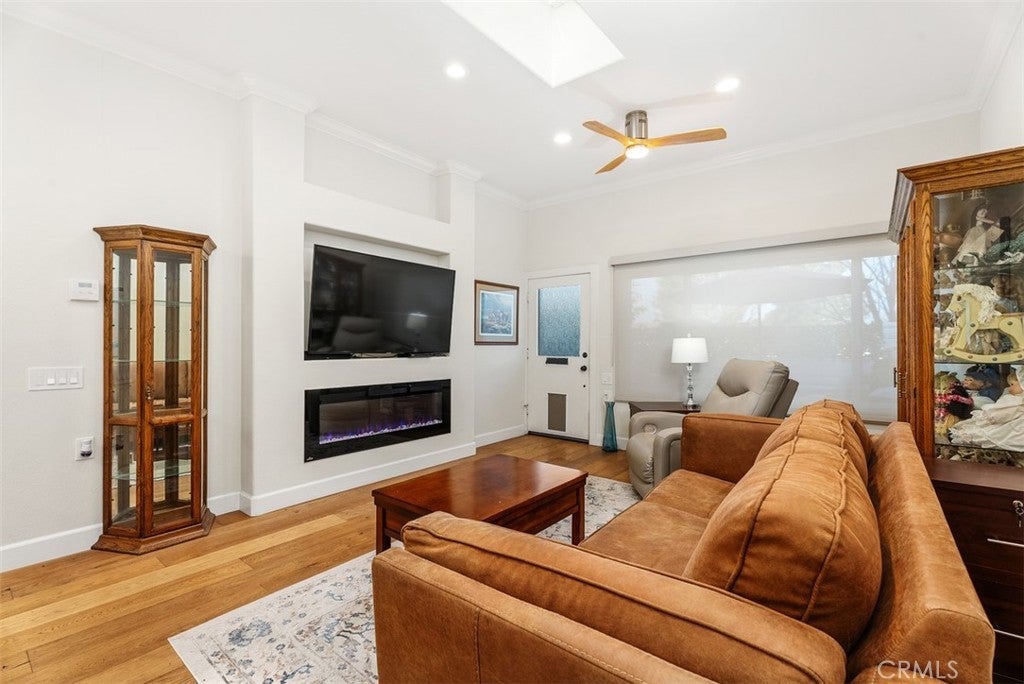 THIS IS a Must see home!>>SINGLE STORY>>NO ONE ABOVE OR BELOW>>A splendid re-imagined floor plan!>The Private & Peaceful FRONT PATIO feels like an ADDITIONAL Room! Beautifully detailed with used brick flooring>>INSIDE WASHER/DRYER!! >>The wall between the Main Living area and part of the kitchen Has been removed creating an OPEN concept spacious area>> Plus designed with 3 skylights with blinds causing a much lighter and bright home>>This home feels much bigger>>, The custom designed eating area has a Quartz counter accented by custom cabinets! The Large Chef's Galley Kitchen has stainless steel appliances, White Cabinetry, and Subway tiled backsplash..>>. There are 10-foot ceilings and recessed lighting, in the main living area, double paned vinyl windows, with an entertainment wall and an Electric fireplace. A perfect place for a 65" TV.>> Bull-nosed wall corners are a touch like New Home builders.>> The spacious bedroom has upscale sliding wardrobe doors.>> There is a Quartz vanity counter in the bath with a large walk-in shower accented by ceramic tile. WOW-HEATED FLOORING in the bathroom>- ANOTHER special touch!>> The Patio is Large enough to entertain several special friends. Laguna Woods Village is Golf Cart Friendly-enjoy the 27-hole golf course. There are over 200 clubs, Pickleball, Tennis courts, Bocce Ball, Lawn bowling, 7 clubhouses, 5 pools, 3 fitness centers, walking trails, an equestrian center, village horses, 2 garden centers, Free bus service... Only 5 miles from beautiful Laguna Beach and the Pacific Ocean! Close to shopping, medical facilities, restaurants, and SO MUCH MORE! The Best Kept Secret in Orange County.