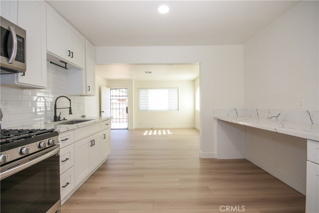 Sleek and modern 2BR/1BA is available for lease with immediate move-in! Upon entry, you'll love the warm and inviting open floor plan with light colored vinyl plank flooring throughout. The kitchen has been updated with white cabinetry offset with black hardware, and the quartz countertops have plenty of space and storage. The bathroom features an oversized step-in shower. Relax in the comfort of central heat/AC, and enjoy outdoor dining on your own private patio. Water, trash, and washer/dryer hookups included, as well as one car parking space in the detached garage and one additional assigned parking space. Great location within the Westminster School District, just off Beach Boulevard and quick access to the 22 Freeway. Just steps to Liberty Park.