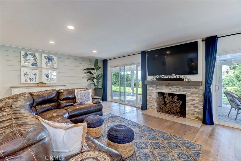 A rare opportunity in one of the most sought-after locations in Laguna Woods Village. This beautifully remodeled 3-bedroom, 2-bath Casa Grande offers approximately 1,900 square feet of warm, sophisticated single-level living with an attached 2-car garage. From the moment you enter, an inviting open-concept great room anchored by a stone-lined fireplace sets the tone for relaxed elegance and effortless entertaining. The remodeled kitchen truly feels like the heart of the home, showcasing a generous island with seating, sleek stainless steel appliances, recessed lighting, and abundant cabinetry that flows seamlessly into the dining and living areas, all enhanced by rich wood flooring. The spacious primary suite is a serene retreat, featuring a walk-in closet, walk-in shower, and dual sinks, while two additional bedrooms offer flexibility for guests, a home office, or hobbies—one guest room enjoying a lovely view that brings in natural light and a sense of openness. Thoughtful upgrades include double-paned windows/doors and central heating/air conditioning, creating a quiet, comfortable environment year-round. A separate laundry room with sink and extensive cabinet storage adds everyday convenience. Outside, the covered rear patio framed with pavers extends your living space and invites morning coffee, casual alfresco meals, and evening gatherings. The patio opens to an attractive view, enhancing the feeling of privacy and calm and making this home a standout opportunity for those seeking an upscale, move-in-ready residence in Laguna Woods Village.