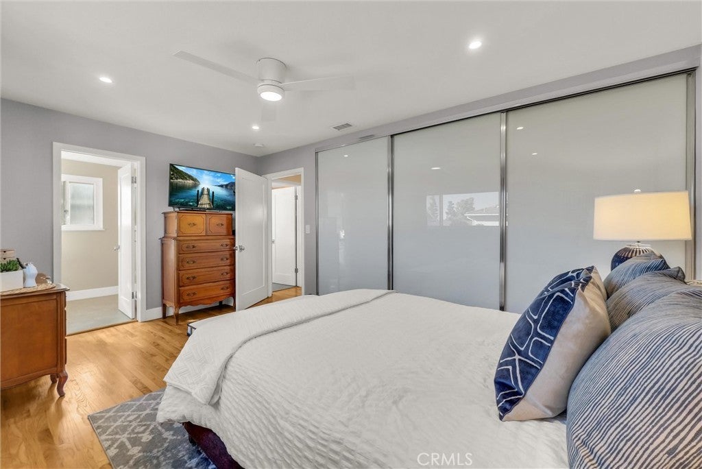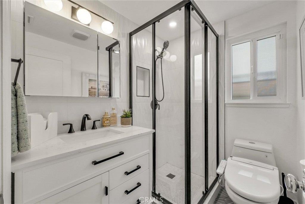 Step into modern elegance in Cypress. This professionally redesigned home sits on a quiet cul-de-sac corner lot and offers 4 bedrooms/3 baths, and nearly 2,000 square feet of upgraded living space on a 6,825 square foot lot. The overall remodel - including all bathrooms - was completed with a cohesive blend of style and function throughout. At the center of the home, the open-concept kitchen showcases solid wood shaker cabinetry, quartz countertops with an oversized peninsula, high-end appliances, glass tile backsplash, undercabinet lighting and abundant storage. The kitchen flows seamlessly into the dining room and family room, creating an inviting environment for entertaining and everyday living. Sliding doors open directly to the private backyard patio, extending the living space outdoors. The dining room also connects effortlessly to the formal living room, where a custom fireplace with an oversized mantel serves as a striking centerpiece. Solid wood shaker doors and custom baseboard molding extend throughout the entire home, adding timeless character and continuity. A convenient downstairs bedroom with an adjacent 3/4 bath provides flexibility for guests or multi-generational living. Upstairs, the primary suite is a true retreat, featuring an oversized custom closet with built-ins and elegant milk glass doors. The attached designer bathroom offers double sinks, custom tile work, seamless glass shower doors, and high-end fixtures. The second floor also includes two additional bedrooms and a beautifully appointed hall bath with a custom vanity, Carrera marble surround and a Kohler tub. Refinished hardwood floors and a custom iron staircase railing add sophistication throughout the upper level, while downstairs offers new luxury vinyl tile flooring, fresh interior paint, recessed lighting, and new windows. Outdoor living is enhanced by a landscaped yard with a new Alumiwood patio cover complete with ceiling fans. For added convenience, the finished garage includes custom cabinetry and access to an enormous attic, providing exceptional storage solutions. A secured RV access further elevates the property’s versatility. This home is located within the Anaheim Union High School District, zoned for Cypress High School and Lexington Junior High, with the opportunity to test into the prestigious Oxford Academy. Blending a full remodel, modern upgrades, and an unbeatable location, this Cypress home is ready to welcome its next owner.