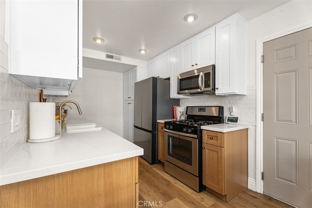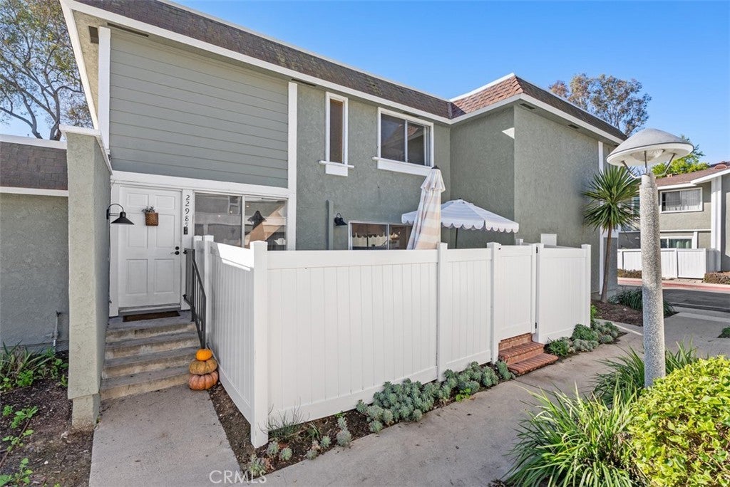 Experience Effortless Living! Impeccably Remodeled, Two-Level Townhouse in the sought-after Aliso Villas community. This residence offers 2 bedrooms, 1.5 bathrooms, and a convenient one-car garage with direct access. Inside, the home boasts a freshly painted interior with a spacious living room featuring newer vinyl plank flooring on the first level. The heart of the home is the immensely upgraded kitchen, featuring newer stainless steel appliances, newer quartz countertops, newer cabinetry, and newer hardware. It flows seamlessly into the dining area, which overlooks the private outdoor patio enclosed by vinyl fencing. Upstairs, you will find two generously sized bedrooms. The primary suite includes a walk-in closet, and the secondary bedroom offers ample closet space. The upstairs full bath and the downstairs half bath have both been recently updated, including newer toilets for both, plus a newer bathtub and marble tile in the upstairs bath. Infrastructure improvements include a newer water heater and updated plumbing. Beyond the direct-access garage, this home includes one assigned parking spot (space #985). As a resident of the Aliso Villas, enjoy access to a sparkling pool, spa, playground, and park. Also enjoy Mission Viejo Lake privileges! The location is ideal, offering close proximity to fantastic restaurants, the Mission Ranch Market, popular shopping destinations, and award-winning schools. This turn-key home is ready for you! Schedule your showing today.