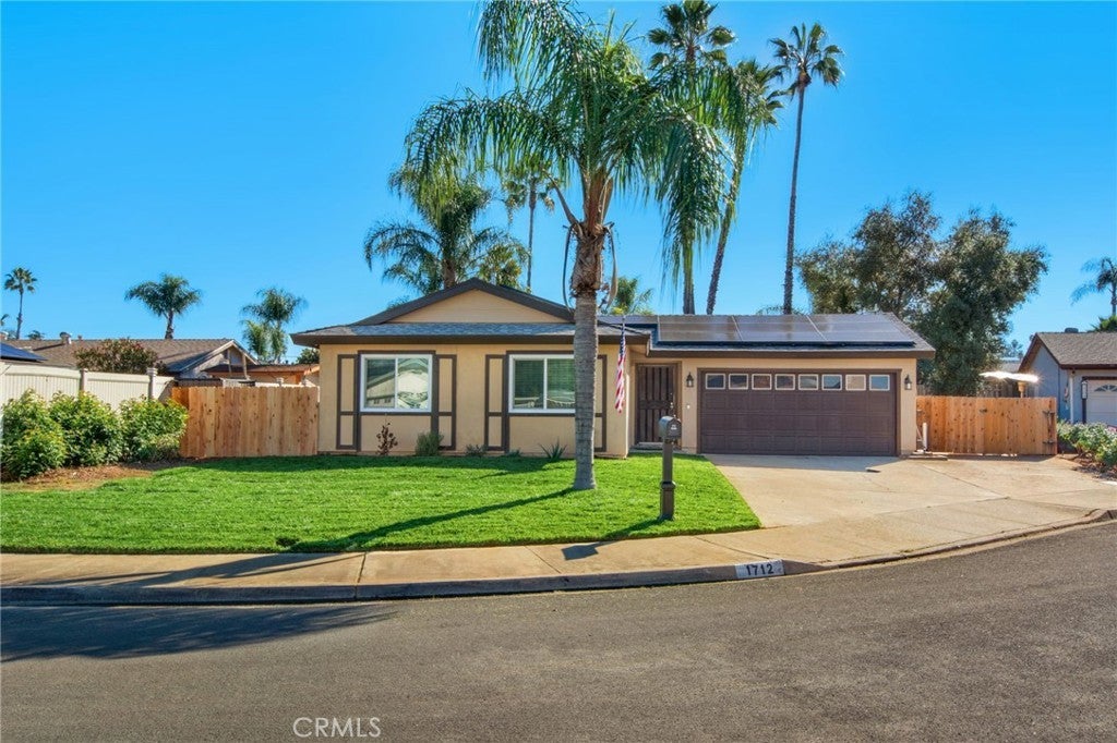 Quietly positioned at the end of a peaceful cul-de-sac in the Oak Hill community, 1712 Weathervane Place offers a blend of privacy, modern upgrades, and freedom that’s increasingly hard to find—with NO HOA or Mello-Roos. Inside, the home welcomes you with a bright, spacious living room highlighted by a skylight that brings in natural light throughout the day. The layout flows into an inviting eat-in kitchen with generous cabinet storage and a warm, open feel. Upgraded flooring and double-pane windows throughout the home enhance efficiency and comfort. The primary bedroom features a walk-in closet, while the beautifully remodeled bathroom includes a walk-in rain shower for a spa-like experience. Both bedrooms offer ample storage and ceiling fans for year-round comfort. This home includes a collection of major, high-value upgrades rarely found in this price range: • Fully paid-off Tesla Solar system with 30 panels — premium efficiency and exceptional power capacity • New electric water heater • Recent HVAC ducting • Tesla car charger in the garage • ADT alarm system for added peace of mind • Large attached two-car garage with laundry and storage • Upgraded flooring throughout • Energy-efficient double-pane windows Set on a 6,400 sq ft lot, the fully fenced backyard offers space for pets, gardening, outdoor living, or future additions. The beautifully maintained front lawn includes chicken-wire reinforcement beneath the grass to deter gophers and preserve long-term curb appeal. Located minutes from schools, shopping, parks, and major routes (I-15 and Hwy 78), the home sits in a quiet, established neighborhood within the Escondido Union School District—offering convenience while maintaining a peaceful residential feel. With its combination of privacy, energy efficiency, modern upgrades, and paid-off Tesla Solar, 1712 Weathervane Place stands out as a home that doesn’t come around often—offering long-term value and true everyday comfort in one of Escondido’s most accessible areas.