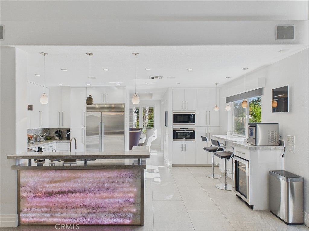 Take in the view at this contemporary estate perched high above Yorba Linda. As you arrive, you will be drawn-in by the sleek, professionally designed hardscaping and landscaping, which lend the home a modern, upscale appearance. As you walk through the updated iron/glass front door, you will find the expansive foyer, which opens to the formal living/dining rooms, and leads the way to the kitchen and family room. The family room is packed with modern features, including a hide-away TV/Entertainment center, a stainless and glass fireplace, and a wet-bar with an oversized Sub-Zero wine refrigerator. As you continue past the family room, you will find the large chef’s kitchen, which includes a Wolf/Sub Zero appliance suite with a large built-in refrigerator, 6-burner stove, separate built-in convection oven, built-in microwave and coffee/beverage bar area complete with a beverage refrigerator. The newly installed quarts countertops offer a clean, classic look to the space. Directly adjacent to the family room, you will find the laundry room, access to the 4-car garage, a half-bathroom, and the main-floor bedroom which features an en-suite full bathroom with walk-in shower. The sweeping granite clad staircase takes you up to the second level where you will find the primary suite, 3 additional bedrooms and the upstairs hallway bathroom. The expansive Primary suite features a sitting area with fireplace, a balcony with a 180 degree view and large modern primary bathroom with a walk-in shower, soaking tub, vanity area and walk in closet. The office/bedroom features custom built-in cabinetry with a small closet space and murphy-bed. The additional bedrooms are a great size and feature large closets with custom built-ins. This home is equipped with a Control-4 Smart Home System that controls many aspects of the home via a tablet or smartphone. All the plumbing was also just completely replaced. The backyard is an entertainers dream, a true personal playground that features all new hardscaping and landscaping including a luxury pool with a fully-tiled sun shelf, a sport court, and a multitude of fruit trees. The back yard also offers an unobstructed and fully private 180-degree view of Yorba Linda. This home is a rare find, truly turn-key, boasting estate style living with a ½ acre of land, a 4-car garage, expansive driveway and potential RV parking. The home sits just minutes away from award winning schools, Savi-Ranch, golf, recreation and entertainment options.