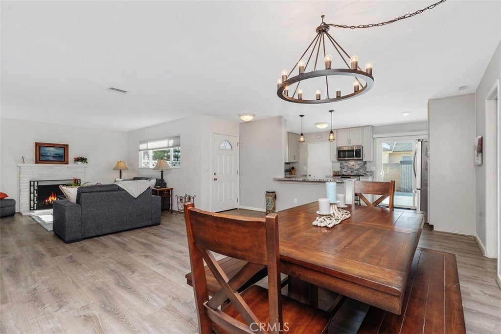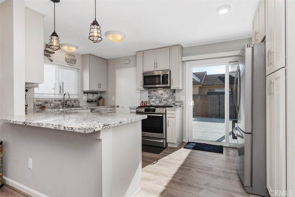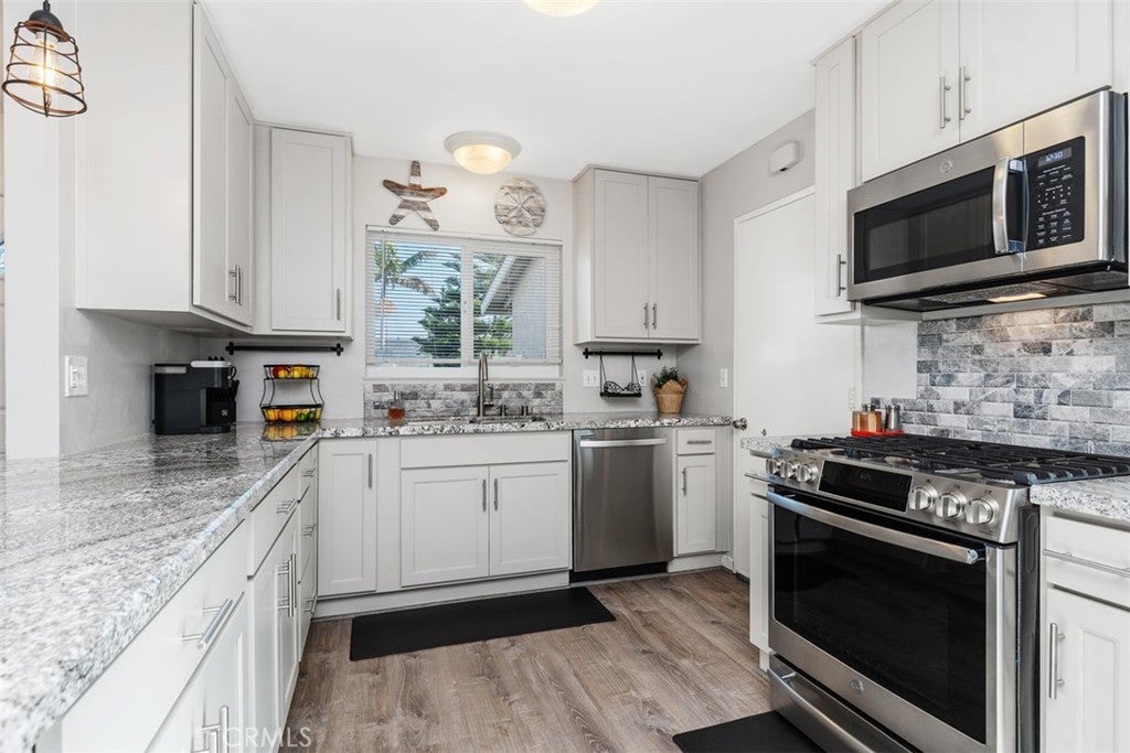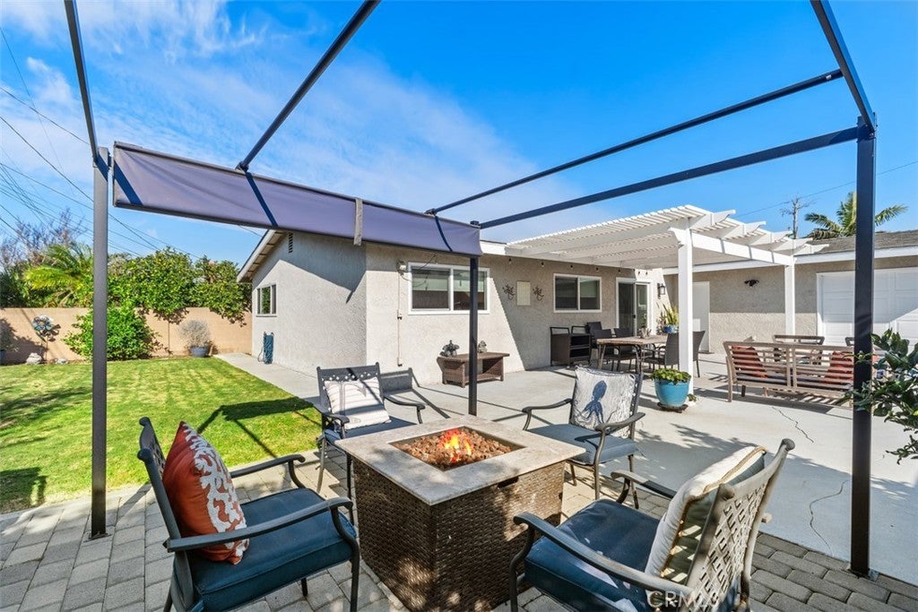 Home sweet home! This lovely beach home will capture your attention the moment you pull up to the curb. The front yard is nicely landscaped and offers a private courtyard with a tranquil water fountain. As you enter the home, you are greeted with an open concept living and dining room area. The living room features a large seating area as well as a wood burning fireplace. Next comes the beautiful kitchen, which was completely remodeled within the last 5 years and offers redone cabinetry, granite counters plus stainless steel appliances with the refrigerator included in the sale. The hall bathroom offers a bathtub/shower combo, a newer vanity with quartz counter and travertine tile flooring. The bedrooms are all nice sized and feature new carpeting, along with mirrored wardrobe closets. The primary bedroom is quietly situated at the rear of the home and the primary bathroom comes with a large shower and an updated vanity with quartz countertop. There are also many quality upgrades including: vinyl flooring, panel doors, smooth ceilings, dual pane windows & slider, a mini split wall heating & air conditioning system with one unit in the living room and the other in the primary bedroom plus a newer roll-up garage door with quiet opener. The private rear yard features a spacious patio with a newer vinyl pergola, a second patio with pavers, a freestanding firepit and BBQ, both included with the sale, a large grassy area, orange, lemon and lime trees, block wall fencing as well as a rear garage/boat door, perfect for pulling a boat or recreation toys through to the rear patio. The home is walking distance to quality schools, several parks, shopping, restaurants, the Mall and is less than a 10 minute drive to the beach!