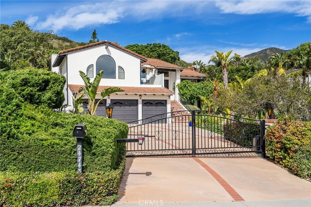 Elevate your existence in this masterfully reimagined contemporary Spanish estate, where panoramic ocean vistas and lush, tranquil gardens create an idyllic coastal retreat. Tucked behind secure automated gates on a peaceful cul-de-sac in the prestigious Malibu Country Estates, this sanctuary offers unparalleled privacy and serenity. Inside, expansive living unfolds across five luxurious bedrooms, including two opulent master suites (one of which is staged as a living room to illustrate the flexibility of the layout) with spa-inspired, designer-renovated en-suite bathrooms. At the core of the home lies a stunning, open-concept gourmet kitchen. Upgrades added a master bedroom and a spacious 622 s.f. three-car garage enhancing the property’s practicality and grandeur. Seamless indoor-outdoor integration defines the architecture, inviting you onto expansive uninterrupted views of the legendary Malibu 3rd Point surf break. The estate is framed by mature hedges, an impeccably manicured front yard, and vibrant gardens bursting with homegrown bounty from an array of fruit trees—lemons, oranges, figs, and pomegranates. Recent upgrades include a brand-new roof, ensuring durability and peace of mind against the coastal elements. Nestled in one of Malibu’s elite enclaves, complete with underground utilities, sewers, streetlights, and sidewalks, this home marries suburban sophistication with beachfront allure. Optional membership unlocks access to Pepperdine University’s world-class facilities, including Olympic-style pools, tennis courts, running tracks, and beyond. Just minutes from pristine beaches, high-end shopping at Cross Creek, acclaimed dining options, a vibrant farmers market, and Whole Foods, this prime central Malibu location delivers effortless luxury and convenience. Embrace the pinnacle of coastal elegance—your sublime Malibu haven awaits.