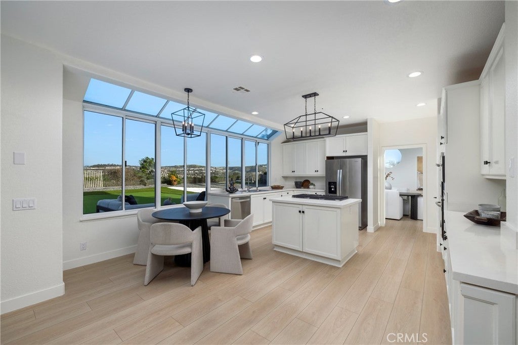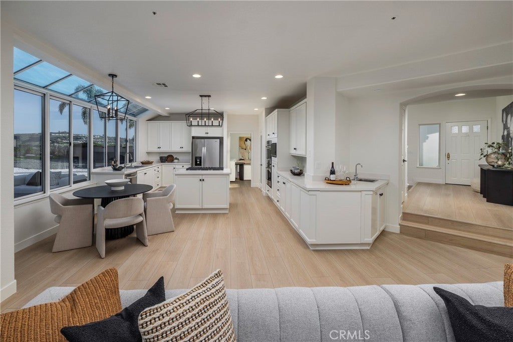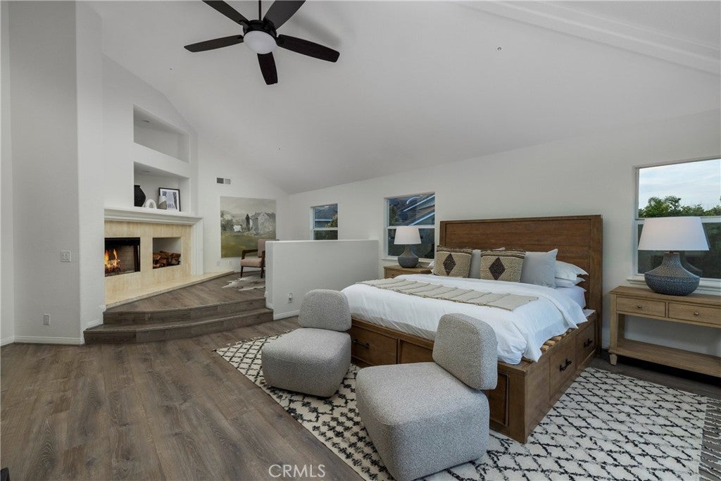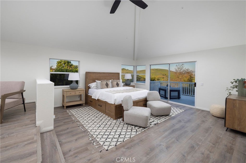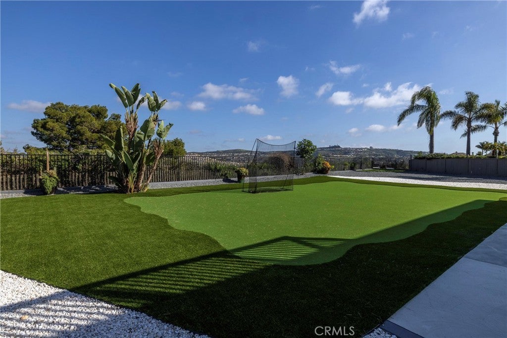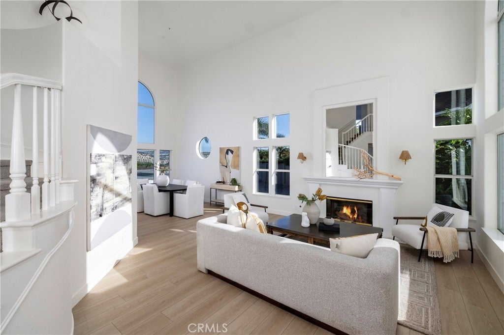 Spectacular home perched on a premium - flat lot, offering breathtaking canyon vista's, city lights and peek-a-boo ocean views set within the 24 hour- Guard gated Community of Highland Light Estates. Welcome home to this quiet cul-de-sac street and this newly upgraded residence with 4 bedrooms and 3 full sized bathrooms - including a main-level bedroom offering flexibility for guests or office use. Upon entry you will be in awe of the soaring ceilings, floor to ceiling windows and brand new premium wood style vinyl flooring throughout. The grand picture windows bring light and views through the formal living and dining spaces creating a Wow factor as you entertain next to the grand fireplace. The chefs kitchen has Quartz countertops, double ovens, 5 burner island cooktop stove, walk-in pantry and plenty of counter space and storage with the wrap around cabinetry - perfect for entertaining with the adjacent wet bar. The light filled family room has a beautiful fireplace and sliding doors to the incredible .26 acre backyard with multiple lounge and entertaining areas for sunset gatherings of any size or a quiet space to unwind and take in the ocean breezes. The full sports court is complete with a Basketball hoop and half court, next to a putting green with turf grass for a low maintenance environment. Leading up the circular staircase you will find the enormous primary suite with high beamed ceilings, a step-up retreat with a cozy fireplace and an oversized balcony with ocean and Canyon Vistas. The en-suite bath has dual walk-in closets with custom built-in organizers, dual sinks, vanity area, jetted tub and a separate walk-in shower. Across the hall you will find 2 large secondary bedrooms with high ceilings, peek-a-boo ocean views and an adjoining full sized bathroom. Imagine - the Ocean, fine dining and the playground of activities that San Clemente and Dana Point Harbor offers for your everyday life.