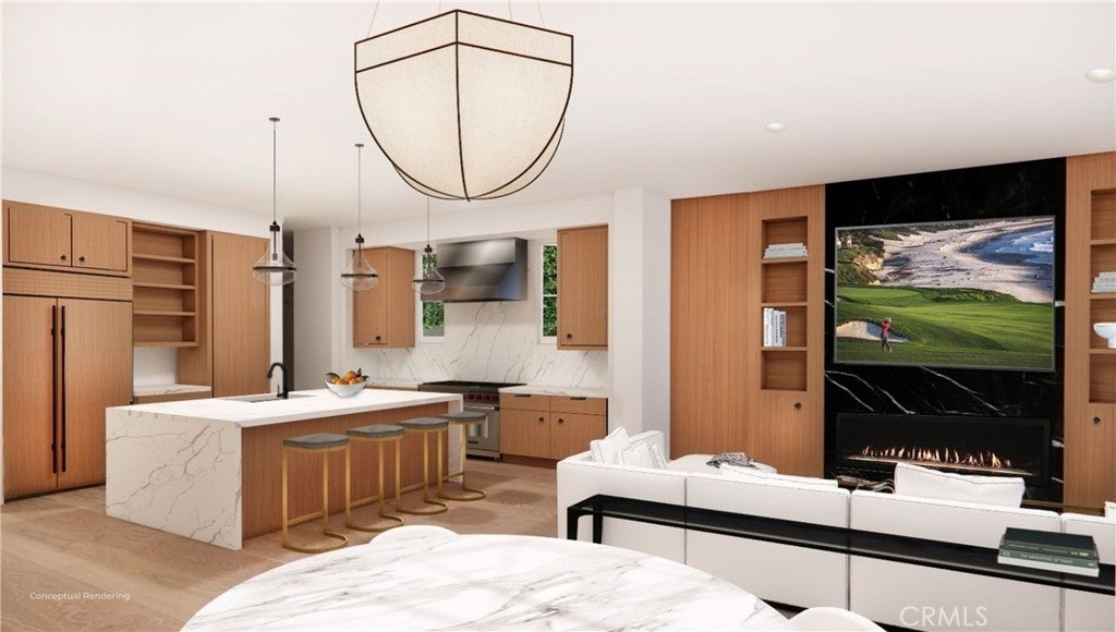 IN DEVELOPMENT | Estimated Completion: May 2026. Welcome to 28 Surfspray Bluff, an architectural retreat nestled within the coveted Nautilus enclave of Crystal Cove. Here, timeless Santa Barbara-inspired design meets a newly envisioned modern coastal aesthetic, where every space captures the rhythm of the sea and the art of sophisticated living. A brand-new front drive, crafted with sleek concrete and turf, sets the tone for what lies beyond; a home reimagined with meticulous detail and refined materials. Step through the private gated entry and follow the walkway past a lushly landscaped courtyard and tranquil fountain, where serenity introduces sophistication. Inside, a series of glass-paneled French doors open to light-filled spaces with sweeping sit-down ocean and Catalina views from both levels. The reimagined interiors — as captured in the stunning renderings — celebrate natural textures and modern warmth: wide-plank oak floors, vertical slat accent walls, and soft neutral palettes play in harmony with the coastal horizon beyond. The chef’s kitchen is a centerpiece of artistry and function, featuring an island wrapped in waterfall Calacatta quartz, custom white oak cabinetry, and professional-grade appliances by Viking and Sub-Zero. Pendant lighting and seamless flow into the living and dining areas create a feeling of effortless connection; ideal for hosting sunset gatherings framed by the Pacific. The family room reveals a custom black marble fireplace wall flanked by rich oak built-ins, leading to the expansive patio where indoor-outdoor living unfolds. A bespoke wine room, designed with mirrored display racks and architectural lighting, evokes the feel of a private tasting lounge. Upstairs, the primary suite is a serene sanctuary, offering panoramic ocean views, a spa-inspired bath wrapped in marble, and a boutique-style dressing room. The private office/media room showcases endless blue vistas — a perfect space to work, dream, or unwind. Every bedroom offers its own en-suite bath, while the detached casita provides a luxurious retreat for guests. The outdoor living space, complete with a BBQ island, and dining area, is designed for evenings beneath the stars. Within the 24-hour guard-gated Crystal Cove community, residents enjoy access to the Canyon Club amenities and scenic trails; all moments from Crystal Cove State Beach and the boutiques and dining of Crystal Cove Promenade.