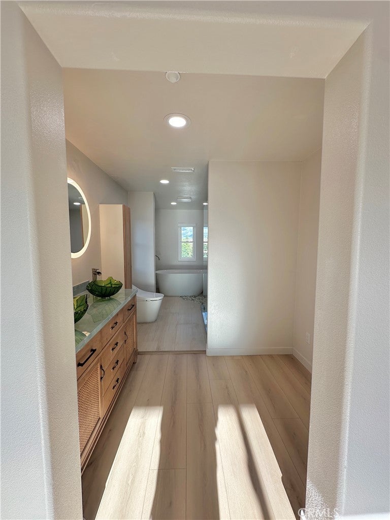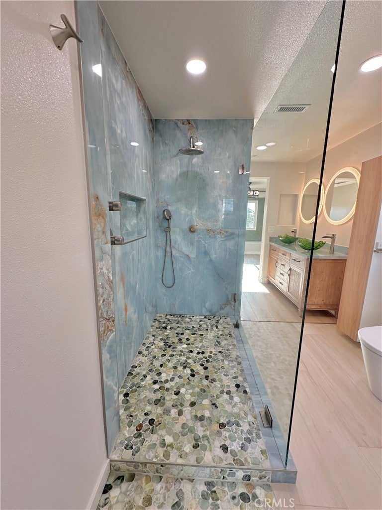 Located within the award-winning Irvine Unified School District, this beautifully remodeled tri-level home offers an ideal blend of space and modern comfort. The entry level welcomes you with a versatile den-perfect for a home office, library, studio, or creative retreat—enhanced by custom floor-to-ceiling hardwood built-in shelving. A convenient half bath and direct access to the attached two-car garage complete this thoughtfully designed first level.The second level floor showcase luxury vinyl plank flooring and a fully remodeled kitchen crafted with hardwood cabinetry,eco-friendly bamboo countertops,and a beautiful stainless steel Kraus sink. Recent appliance upgrades include a suite of Samsung products—refrigerator, dishwasher, washer and dryer, electric induction stovetop/oven range with built-in air-fryer, and range hood—along with a new garbage disposal. A newly installed 240V outlet powers the stove.The switch can also be used to support an electric vehicle charger, providing built-in flexibility for future EV needs. Completing this level is a well-appointed bedroom and full bathroom,along with an indoor laundry area and generous storage space,providing flexibility for guests/extended family.The upper level is dedicated to private living, highlighting a primary suite that captures picturesque mountain views that greets you at dawn and lingers into the night, offering a peaceful backdrop that enriches both morning and evening routines. The spa-inspired bath is curated with all Kohler components,meticulously designed with dual vanities,a glass-enclosed shower,and a deep freestanding soaking tub. A secondary bedroom is also on this floor,adding balance and functionality while preserving privacy. In September 2024, the property received a new Lennox CBA38MV air handler and AC unit, a Navien NPE-210A tankless water heater, and a five-stage Evince Insight whole-house water filtration system. Additional enhancements include all-new windows throughout the home and garage, featuring sound-dampening glass in the primary bedroom and bathroom. Nearly every major system in the home has been recently upgraded,providing long-term peace of mind and exceptional value at this price point!!Residents enjoy access to community amenities,including a swimming pool,clubhouse,and a park. With extensive upgrades, premium materials, and refined design throughout, this home presents a rare opportunity to own a modern turnkey residence in one of the most desirable communities.