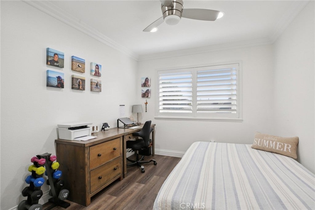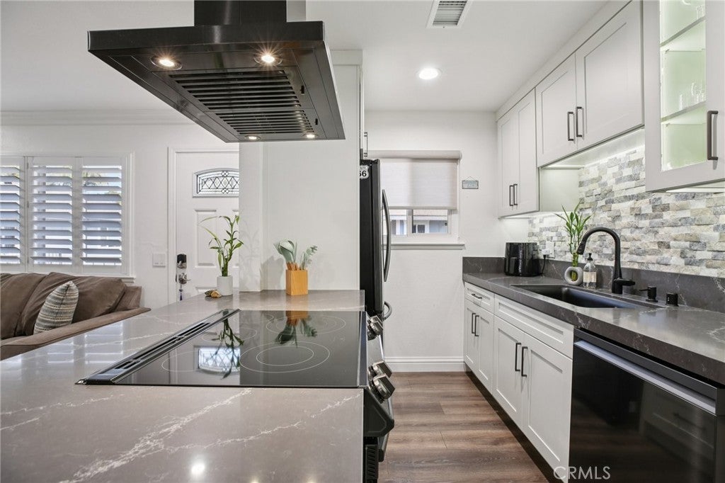 Welcome to Harbor Heights Villas, a beautifully maintained coastal community just minutes from Sunset Beach, Bolsa Chica Wetlands, and the scenic trails and waterways of Huntington Harbour. This upgraded 2-bedroom, 1-bath upper-level end unit offers modern style and comfortable living in one of Huntington Beach’s most desirable neighborhoods. The home features wide-plank flooring, plantation shutters, recessed lighting, and an open-concept layout filled with natural light. The remodeled kitchen includes updated cabinetry, sleek stone countertops, a designer tile backsplash, and a breakfast bar that flows seamlessly into the living and dining areas. The bathroom has been thoughtfully renovated with contemporary finishes, tile detail, and a glass-enclosed shower. Both bedrooms are spacious with ample closet storage and ceiling fans. Additional highlights include a private balcony entrance area, access to the community’s serene greenbelts, and a shared garage with one dedicated parking space plus additional community parking. Conveniently located near shopping, dining, everyday amenities, and some of the area’s best outdoor recreation. A fantastic opportunity to own a turnkey home in a highly sought-after Huntington Beach enclave.