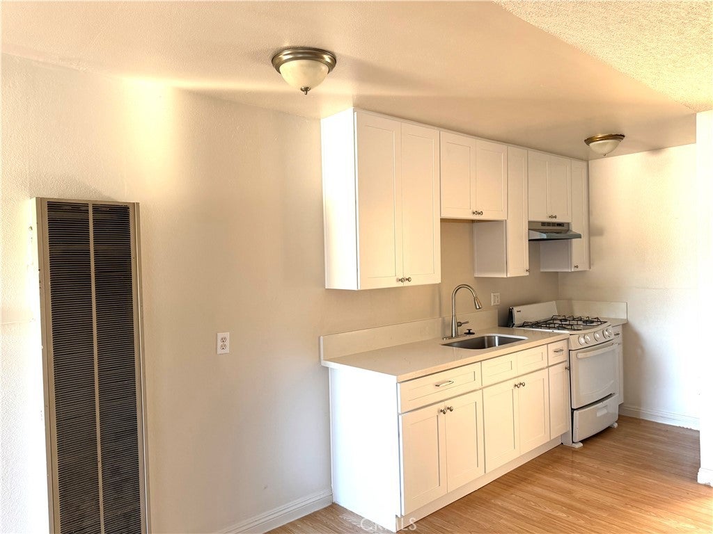 This bright updated home is on a lot with another house in front. It is a second floor home above a garage, a separate building behind the front house, with exterior covered stairs. No one above or below or attached on the sides. Three bedrooms, with two updated en suite baths. Small remodeled kitchen open to living room. Lots of windows make it bright and cheery. Large linen closet in hallway. Play area below has just been seeded for grass and there is a covered patio area for barbecues and entertaining. Yard is not fully fenced. There is one designated parking space plus street parking, but no garage. The home can be accessed from Erna or from the alley behind it.