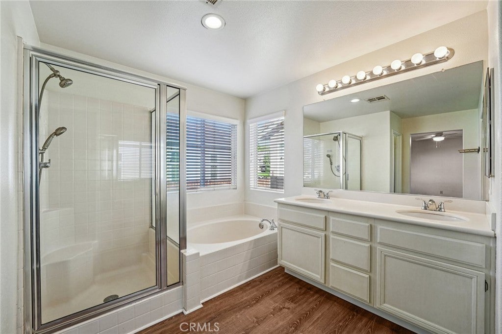 Turn Key 3 bed, 2.5 bath home is ready to be made yours and is located in the Rancho Bella Vista community! Offering great curb appeal, an attached 2-car garage, a covered porch area to enjoy, and leased Solar Panels. Also, the interior is spacious with almost 2,000 sqft of living space, high ceilings, recessed lights, carpet, and tile flooring. Enter into the formal living room and dining room which flows into the family room with fireplace and sits just off of the kitchen with granite countertops, on-trend dual-color white and blue cabinetry, with center island, and a pantry. All 3 bedrooms are located on the 2nd floor including a bonus loft area. The large primary suite features a private ensuite with dual sinks, a soaking tub, and a separate shower. There is also a full-size hall bathroom for the 2 secondary bedrooms, and a half bathroom for guests. Enjoy the fully fenced backyard with grass and concrete areas, a gazebo to relax under, and plenty of space to make your own! Conveniently located near schools, trails, shopping, dining, and not far from the 215 and 15 Fwys! Schedule your tour today!
