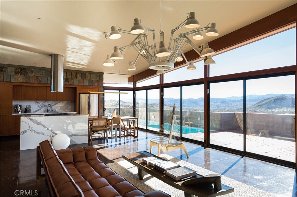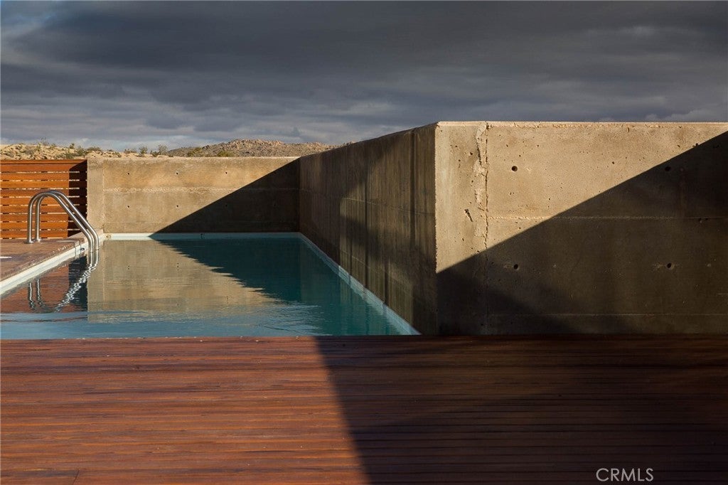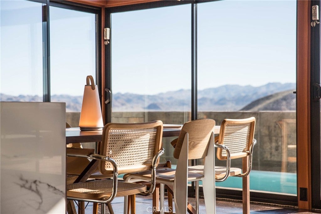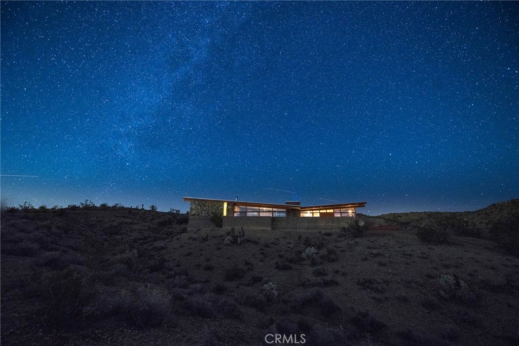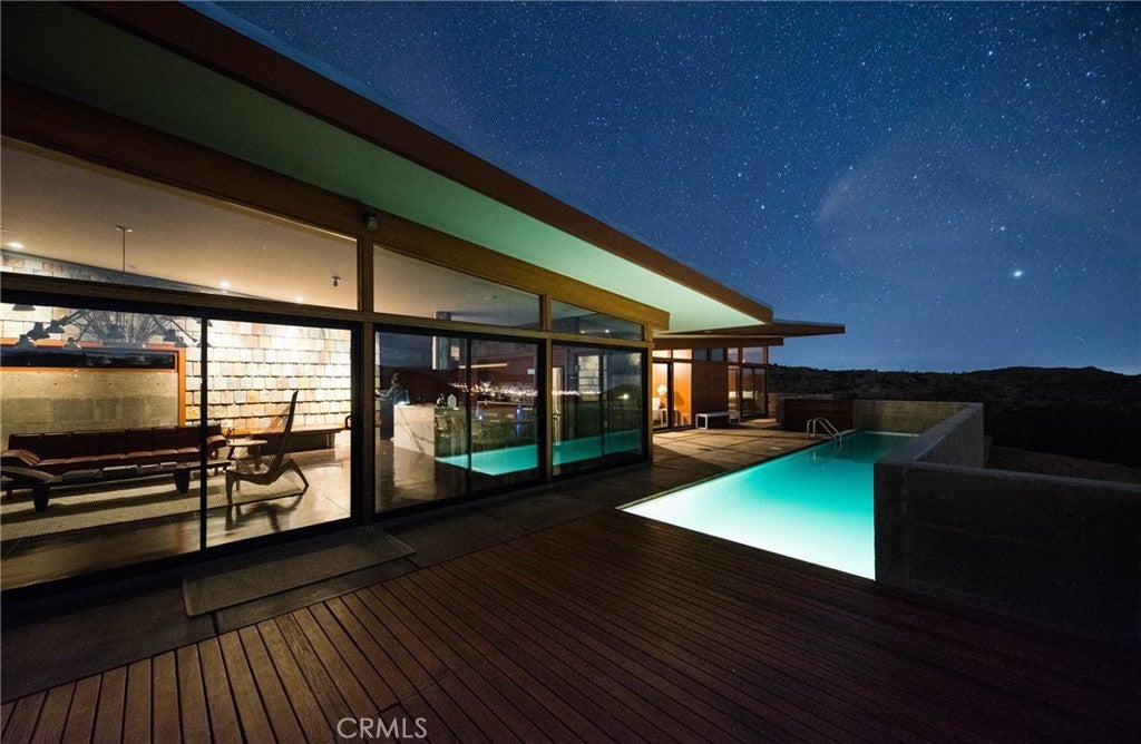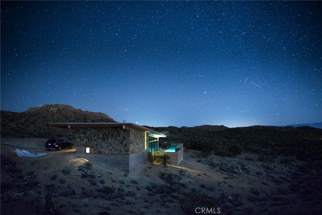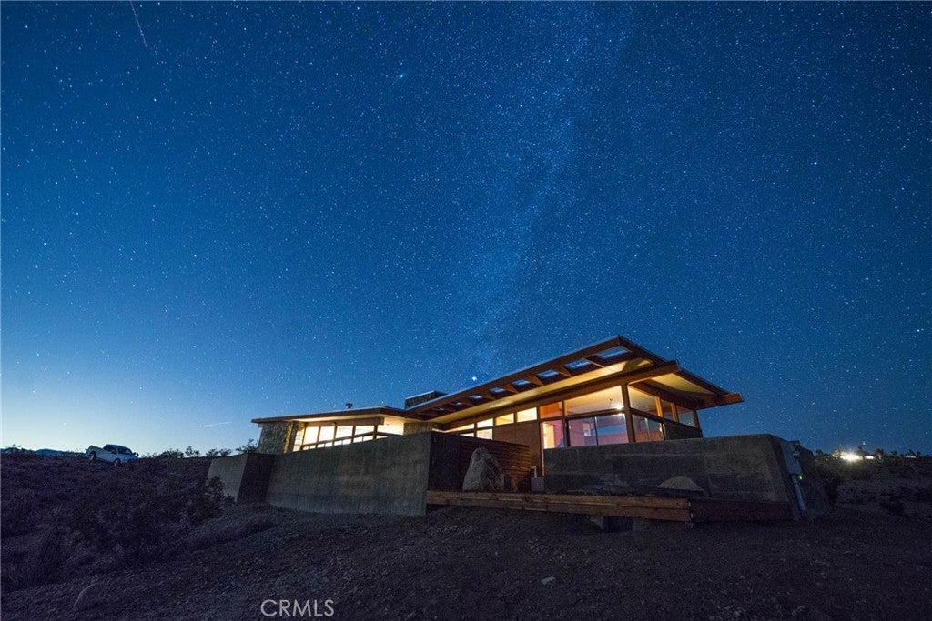 This beautifully maintained modern residence is nestled in the serene hills of Yucca Valley, offering abundant natural light and a peaceful desert setting. Expansive floor-to-ceiling windows create a seamless indoor-outdoor connection, filling the home with bright, airy ambiance throughout the day. The property provides exceptional privacy while remaining conveniently close to shops, restaurants, and Joshua Tree National Park—an ideal location for a desert retreat or full-time living. Blending modern design with clean architectural lines, the home features a thoughtfully designed entry foyer that sets an impressive tone upon arrival. The open-concept layout allows the interior spaces to flow effortlessly, combining comfort, style, and a sense of privacy. Every room captures stunning views—towering mountain ranges and Joshua Tree National Park by day, and the sparkling lights of downtown Joshua Tree by night. A private outdoor terrace with a heated pool and generous deck space offers the perfect setting for relaxation, entertaining, or enjoying the surrounding desert landscape. Meticulously cared for and move-in ready, this residence stands as a rare architectural offering in the high desert. Whether used as a primary home, a vacation getaway, or a high-performing short-term rental, the property presents outstanding potential and exceptional value. A unique opportunity to own a refined, distinctive home in one of the most desirable areas of the high desert.