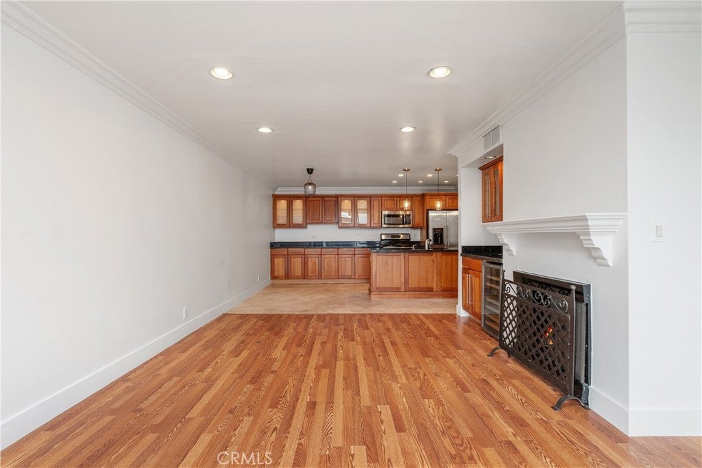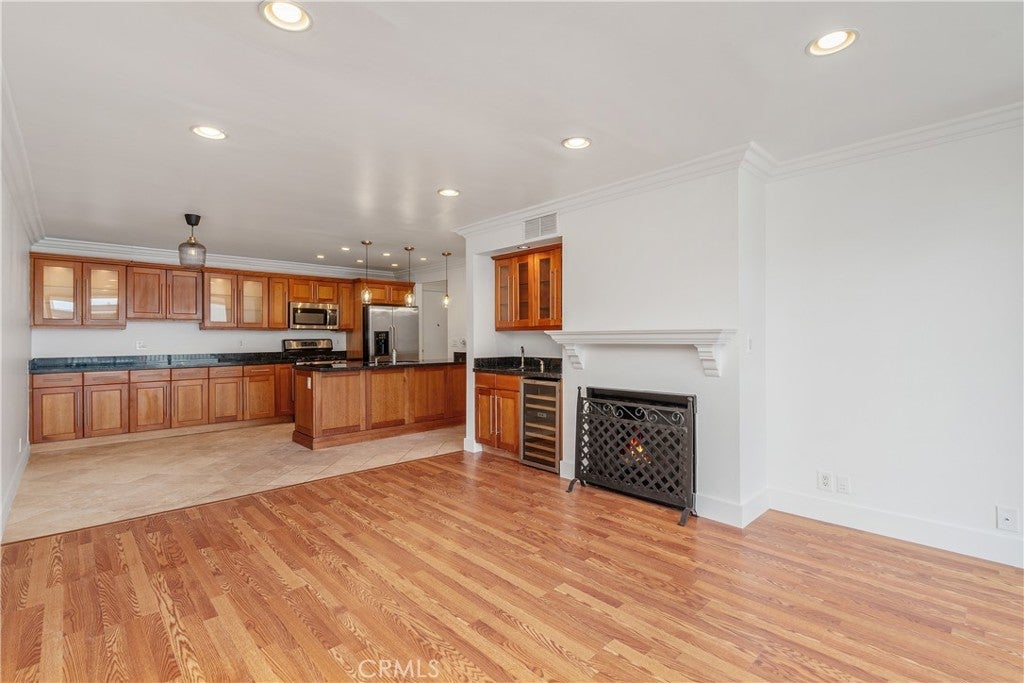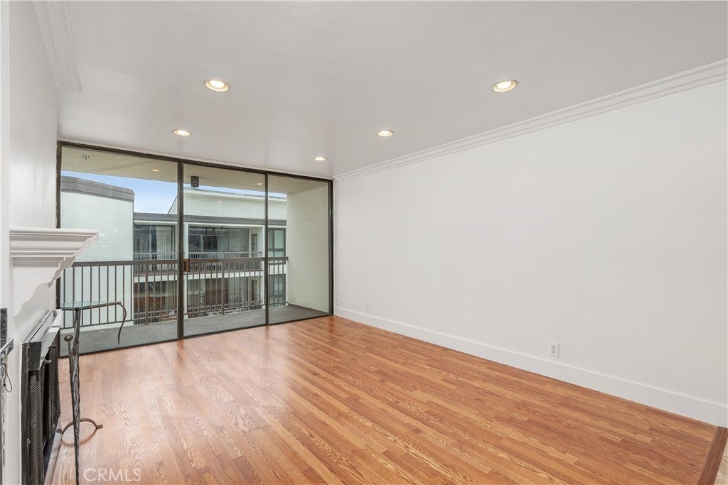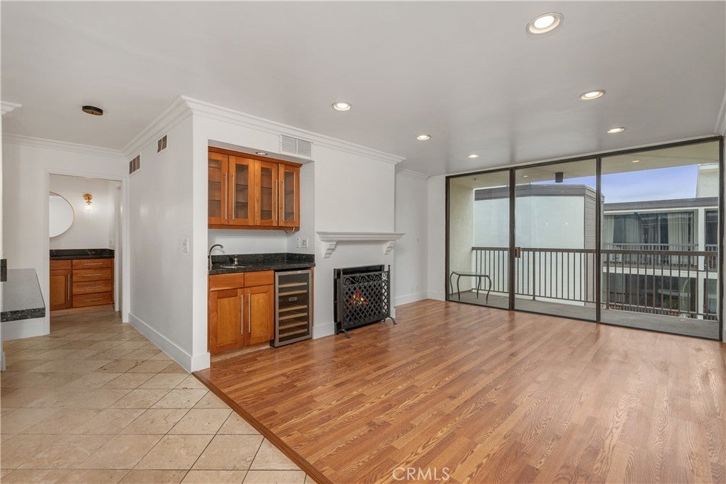 Welcome to your sun-drenched West Hollywood dream home! Perched on the top floor with coveted southwest exposure, this stunning penthouse retreat is flooded with beautiful natural light from dawn to dusk, creating the most inviting atmosphere you could imagine.Step inside and feel instantly at home. The open-concept living space welcomes you with a perfect blend of modern hardwood-style flooring and warm stone tones that flow seamlessly throughout. A contemporary fireplace adds cozy ambiance, while thoughtful touches like recessed lighting and a sleek stainless-steel wine refrigerator elevate everyday living to something truly special. The expansive living room opens gracefully to your private balcony overlooking the sparkling pool—imagine starting your mornings with coffee here, or unwinding as the sun sets over West Hollywood.The chef's kitchen is where memories are made! Anchored by a generous island with gleaming granite countertops, it features top-quality stainless steel appliances and abundant cabinetry. Whether you're preparing an intimate dinner or hosting a festive gathering with loved ones, this kitchen makes every occasion feel effortless and joyful.Your serene bedroom sanctuary offers both a spacious walk-in closet and an elegant sliding glass wardrobe—room for everything you love. The spa-inspired bathroom is your personal oasis, featuring a stylish vanity, a luxurious rain shower system, and invigorating body jets that transform your daily routine into pure relaxation.Nestled on the beautiful, tree-lined Kings Road, you're perfectly positioned near the excitement of Melrose Avenue and Santa Monica Boulevard—world-class dining, shopping, and entertainment just moments away—yet your home feels like a peaceful escape from it all.This impeccably maintained community embraces you with resort-style amenities: a fully equipped fitness center, a sparkling pool for those perfect LA days, convenient on-site laundry, and secure gated parking with your own designated spot included. This is the rare find you've been searching for—a home that beautifully balances vibrant urban energy with tranquil, peaceful living.
