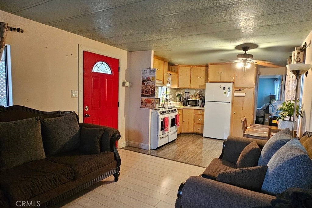 As you enter, the living room sits to the right, filled with natural light from windows. Straight ahead is space for a cozy dining area, while to the left you’ll find the kitchen, complete with cabinets, stove, refrigerator, and a sink by a window looking outside. Past the kitchen, a short hallway leads to the bathroom and the spacious bedroom, which features windows that bring in plenty of sunlight, creating a bright and comfortable retreat. Outside, enjoy ample outdoor space- perfect for relaxing, gardening, or enjoying the outdoors. This is the perfect opportunity for a new owner to add their own personal touches over time, making it their own.