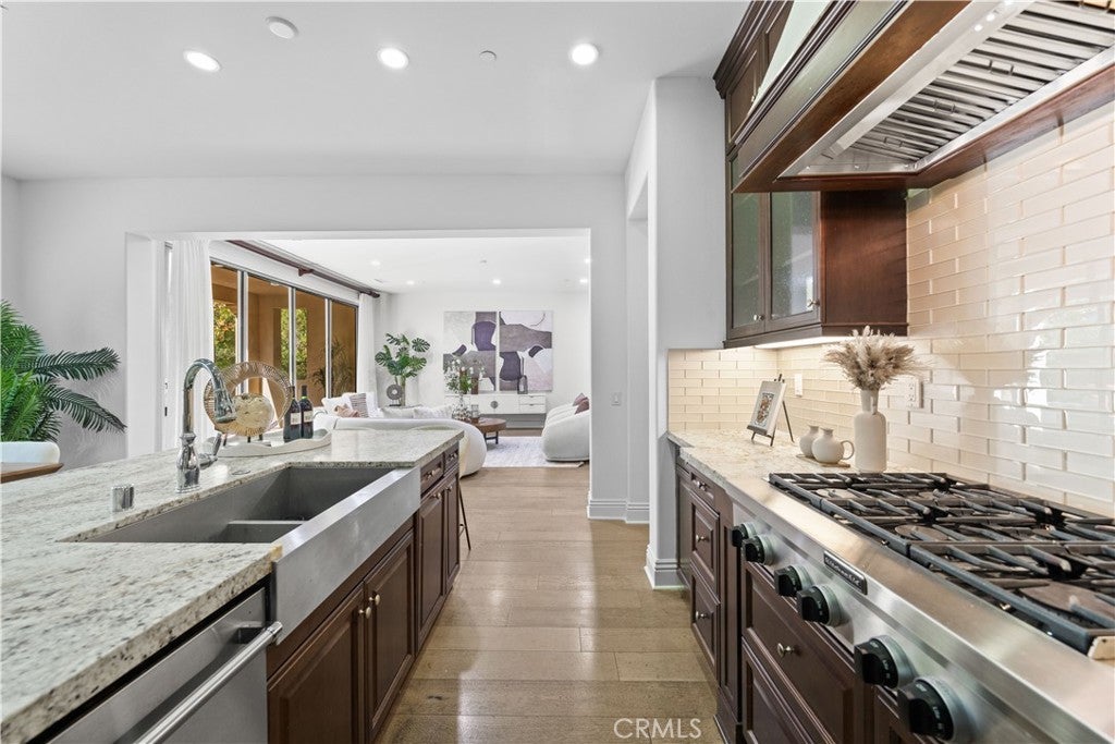 Located within the highly sought-after Greenwood at Tustin Legacy community, this stunning 6-bedroom, 5.5-bathroom home offers expansive living space in a lively, family-friendly neighborhood. 3 mins driving to Costco, 99 Ranch Market, and The District shopping center. 10 mins to UCI, and 20 mins to the beach. The flexible floorplan boasts two primary bedrooms, one of them is on the 1st floor, designed as an ideal 'In-Law' suite featuring its own dedicated living room. The downstairs primary bathroom provides a luxurious retreat with his-and-her vanities, a separate soaking tub, and a large steam glass shower. The second master bedroom is upstairs with an oversize balcony that brings you the perfect summer breeze. It has a fully remodeled bathroom, with a modern color scheme, dual sinks, a standalone soaking tub, and a glass shower. The interior is designed with warm, inviting tones, complemented by modern features and hard flooring throughout. The windows are further enhanced with elegant custom shutters, providing excellent light control and privacy.The gourmet chef's kitchen is equipped with stainless steel appliances and features an expansive layout, perfect for preparing meals for a large family. Broker and broker's agents do not represent or guarantee accuracy of the square footage, bedroom / bathroom count, lot size, and/or any other information concerning the conditions or features of the property. Buyer/Tenant is advised to independently verify the accuracy of all information through personal inspection & with appropriate professionals to satisfy themselves.