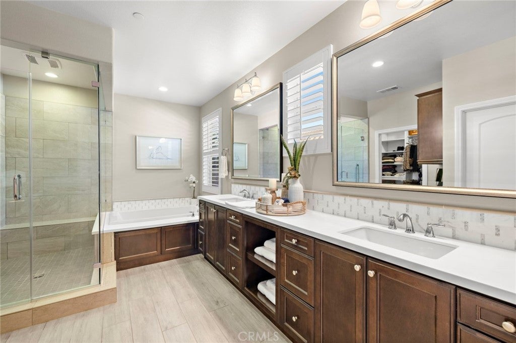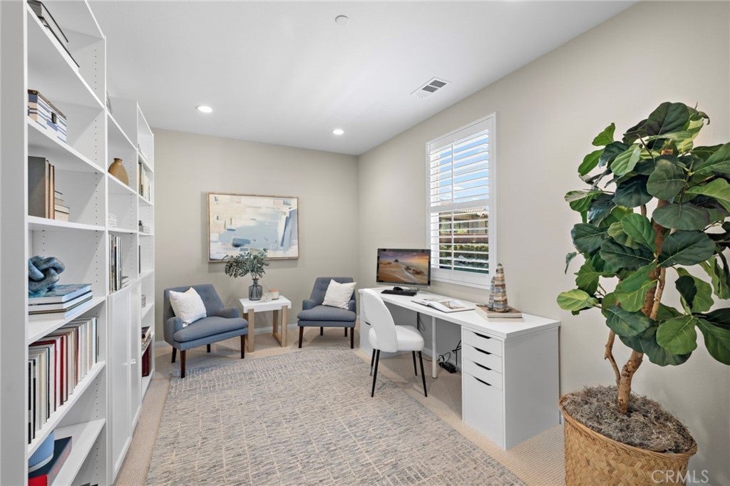 Welcome to this beautifully upgraded single-story home, in the coveted 55+ enclave of Avocet, ideally situated on an oversized, private lot. Offering two bedrooms, two full bathrooms and an office or flex room, this residence is designed for easy living and effortless entertaining. Inside, the open-concept floor plan features a striking built-in media wall with generous storage, plantation shutters, and a spacious dining area. The chef’s kitchen showcases upgraded stainless steel appliances, granite countertops, a convenient wine refrigerator, and a full wall of pantry cabinets with roll-out shelving. The serene primary suite offers a beautiful view of the expansive backyard and includes a spa-inspired ensuite bath with an oversized soaking tub, a frameless glass shower, and a walk-in closet with premium custom shelving. A comfortable guest bedroom and a spacious home office provide flexibility for hosting or working from home. Step outside to your private backyard retreat—complete with lush gardens, custom pavers, a trickling fountain, and a covered pergola with built-in lighting and ceiling fans. Enjoy evenings by the outdoor fireplace, unwind in the above-ground spa, or entertain in the expansive covered outdoor room—this space is designed for both relaxation and gatherings. As part of the award-winning Rancho Mission Viejo community, enjoy access to an array of resort-style amenities: including The Hacienda and The Getaway, offering amenities like a fitness center, saltwater pool, spa, bocce ball court, yoga studio, and cozy fire pits. Experience the perfect balance of comfort, style, and community living—resort life awaits!