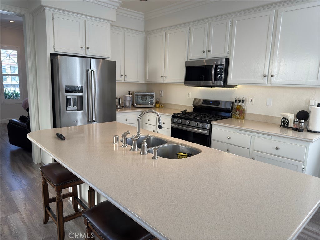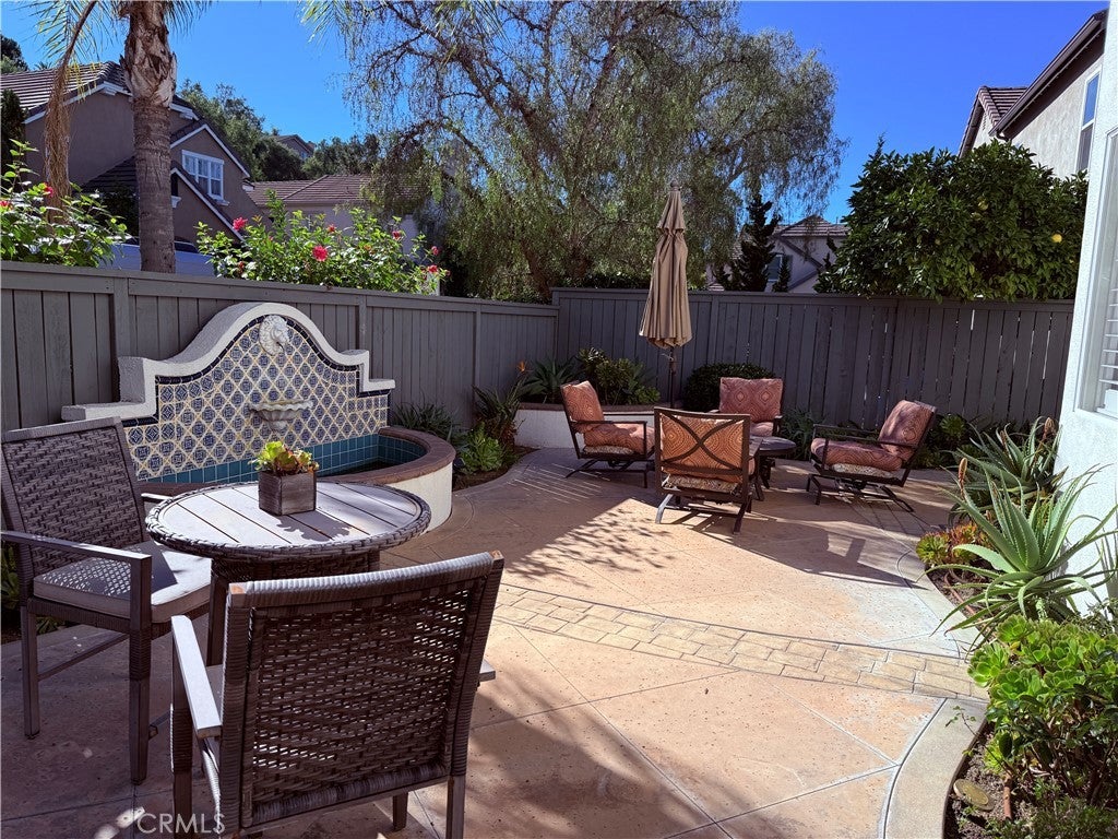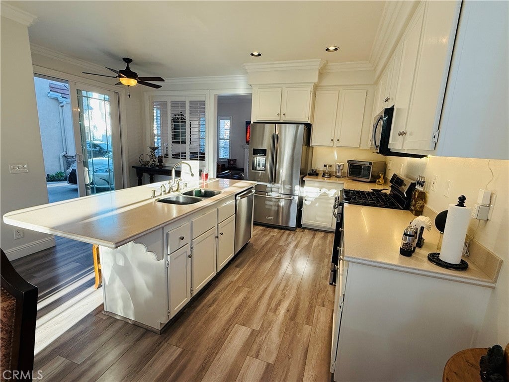 Absolutely stunning, fully upgraded free-standing home offering 4 bedrooms and 2.5 baths, meticulously maintained and located within the highly desirable, gated community of Canterbury. The spacious living room features an upgraded fireplace with hand-set stone ledger and an adjacent dining area, creating a warm and inviting setting. Throughout the home you’ll find new neutral-tone wood laminate flooring, plantation shutters, crown molding, recessed lighting with dimmers, and two sets of French sliding doors that flood the interior with natural light and enhance the open, airy atmosphere. The beautifully upgraded kitchen showcases a large center island with solid Corian countertops, cherrywood-stained white cabinetry, and a stainless-steel Samsung counter-depth French door refrigerator—perfect for both everyday living and entertaining. The downstairs bathroom is tastefully updated with Travertine tile flooring, a quartz countertop, and a modern rectangular sink. Upstairs, the loft features a custom-built office area with bookshelves, ideal for working from home or studying. All bedrooms include newer faux wood flooring, ceiling fans, plantation shutters, 6-inch baseboards, and custom closet systems. The spacious primary suite is highlighted by crown molding, upgraded recessed lighting, and a large walk-in closet with custom organizers. The primary bathroom offers new vanity lighting, dual sinks, Travertine flooring, a jetted Jacuzzi tub, and a separate stall shower. Additional features include a dedicated laundry room with sink and upper and lower cabinetry. The expansive wrap-around backyard is beautifully landscaped with newer redwood fencing, stucco planter boxes, flowering shrubs, and a charming fountain—an ideal space for relaxing or entertaining. The property also boasts an extra-large driveway and a spacious lot size,and PEX piping throughout house .Conveniently located near a wide array of parks, restaurants, and entertainment options. This truly exceptional home is a must-see