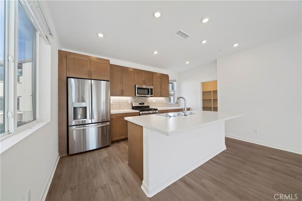 New Tri Pointe Home ready for a quick move-in. This home includes a new refrigerator in the kitchen along with window treatments throughout. This paired Residence 2 duet home features a fenced front patio (not all sites offer), 2 car side x side attached garage with increased depth plus 3 Beds/2.5 Baths. An impressive Great Room/Dining/Kitchen area is complemented by a balcony that expands upon the outdoor/indoor dynamic. Walking Distance to newest pool/exercise room, with additional Hudson House facilities, as well as Bedford Marketplace, Starbucks, EOS Fitness. Transportation corridors (15, 91) also make the Inland Empire and Orange County accessible.
