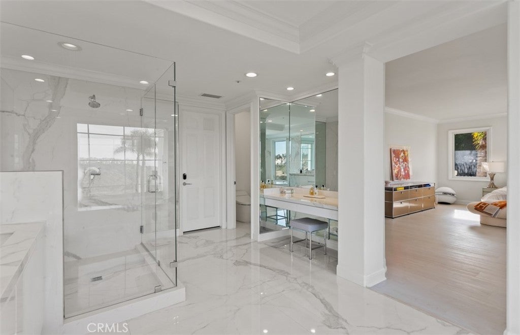 Built-in Features, Crown Molding, Eat-in Kitchen, High Ceilings, In-Law Floorplan, Open Floorplan, Stone Counters, Recessed Lighting, Storage, Bedroom on Main Level, Primary Suite, Walk-In Closet(s)