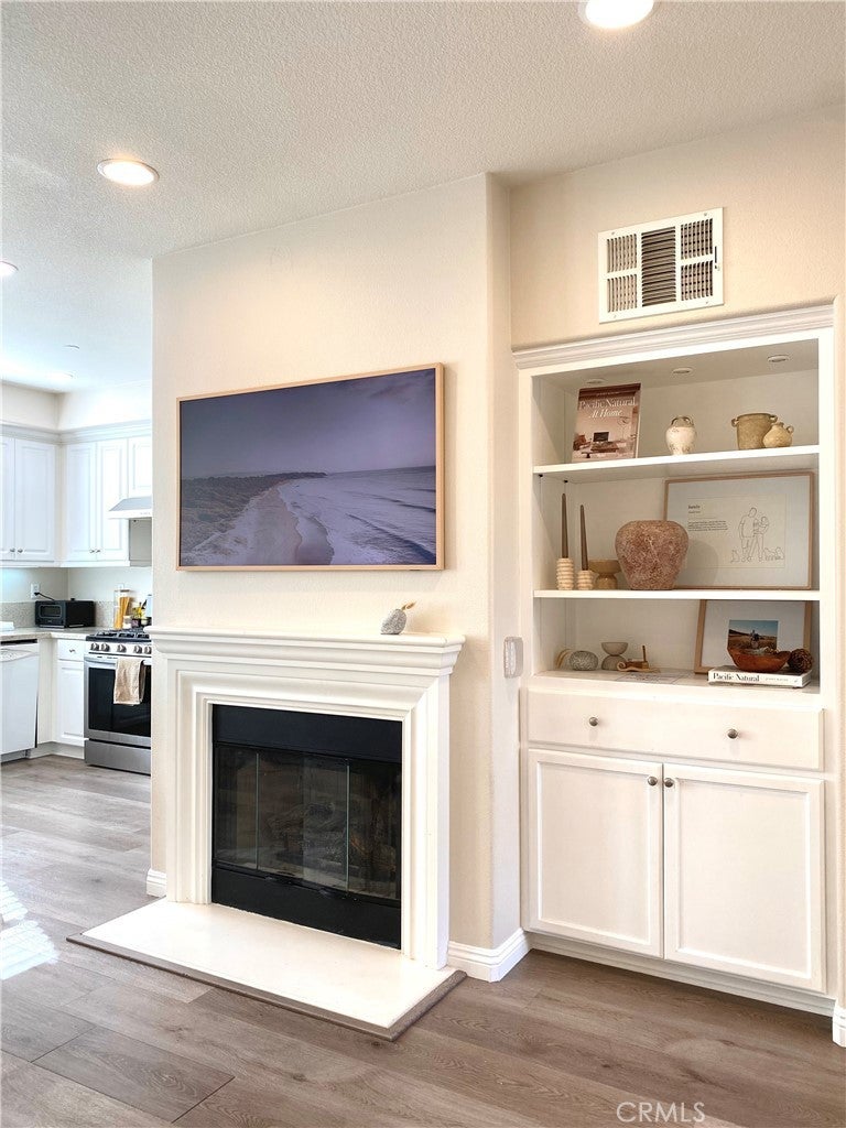 Charming Cambridge Lane condo located in the highly sought-after Columbus Square neighborhood of Tustin Legacy. Ideally positioned just steps from the Village of Tustin Legacy Shopping Center, offering convenient access to Stater Bros, Dunkin’, Jamba, Burger Boss, and more. This William Lyon–built residence features 2 bedrooms, 2.5 bathrooms, and 1,324 square feet of thoughtfully designed living space across a desirable three-level floor plan. The home showcases beautiful wood-style laminate flooring throughout, providing a stylish yet low-maintenance lifestyle. Enter through the inviting private courtyard with direct access to the indoor laundry room and a side-by-side two-car garage equipped with a Tesla electric vehicle charger. The main living level boasts a spacious great room that flows seamlessly into the updated kitchen, complete with newer quartz countertops, crisp white cabinetry, recessed lighting, a gas fireplace, and a rare walk-in pantry. The upper level hosts two well-appointed bedrooms, including a primary suite with a walk-in closet and upgraded quartz bathroom countertops, along with a secondary bedroom and full bath. Residents enjoy a true resort-style and community-focused lifestyle, with amenities including a clubhouse, Junior Olympic pool and spa, fitness center, three playgrounds, and frequent neighborhood events that bring the community together. The home is zoned for Legacy Magnet Academy and Heritage Elementary School and is just a short walk to the new Veterans Sports Park. Turn-key, ideally located, and rich in amenities—this is Tustin Legacy living at its best.
