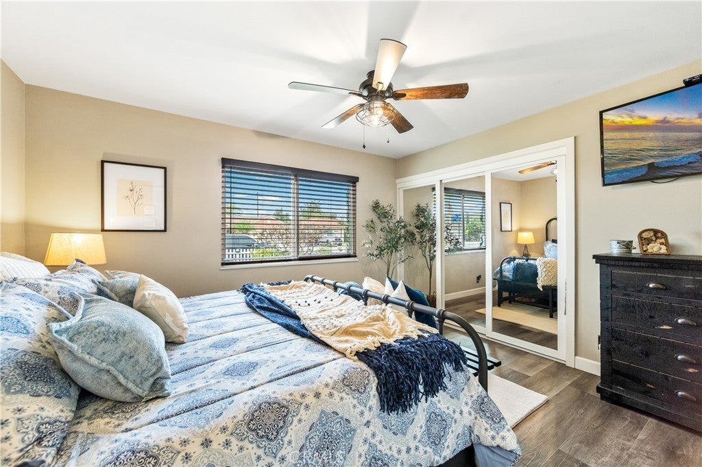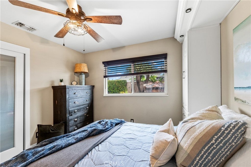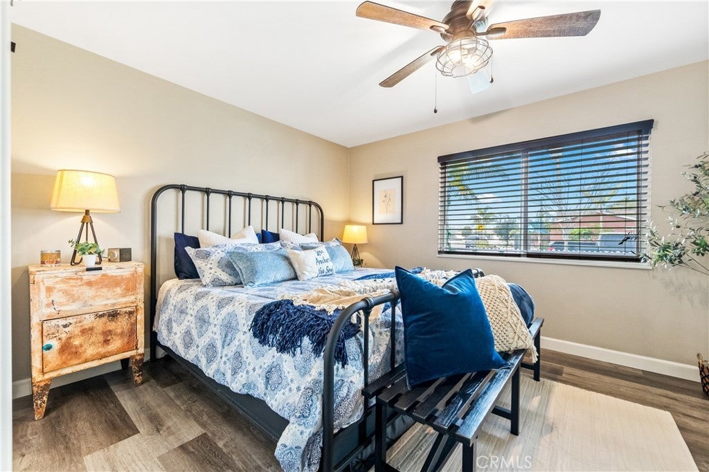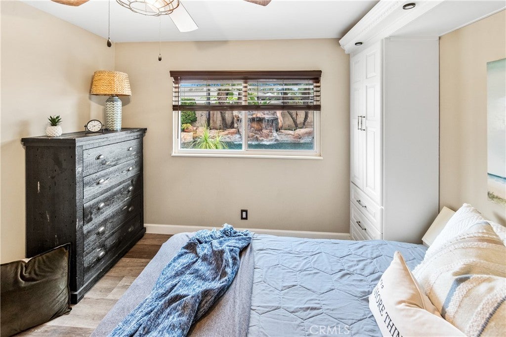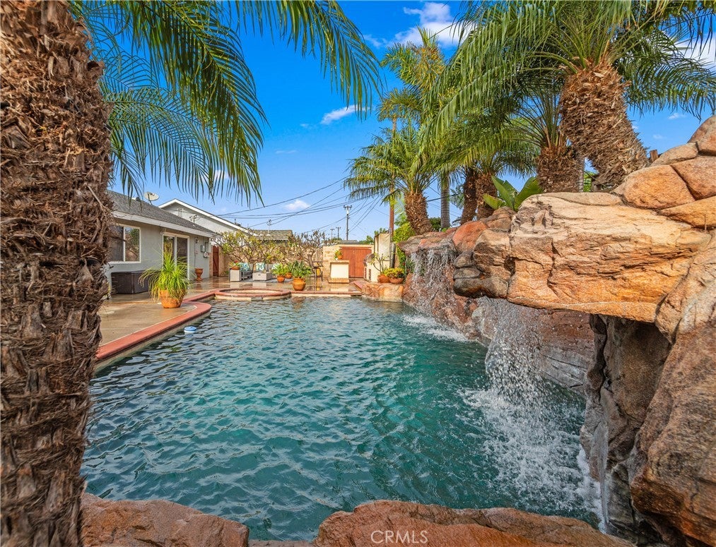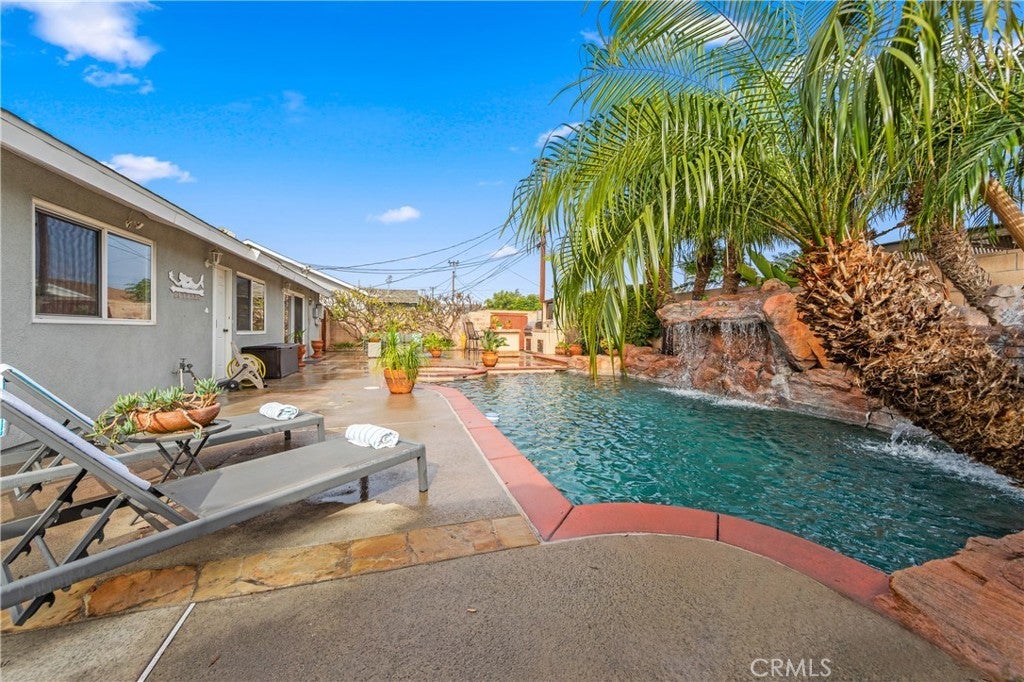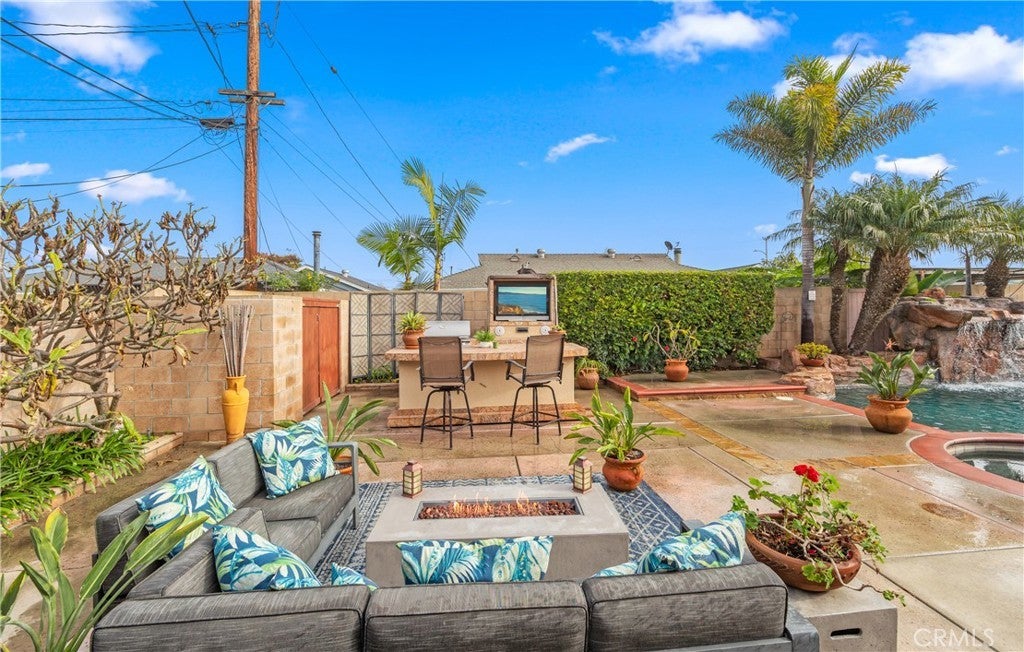 Welcome to this beautifully updated home set on a quiet cul-de-sac, with an oversized corner lot of 7,000 sq ft. The west-facing front yard is beautifully fenced in, the perfect place for pets, kids, and friends to gather and enjoy our amazing Huntington Beach weather. A brick-paved front porch sitting area is the sweetest spot to catch a picturesque Sunset. There are four spacious bedrooms and an open-concept living space that leads to the resort-style backyard. The home flows effortlessly. A wall has been thoughtfully removed to create a spacious flow between the living, dining, and kitchen areas. The updated kitchen features cream-toned cabinetry with detailed trim, stainless steel appliances, ample storage, and direct garage access. The dining area comfortably fits a full-size table with plenty of space for entertaining. A large sliding door opens to the resort-style backyard, your own tropical retreat. The large, private lot provides space for a lovely, comfortable sitting area adjacent to the outdoor kitchen. Parallel counters create a cook's workspace with a BBQ and refrigerators, backed by a fantastic outdoor TV space. Epic spot to watch a game while entertaining your favorite people, relaxing by the pool and spa as you listen to the cascading waterfall. The backyard is very private and is ideal for year-round gatherings. The pool equipment is neatly tucked in behind a gate. A safety pool net is stored in the shed and work area located on the southwest corner of the backyard. An additional seating area provides a quiet, private retreat and is also the perfect workspace for household projects. There are four wonderful bedrooms. The primary suite features an updated bath and a large west-facing window that frames the beautifully fenced front yard—ideal for kids, pets, or morning coffee in the sunshine. The third bedroom offers direct access to the pool, perfect for guests seeking a seamless indoor/outdoor flow. The fourth bedroom includes a built-in Murphy bed and custom cabinetry, allowing the room to transform instantly from guest space to office or craft room. The second bedroom faces the beautiful front yard and is currently set up as an office. The perfect location, near shopping, dining, freeway access, and just 10 minutes to the beach. Completely move-in ready, thoughtfully maintained, and located on a charming residential block, this home brings comfort, fun, and coastal living together. The ideal home to create new memories.