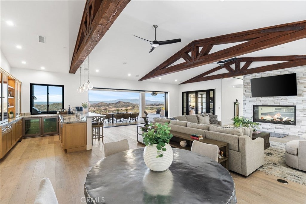 Beamed Ceilings, Wet Bar, Breakfast Bar, Built-in Features, Balcony, Breakfast Area, Ceiling Fan(s), Cathedral Ceiling(s), Separate/Formal Dining Room, Eat-in Kitchen, High Ceilings, In-Law Floorplan, Living Room Deck Attached, Open Floorplan, Pantry, Quartz Counters, Stone Counters, Recessed Lighting, Storage, Sunken Living Room, Bar