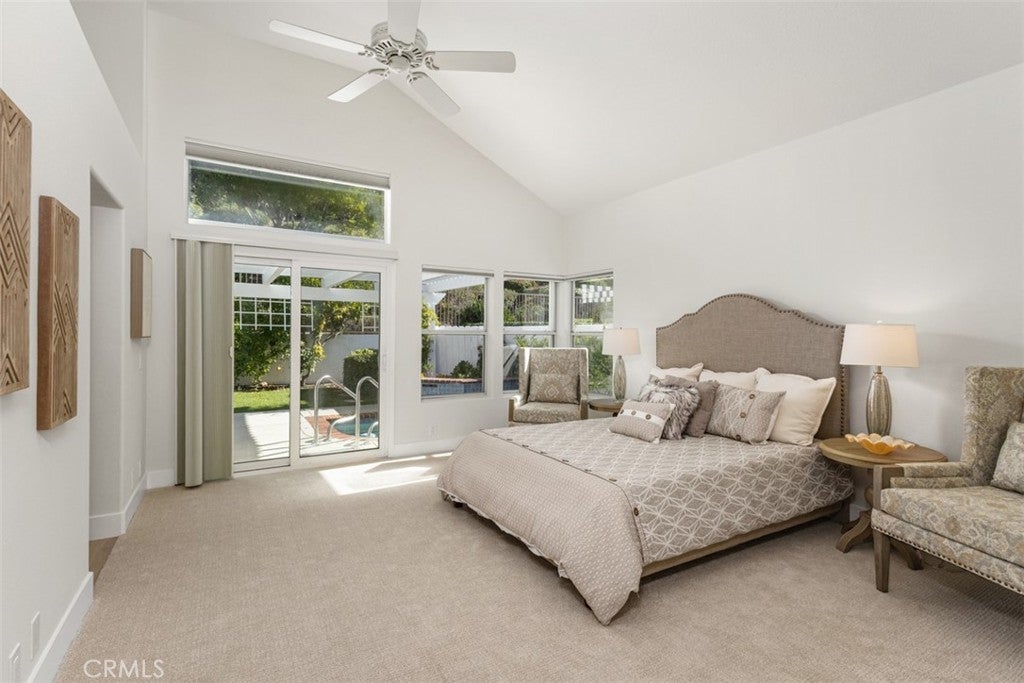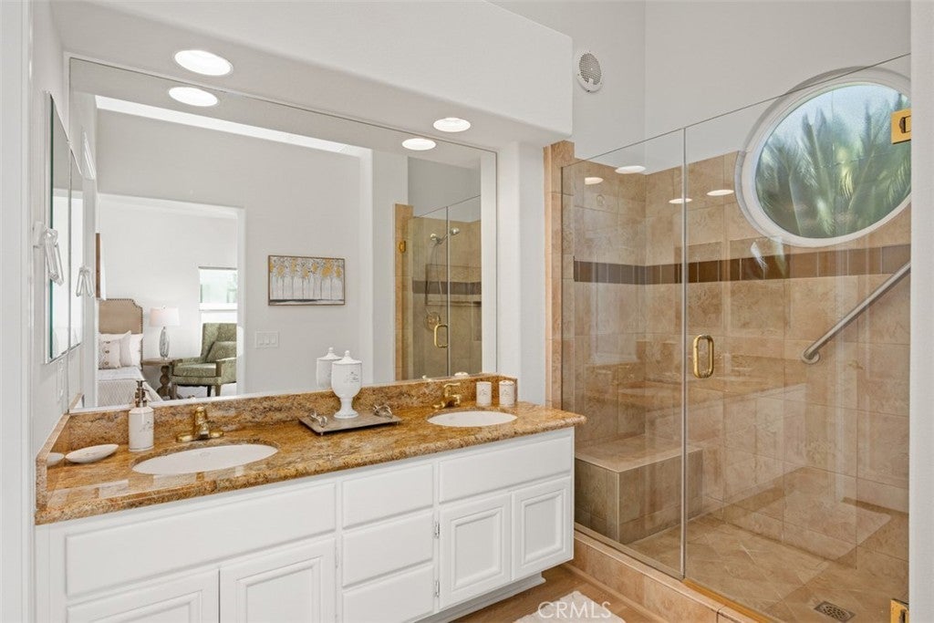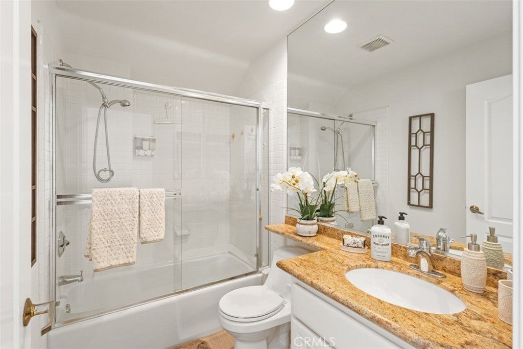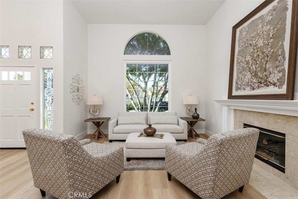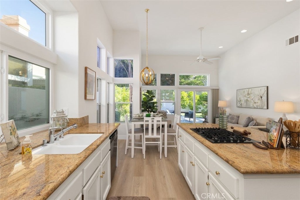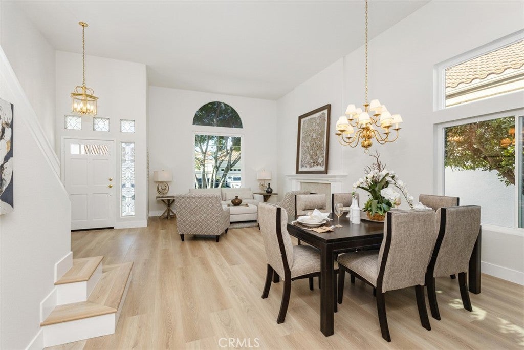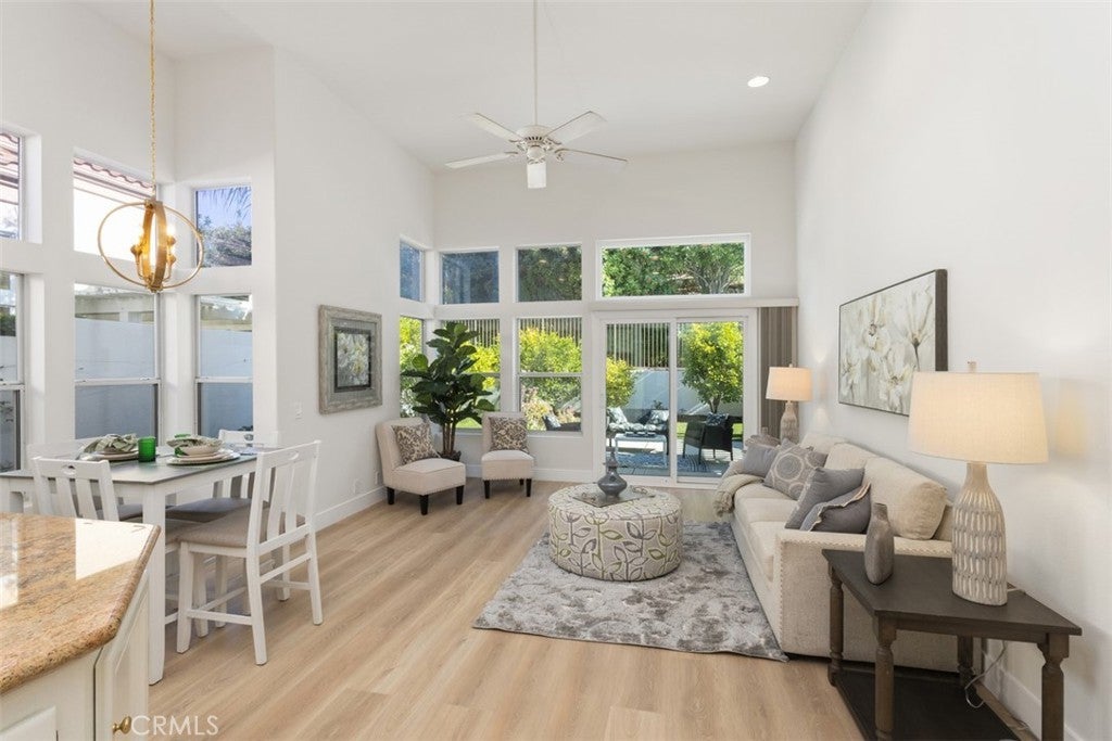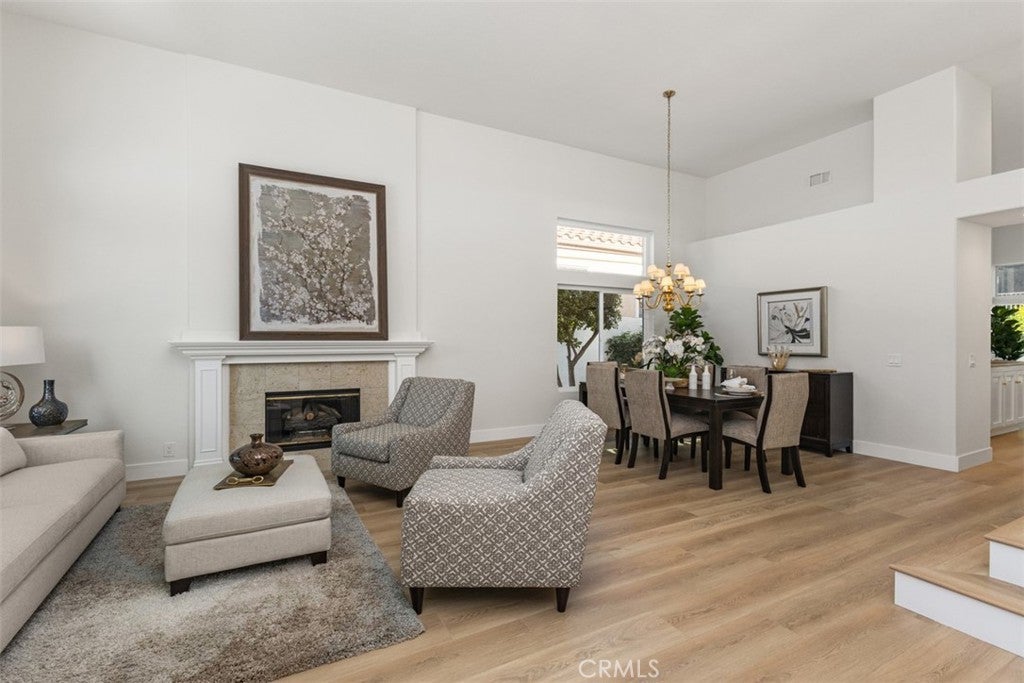 Welcome to this inviting 2,045 sq. ft. residence located in the highly sought-after 55+ gated community of Palmia. From the moment you enter, you are greeted by a warm and welcoming foyer with soaring vaulted ceilings that showcase the home’s spacious, thoughtfully designed layout. Recent upgrades include luxury plank vinyl flooring and oversized baseboards, creating a seamless and stylish flow throughout. The main level is ideally designed for convenience, featuring both a primary bedroom and a secondary bedroom. Upstairs, a versatile ensuite loft offers the option of a third bedroom if enclosed, complete with a walk-in closet and an open view to the first floor, enhancing the home’s airy and open feel. The living room, highlighted by vaulted ceilings and a cozy fireplace, flows effortlessly into the dining area—perfect for entertaining. The kitchen continues the sense of openness with high ceilings and an inviting layout that connects seamlessly to the family room and provides direct access to the backyard. Appointed with granite countertops and a center island with gas cooktop, the kitchen is ideal for both everyday living and hosting. The main-level primary suite features a walk-in closet with an ensuite bathroom with granite countertops, dual sinks, and a spacious walk-in shower with bench. The upstairs loft includes new carpeting, a walk-in closet, and a full bathroom, offering a flexible space for guests, an office, or a hobby room. Additional highlights include an indoor laundry room, a garage with extra storage, epoxied pipes, and fresh interior paint. Step outside to a serene backyard featuring a built-in Spa, artificial turf, covered patio and numerous mature fruit trees—an ideal setting for relaxation or entertaining. Residents of Palmia enjoy exceptional resort-style amenities including a clubhouse, pool and spa, fitness center, pickleball and tennis courts, an 18-hole putting green, bocce ball, shuffleboard, and more. Membership to Lake Mission Viejo is also included, offering boating, concerts, and lakeside picnics. This home presents a rare opportunity to enjoy comfort, convenience, and an exceptional active-adult lifestyle.