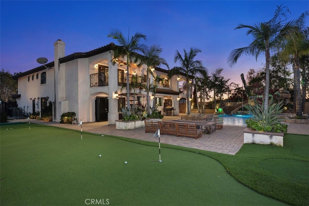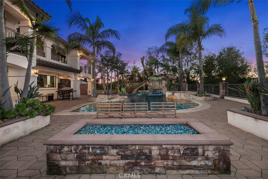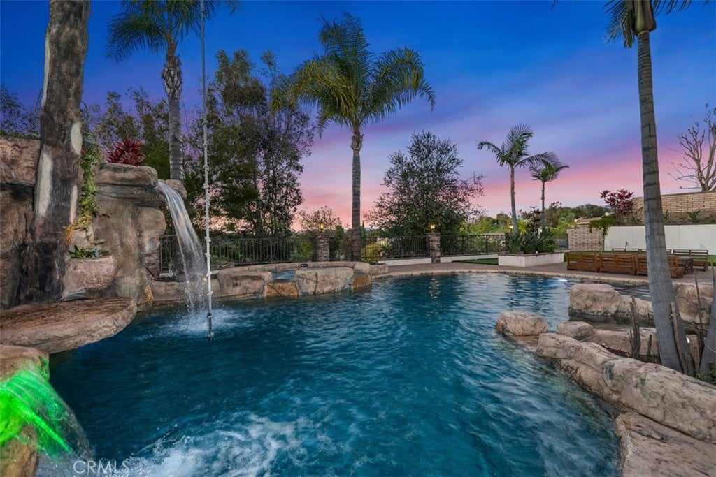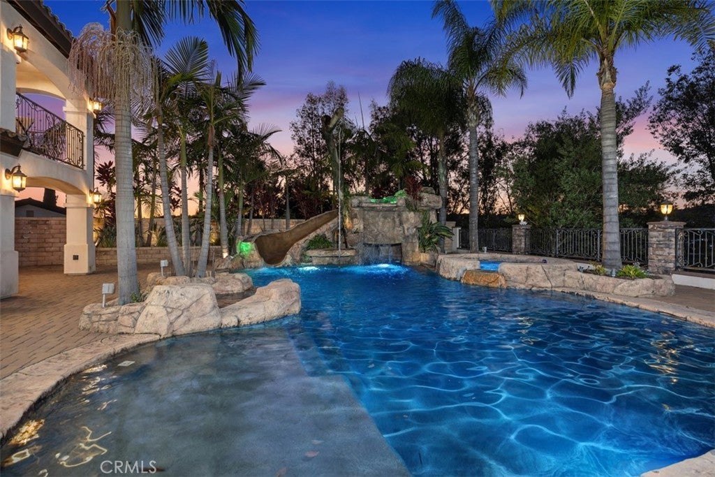 This home lives like a private resort, starting with an incredible backyard designed for year round enjoyment and entertaining. The saltwater pool features a water slide, grotto, swim up table, sun shelf, rope swing and waterfall. A 12 person spa, fire pit, and putting green complete the space, all set against golf course surroundings and beautiful sunset views. Inside, the home has been completely upgraded from top to bottom and features luxury vinyl plank flooring throughout the main living areas with carpet in the bedrooms. A welcoming front courtyard with arched doors opens to a bright two story entry and sweeping wrought iron staircase. The living room features a coffered ceiling and fireplace, while the spacious kitchen is designed for both everyday living and entertaining with a 5 burner Verona gas range, additional oven and microwave, large island, and separate breakfast counter. A full bathroom on the main level adds convenience for guests. Upstairs, the primary suite is a relaxing retreat with a walk-in closet with built-ins, coffered ceiling, crown molding, and private veranda access, ideal for enjoying sunset and golf course views. The ensuite bath includes dual vanities, a jetted tub, and a walk-in shower with rain showerheads and body jets. Also upstairs are four additional spacious bedrooms, including one with a private ensuite bathroom. Two of the secondary bedrooms are located at the back of the home and share veranda access with the primary suite. An upstairs laundry room and two additional secondary bathrooms serve the remaining bedrooms. The three car garage offers even more flexibility with a second laundry hookup area and EV charging outlets, adding convenience and modern functionality. The location is unbeatable! Just a short stroll from Granada Park as well as Sierra Recreation Center with membership options for the pool, spa, water slide, fitness center, and more. Enjoy Lake Mission Viejo, where you can swim, BBQ, fish, or rent boats and paddleboards. Conveniently situated near Mission Viejo Country Club, shopping, dining, the 5 Freeway and both 73 and 241 toll roads, this home is also just a 10–15 minute drive from world-class destinations like Laguna Beach, Dana Point Harbor, and more! Inquire for more information about MULTIPLE SCHOOL OPTIONS unique to this neighborhood! Welcome Home!