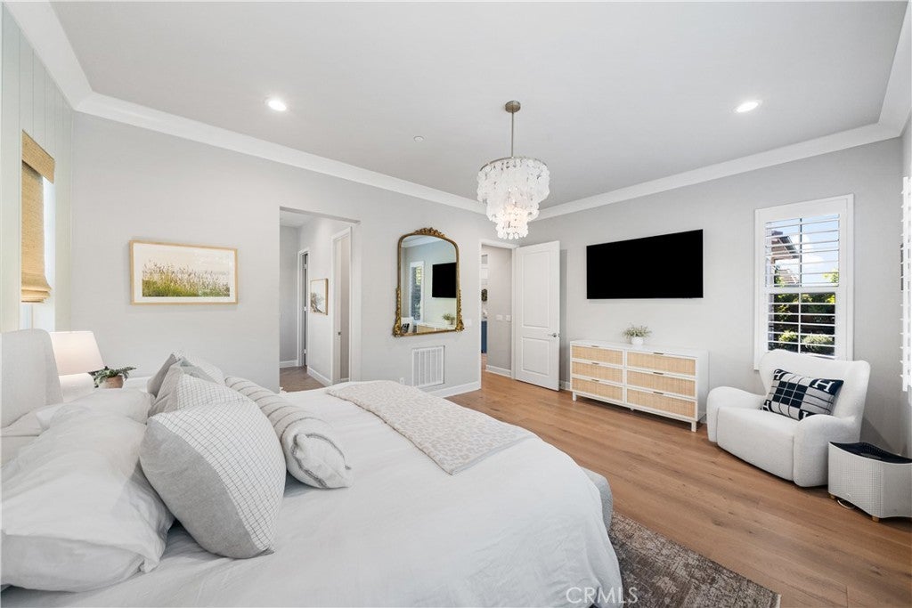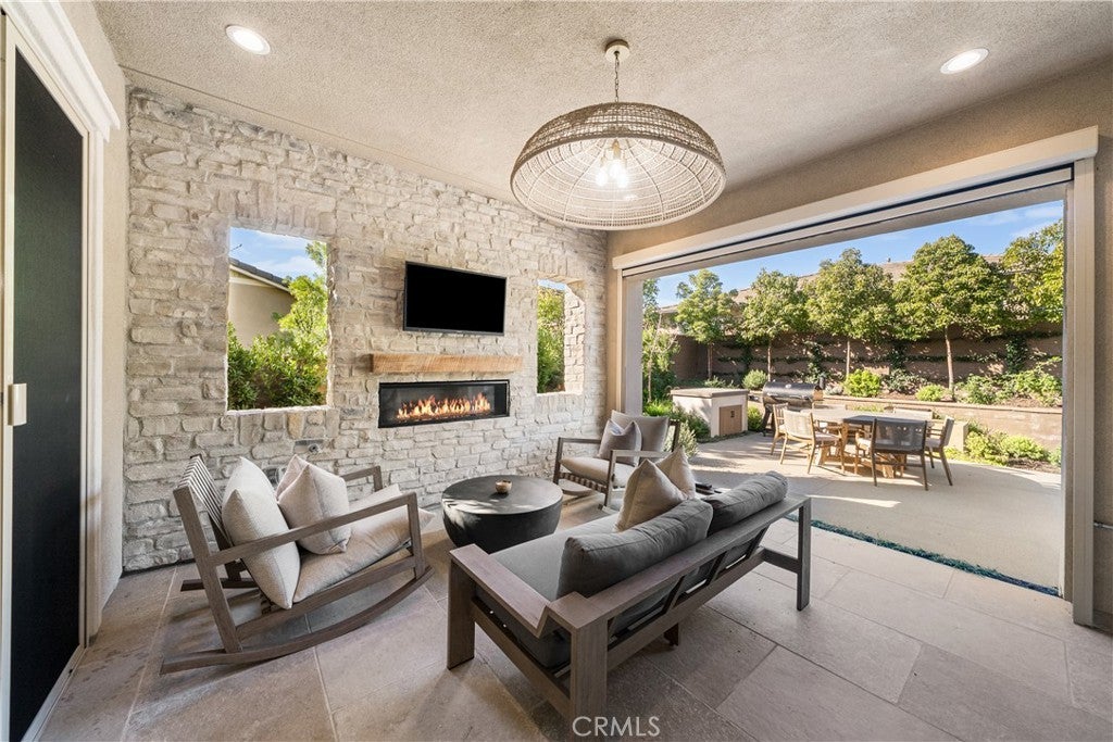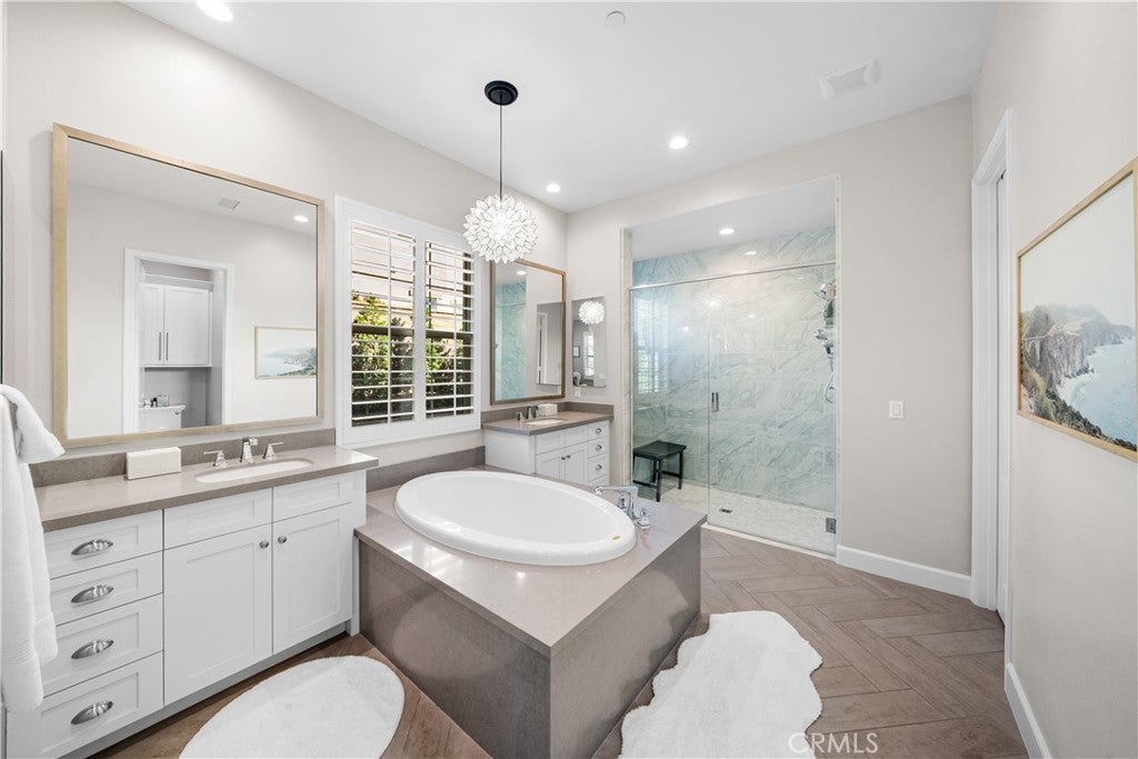 Welcome to 19 Arada in the Alondra 55+ community of RMV, where dreams do come true. Indulge yourself in this reimagined California casual sensation with harmonious blends of contemporary elegance and classic design offering the perfect balance of style, sophistication and comfort. Expansive windows, open concept living areas and premium finishes throughout create a seamless flow connecting the indoor and outdoor spaces. At the heart of the home is a gourmet kitchen, featuring top-of-the line stainless appliances with sleek Quartz counter tops and Carrera marble back splash. The luxurious primary suite is a true sanctuary with views of the freshly landscaped backyard, spa inspired bathroom with double sinks, soaking tub, walk-in shower and generous closet by California Closets, upstairs is a private bonus room with powder bath, and don't forget the downstairs office/den with custom cabinets and glass doors for privacy. The living experience extends to the outdoors with a California room detailed in stone, porcelain tile paving, fireplace and TV creating the perfect setting to host alfresco dinners or simply enjoy the outdoor entertainment with multiple water features, seating spaces, cozy fire pit and BBQ area where every detail has been carefully considered to create a serene escape from the everyday. In addition to the exquisite design, the homes modern amenities include 8" plank hardwood flooring, plantation shutters, custom window treatments, wood beamed ceilings, designer paint and carpet, wood siding in the bedrooms, wains coating in the entry hallway and crown molding all elevating the living experience. The home is equipped with solar panels and Tesla batteries providing efficiency and sustainability, while lowering your environmental footprint. The spacious 2 car garage and golf cart garage have epoxy flooring and custom floor to ceiling cabinets.
