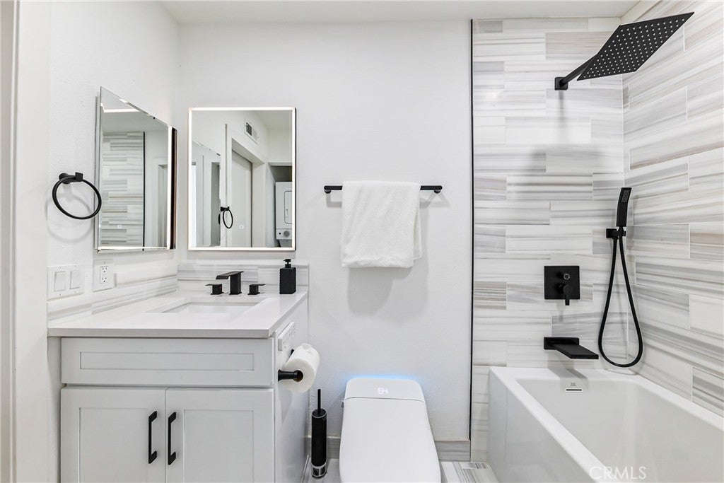 Gorgeous 2 bedroom home with vaulted ceilings. This home features a new custom kitchen with Built-in China cabinet beveled glass and two built-in pantries with custom marble counters. New Stainless Steel LG appliance's included in sale. Gas range, refrigerator and dishwasher. Beautiful Custom Marble counters and cabinets in bath & main suite. All new plumbing fixtures. Large deep custom tub with rain shower. Lighted mirrors with WIFI. Mirror wardrobe, large walk-in closet with built-ins. Washer/Dryer included in sale. Recessed lighting in all rooms with dimers. Waterproof laminate flooring. This pristine condo offers privacy, convenience, and true turnkey living. Completely remodeled throughout, New outside decking just completed. Central heating & air-conditioning. New thermostat. Freshly painted with all new door hardware. This is a true modern upgraded home to enjoy and entertain your guests. A safe and Guard gated community. Freestanding Electric Fire Place included. Within 1 minute walking distance of the pool & jacuzzi. Knott's berry Farm, and several entertainment and restaurant's facilities close by. Easy and close commute to 405/22 freeways, many restaurants & entertainment close by. Close to the pool and other amenities. One covered assigned parking space with plenty of guest parking spaces. This home is Pride of Ownership.