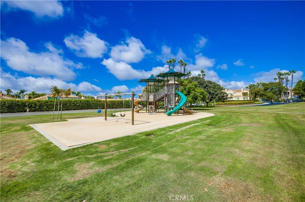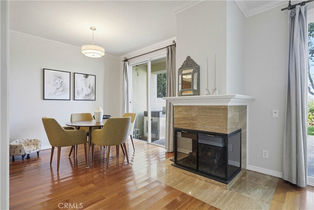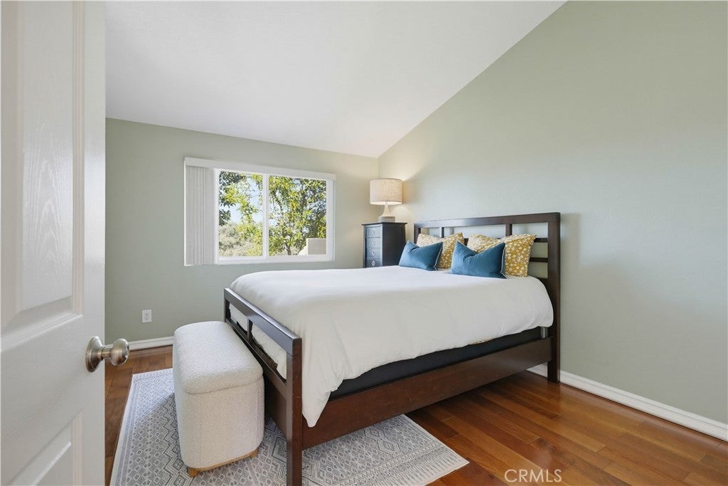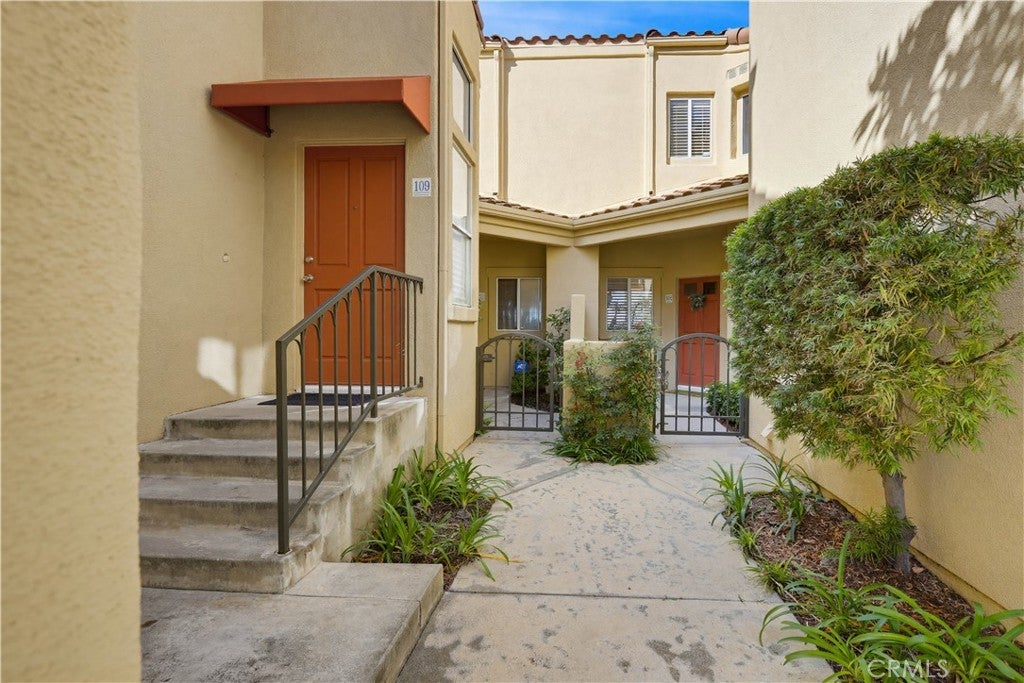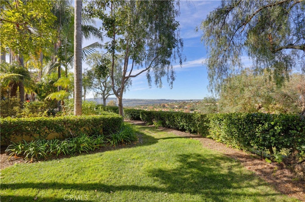 Beautifully updated end-unit home ideally situated on a lush greenbelt with sweeping sunset and rolling hill views. Set on one of the largest and most desirable lots in the Encore at Marina Hills community, this light-filled residence offers privacy, space, and an exceptional backyard oasis. An arched walkway and gated front courtyard welcome you inside to gorgeous hardwood floors throughout and crown molding. The open floor plan features a spacious living area with sit-down views and a stunning three-sided gas fireplace shared with the dining area. Two sets of sliding glass doors create seamless indoor-outdoor living. The kitchen boasts rich hardwood cabinetry, granite countertops, glass tile backsplash, recessed lighting, and stainless-steel appliances, opening perfectly to the dining area for easy entertaining. The main level includes a powder room and a laundry room. Upstairs, the freshly painted primary suite features vaulted ceilings, dual vanities, a shower/tub enclosure with bench, and a large private balcony ideal for enjoying sunsets and ocean breezes. The freshly painted secondary bedroom offers vaulted ceilings, updated dual-pane windows, and beautiful views. The expansive backyard is perched above a peaceful greenbelt and showcases a sandstone patio, built-in BBQ and bar, grassy lawn, vibrant rose bushes, and lush tropical landscaping with mature trees—perfect for relaxing or entertaining. Additional highlights include a direct-access two-car garage with built-in storage, refrigerator, washer, and dryer included, and HOA coverage for water. Encore amenities include a pool and spa, picnic areas, and close proximity to parks, trails, shopping, dining, beaches, and easy freeway and toll road access. Tenants to enjoy resort like Marina Hills Park amenities as well, including pool, clubhouse, tennis courts, playgrounds, sport courts and playing fields.