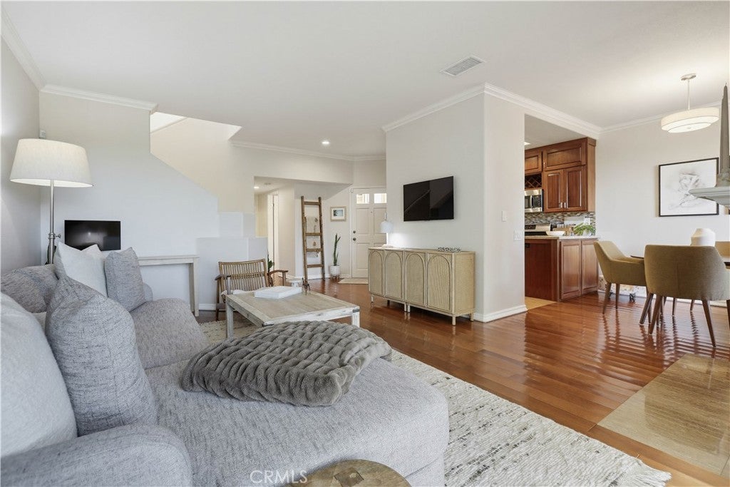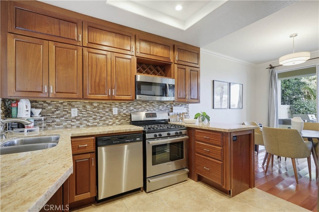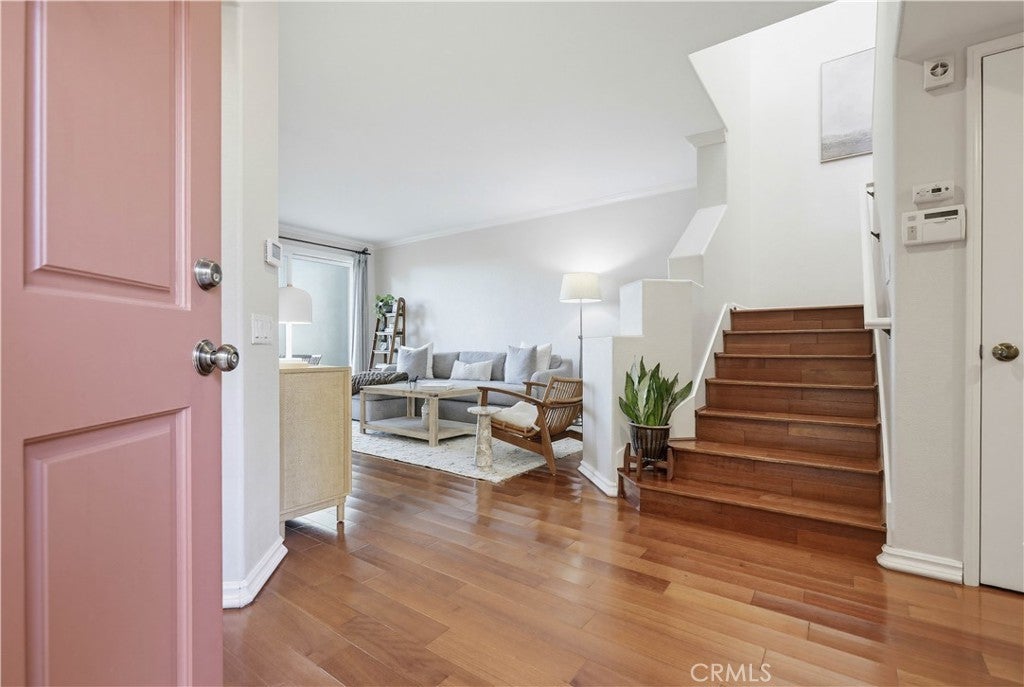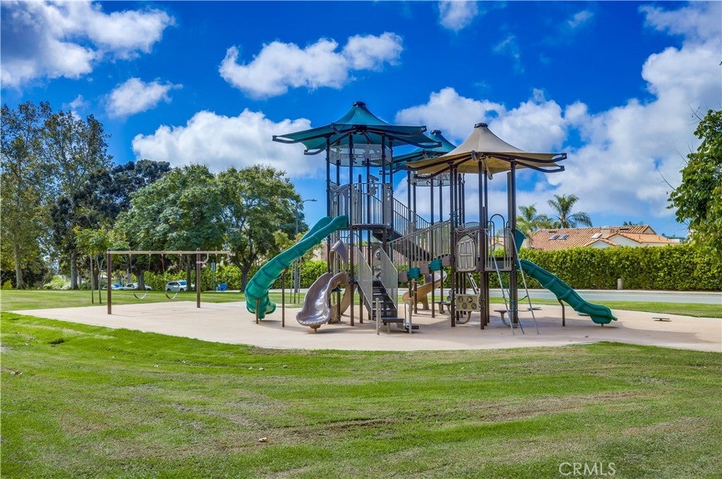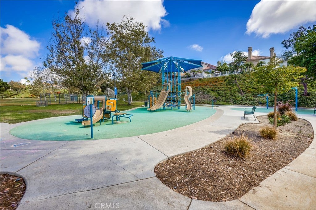 Beautifully updated end-unit home ideally situated on a lush greenbelt with sweeping sunset and rolling hill views. Set on one of the largest and most desirable lots in the Encore at Marina Hills community, this light-filled residence offers privacy, space, and an exceptional backyard oasis. An arched walkway and gated front courtyard welcome you inside to gorgeous hardwood floors throughout and crown molding. The open floor plan features a spacious living area with sit-down views and a stunning three-sided gas fireplace shared with the dining area. Two sets of sliding glass doors create seamless indoor-outdoor living. The kitchen boasts rich hardwood cabinetry, granite countertops, glass tile backsplash, recessed lighting, and stainless-steel appliances, opening perfectly to the dining area for easy entertaining. The main level includes a powder room and a laundry room. Upstairs, the freshly painted primary suite features vaulted ceilings, dual vanities, a shower/tub enclosure with bench, and a large private balcony ideal for enjoying sunsets and ocean breezes. The freshly painted secondary bedroom offers vaulted ceilings, updated dual-pane windows, and beautiful views. The expansive backyard is perched above a peaceful greenbelt and showcases a sandstone patio, built-in BBQ and bar, grassy lawn, vibrant rose bushes, and lush tropical landscaping with mature trees—perfect for relaxing or entertaining. Additional highlights include a direct-access two-car garage with built-in storage, refrigerator, washer, and dryer included, and HOA coverage for water. Encore amenities include a pool and spa, picnic areas, and close proximity to parks, trails, shopping, dining, beaches, and easy freeway and toll road access. Tenants to enjoy resort like Marina Hills Park amenities as well, including pool, clubhouse, tennis courts, playgrounds, sport courts and playing fields.