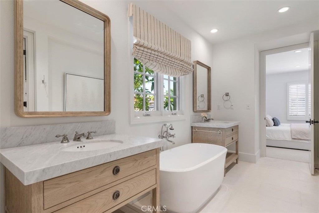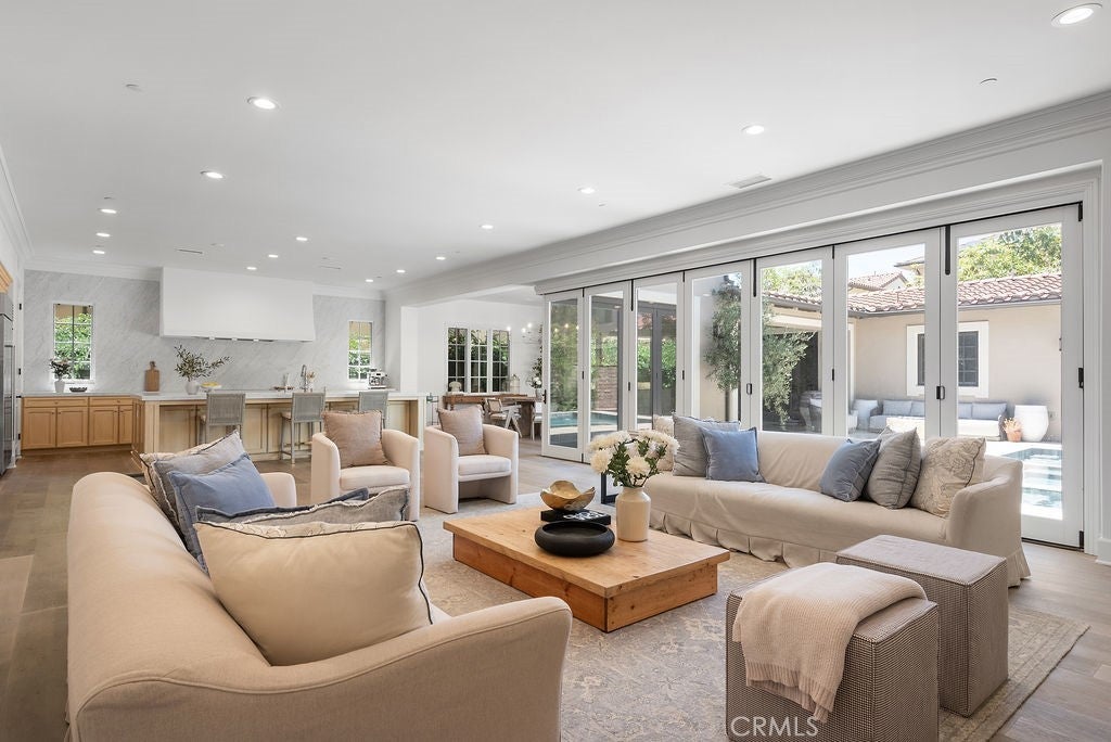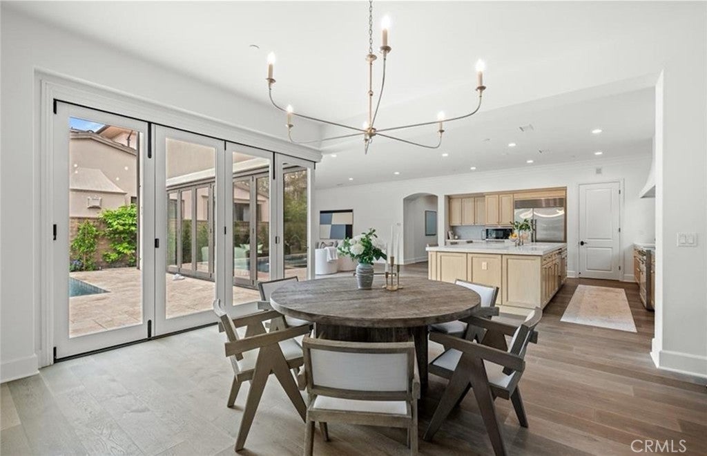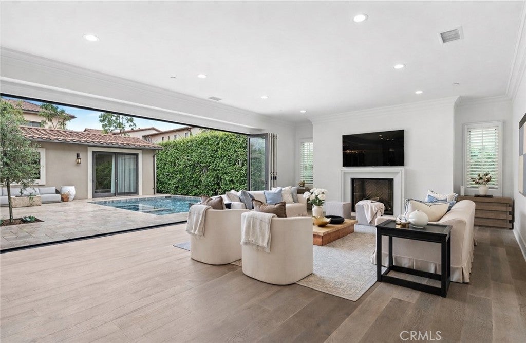 Perched on a premium ridge-view lot within the 24-hour guard-gated Orchard Hills, this contemporary French Provence estate offers modern luxury, exceptional flow, and resort-style living. The 4,674 sq ft residence features an open, light-filled floorplan with wide-plank oak flooring, soaring ceilings, and expansive bifold doors creating seamless indoor–outdoor flow. The fully redesigned Italian-marble kitchen is anchored by an oversized island and a custom AGA range beneath a full-height marble feature wall and sleek 72-inch custom hood. The primary suite includes a spa-inspired marble bath with soaking tub, European stone shower, and custom California Closet system. Four additional bedrooms each feature newly renovated marble-finished bathrooms. Flexible living spaces include a private guest casita with kitchenette, home office, gym, and spacious laundry room. The resort-style backyard offers a brand-new heated saltwater pool and spa with artisan stone finishes and ambient lighting. Residents enjoy Orchard Hills amenities including pools, parks, sports courts, hiking trails, and access to the award-winning schools.