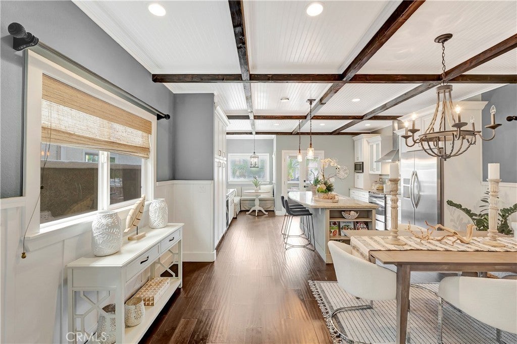 Only five blocks from the sand and moments from downtown, this standout Huntington Beach home offers a refined take on coastal living. Spanning approximately 2,700 square feet, it combines refined design, custom craftsmanship, and effortless livability in one beautifully curated package. Inside, natural light and elegant upgrades define the open-concept layout. The main level features a welcoming living room with a cozy fireplace and access to a private side yard, a half bath, and a convenient laundry room with sink that connects directly to the two-car garage. The chef-inspired kitchen is a true centerpiece, showcasing custom ceiling with wood beams, shaker cabinets, a spacious center island with bar seating, a built-in breakfast nook, and premium stainless steel appliances. The space flows easily into the formal dining area and out to a private front patio complete with a firepit, perfect for relaxed evenings and ocean breezes complete with a gas line to easily add a built-in BBQ center. Upstairs, the primary suite offers a tranquil escape with a double-sided fireplace, a generous walk-in closet, balcony, and a spa-caliber bathroom with dual vanities, a soaking tub, and a walk-in shower. Two additional bedrooms and bathrooms are thoughtfully positioned nearby, while a bonus room with soaring ceilings and a fireplace creates the perfect spot for a media room, lounge, or home office. A versatile loft on the upper level opens to the rooftop deck, where panoramic views set the stage for unforgettable entertaining or quiet sunset moments. With three fireplaces, stylish hard-surface flooring, custom paint, new tankless water heater, outdoor shower on side patio and designer touches throughout, this home exudes warmth and sophistication. Blending the ease of indoor-outdoor living with the unbeatable proximity to the ocean, dog beach, and downtown’s premier shopping and dining, it represents the best of Huntington Beach coastal luxury all in an award winning school district!