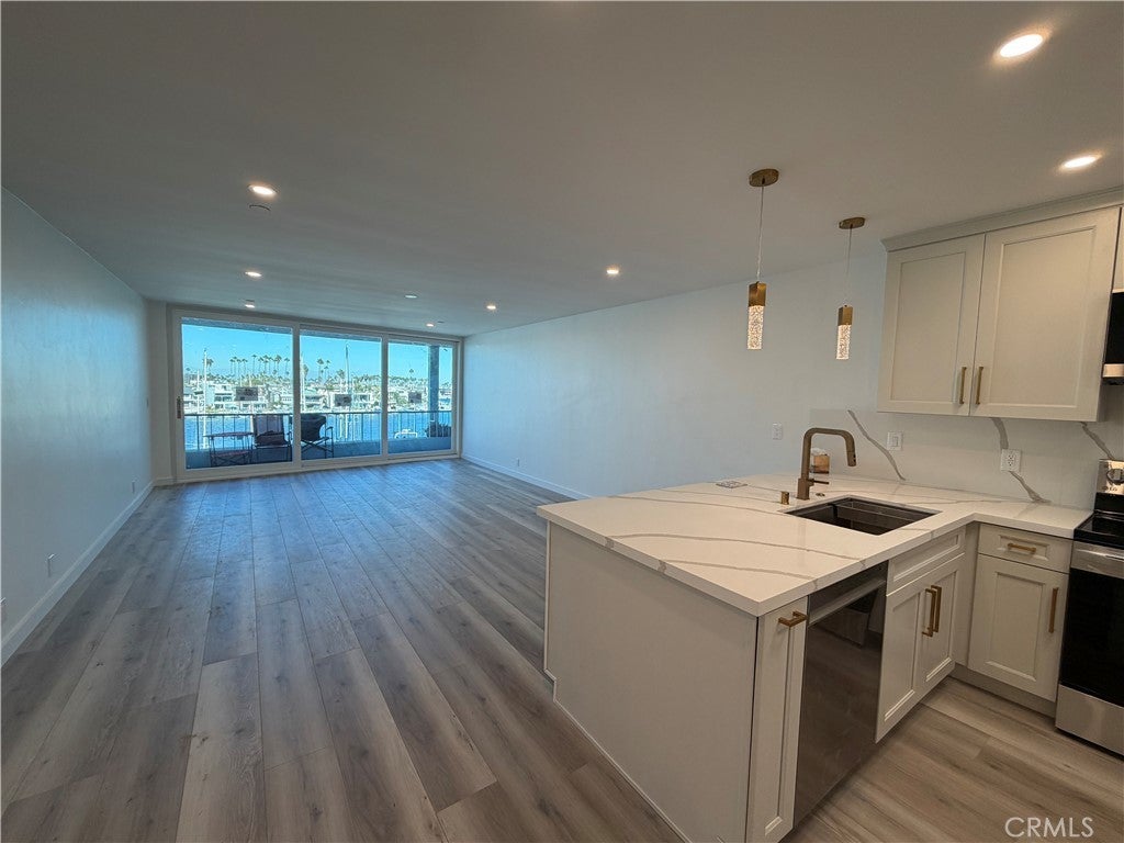 ALAMITOS BAY PENINSULA | TOP-FLOOR WATERFRONT DESIGNER HOME with a touch of elegance.. Experience elevated coastal living in this fully remodeled, top-floor waterfront condominium located in the coveted Bay Yacht Club on the Long Beach Peninsula. This stunning 1-bedroom, 1-bath residence offers approximately 815 sq ft of beautifully designed living space with rare dual views from both sides of the peninsula. Enjoy sweeping marina and Alamitos Bay views from the living room and kitchen, while the bedroom captures city lights and ocean views, creating a magical day-to-night backdrop. Natural light, sea breezes, and water views define this exceptional home. The interior showcases a complete, high-end renovation, featuring brand-new laminate flooring throughout and fresh designer paint. The all-new kitchen is a true showpiece with white cabinetry, white quartz countertops, brand-new appliances, and brushed-gold accent faucets, lighting, and cabinet hardware, offering a clean, modern, and timeless aesthetic. The spa-inspired bathroom has been fully reimagined with new tile, a custom white vanity, coordinating finishes, brushed-gold fixtures and hardware, and an elegant framed mirror. One secured parking space with overhead storage in first-floor garage Secure 16-unit building with elevator access On-site laundry facilities Pet-friendly (under 30 lbs) Located steps from the beach and within walking distance to Alamitos Bay Yacht Club, Belmont Shore's 2nd Street shops and restaurants, waterfront walking paths, summer concerts, and movies on the sand. Enjoy front-row views of the Big Bang on the Bay July 3rd Fireworks and the Annual Christmas Boat Parade, all from the comfort of your living room. Don't miss out on this rare opportunity to live in this Prestigious part of town, in a Brand new Updated Turnkey ocean View Home, offering Serenity, Views and Ultimate Southern California Lifestyle Living..
